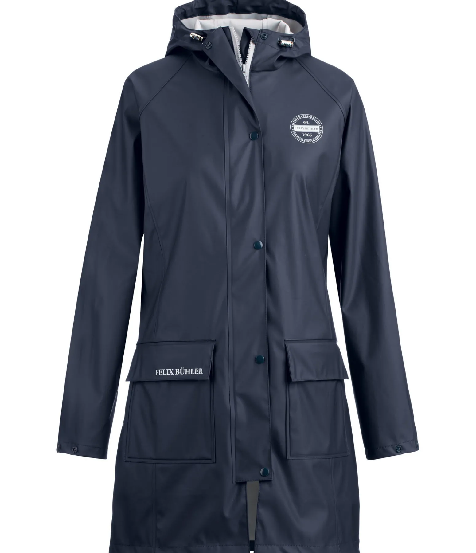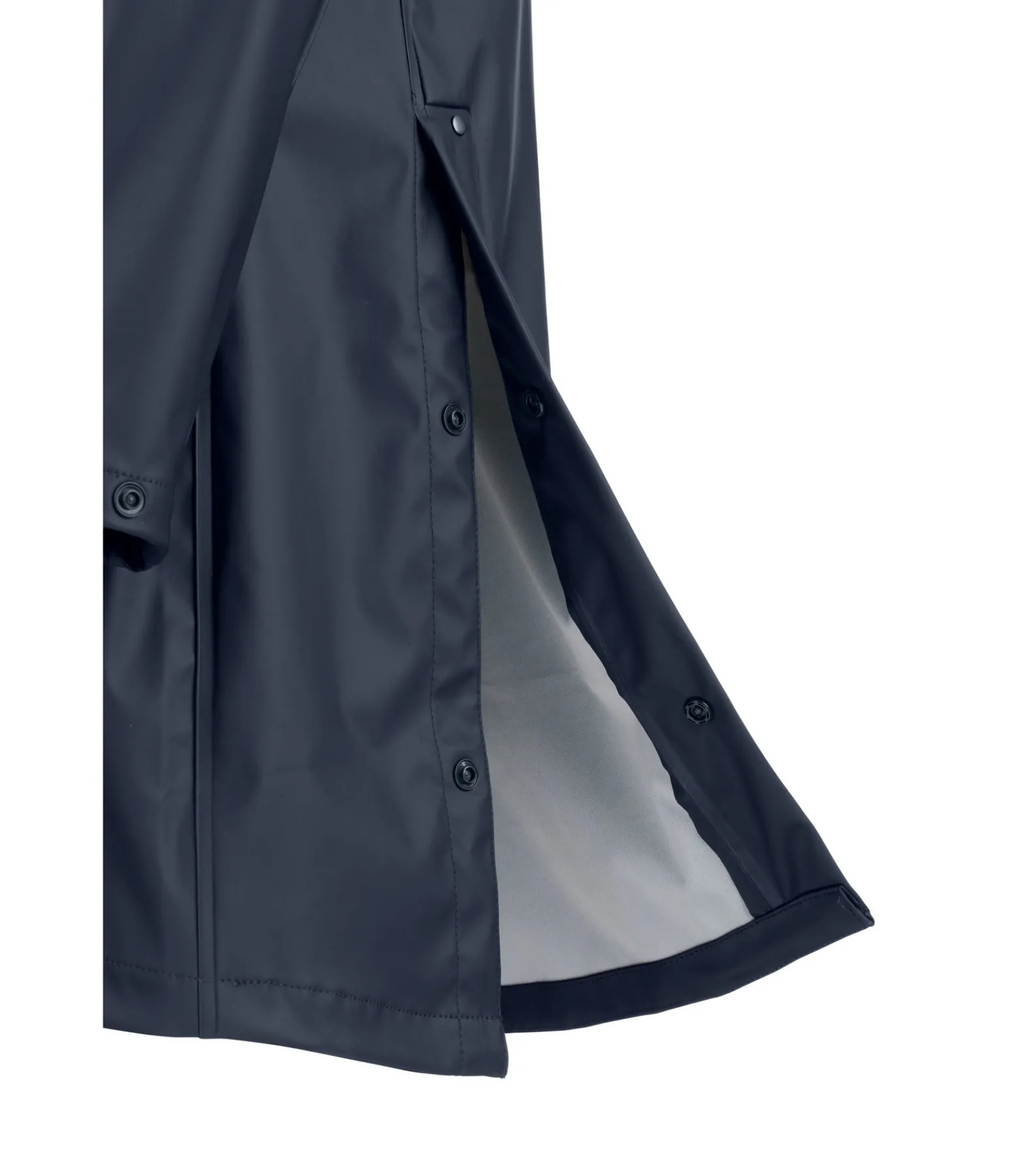 Imperméable (5.000 mm) et coupe-vent d’équitation long. Intérieur de couleur contrastante. Fermeture à glissière double sens dissimulée avec protège-menton. 2 fentes cavalières avec boutons-pression dans le dos. 2 poches à rabat. Capuche et bas des manches réglables. Imprimés réfléchissants à l’avant et l’arrière. 100 % polyuréthane.