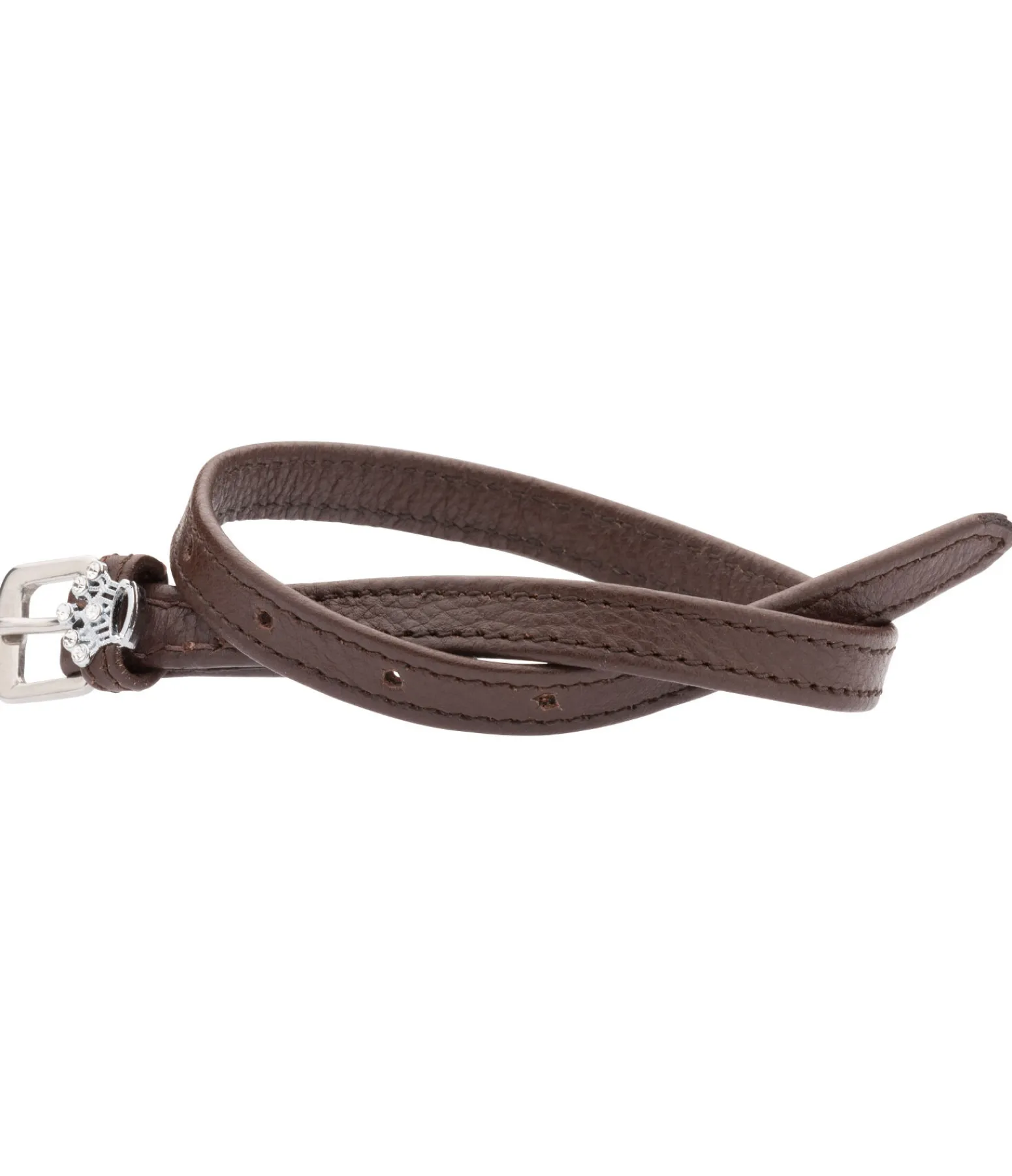 En cuir, avec boucles argentées et couronnes décoratives. La paire.
