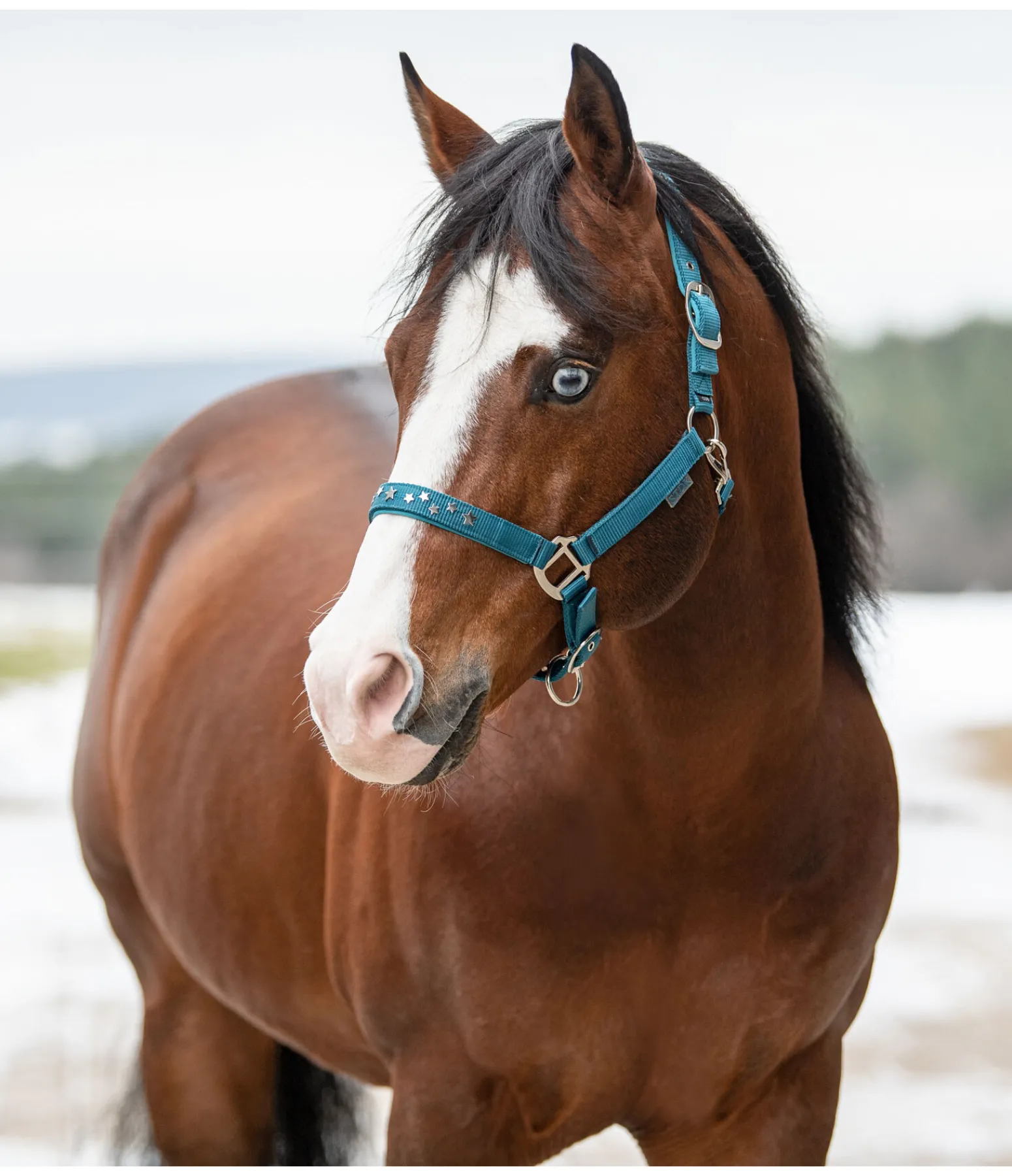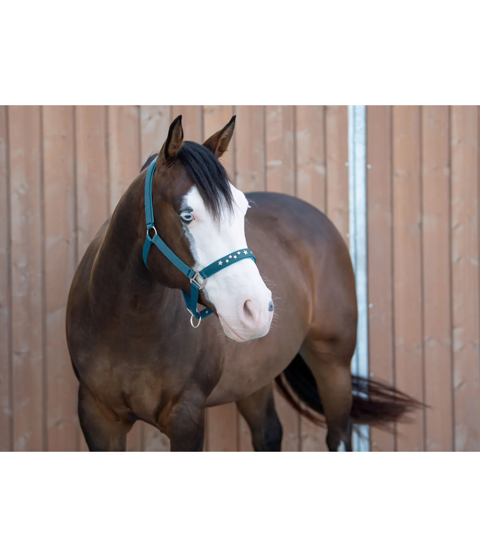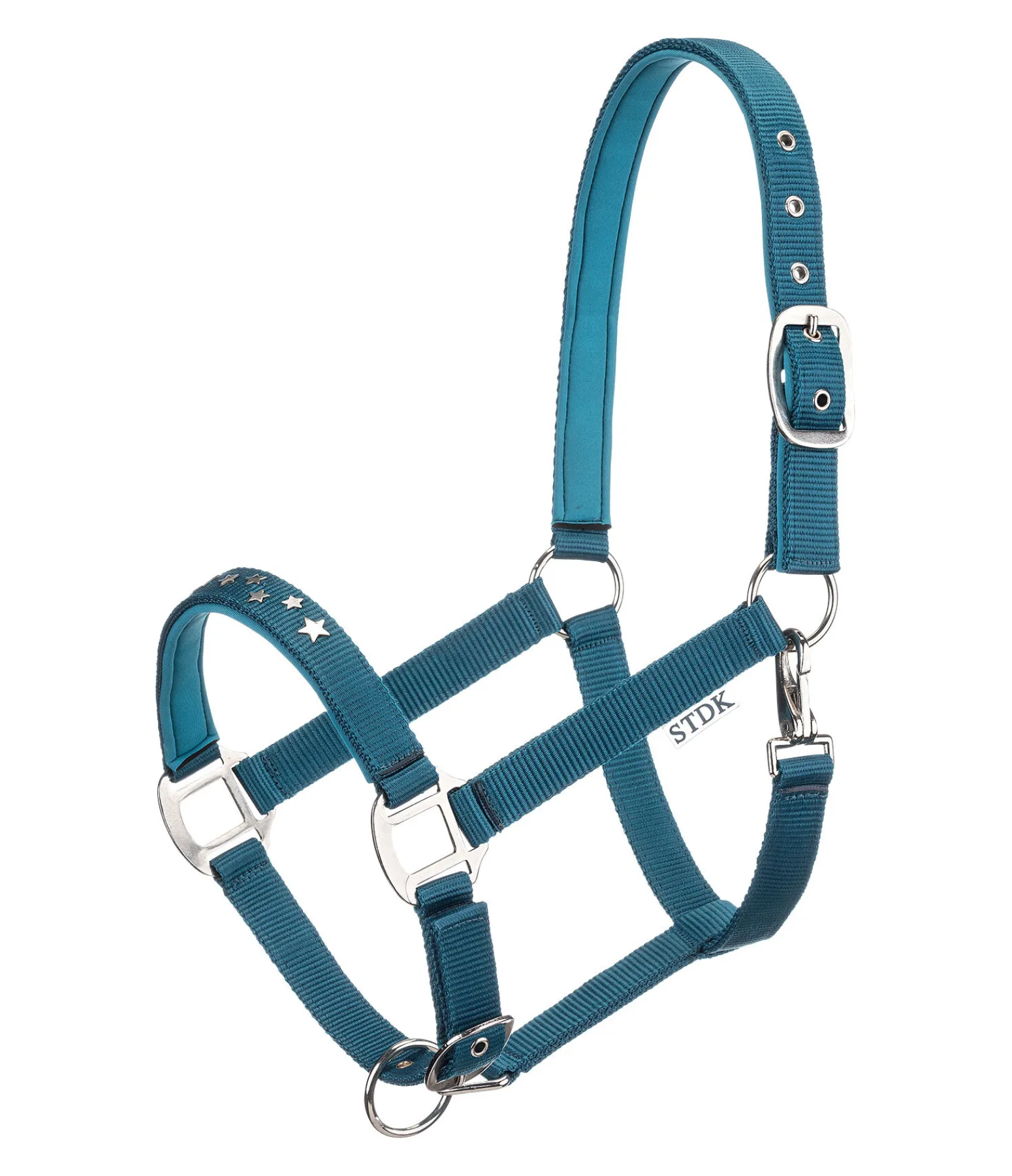 Licol orné de petites étoiles en métal sur la muserolle. Doublure douce en caoutchouc chloroprène sur la têtière et la muserolle. Têtière et muserolle réglables.