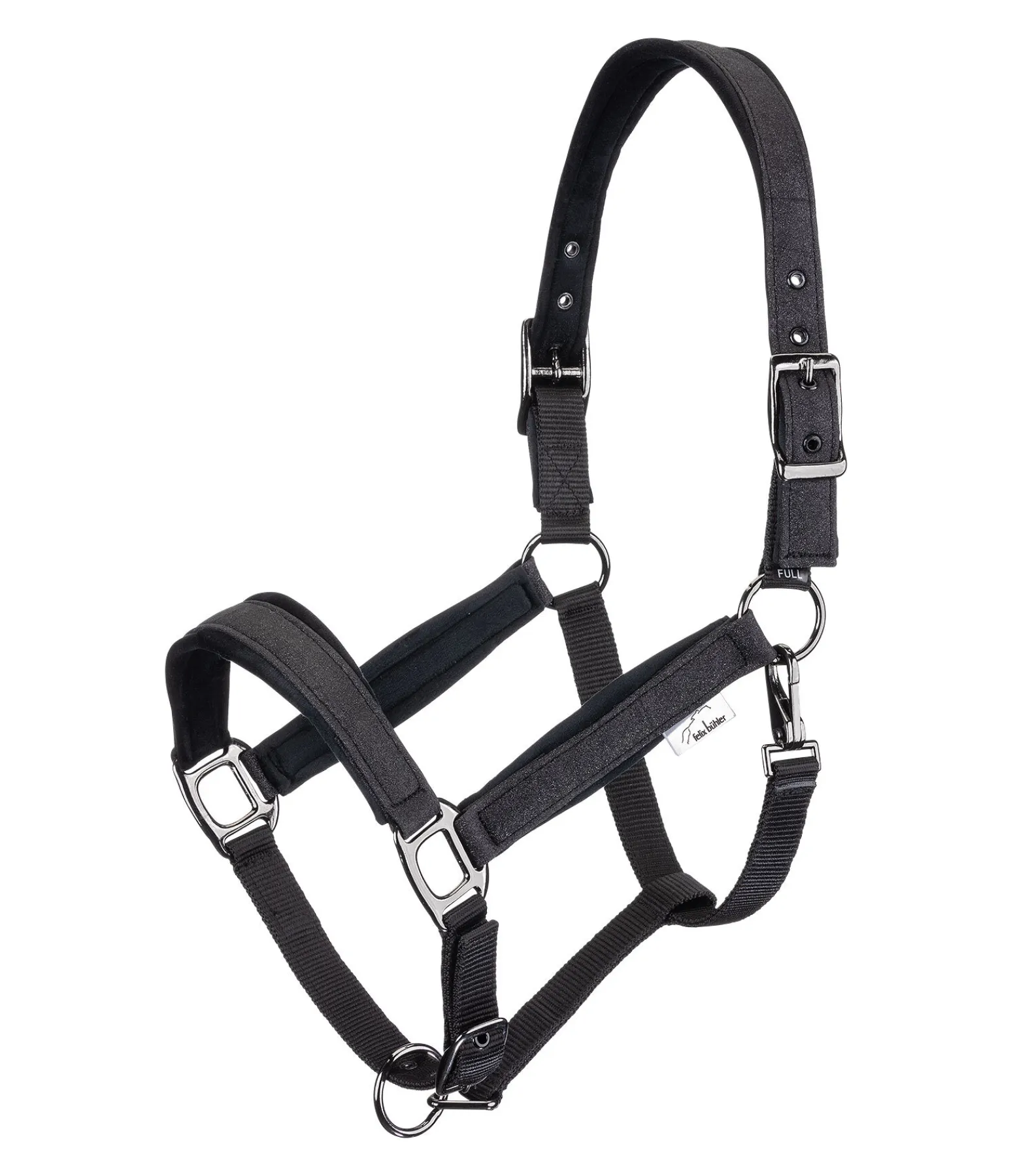 Licol pailleté. Doublure douce effet velours au niveau de la têtière, de la muserolle et des montants. Têtière réglable sur chaque côté. Muserolle réglable. Bouclerie de couleur assortie. 100 % polypropylène.