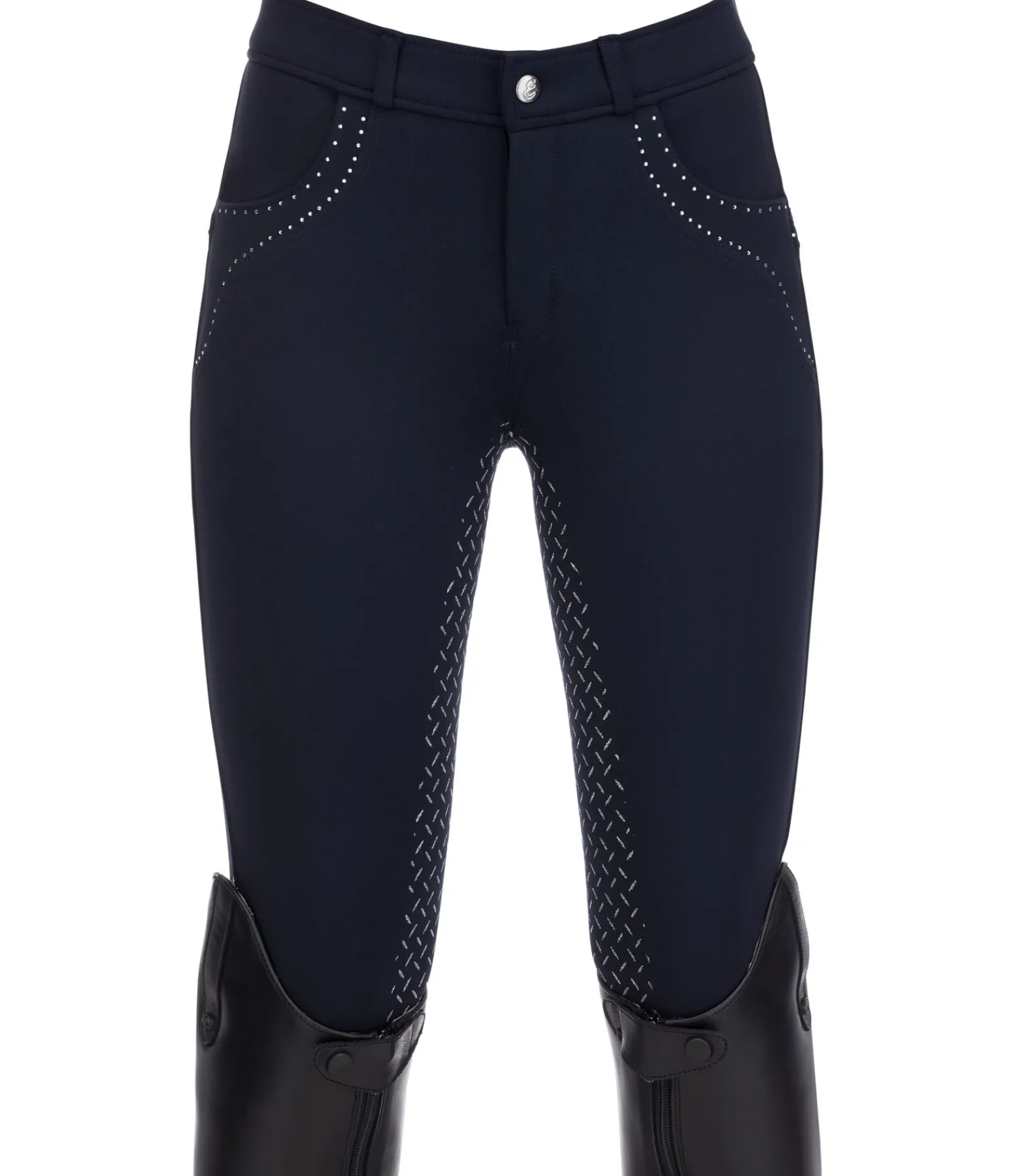 Pantalon d’équitation. Fond intégral grip en silicone scintillant. Matière stretch respirante, extensible dans 4 directions et ultra confortable. Strass sur les poches avant. Bas de jambe extensible sans patte auto-agrippante. 68 % viscose, 27 % polyamide, 5 % élasthanne.