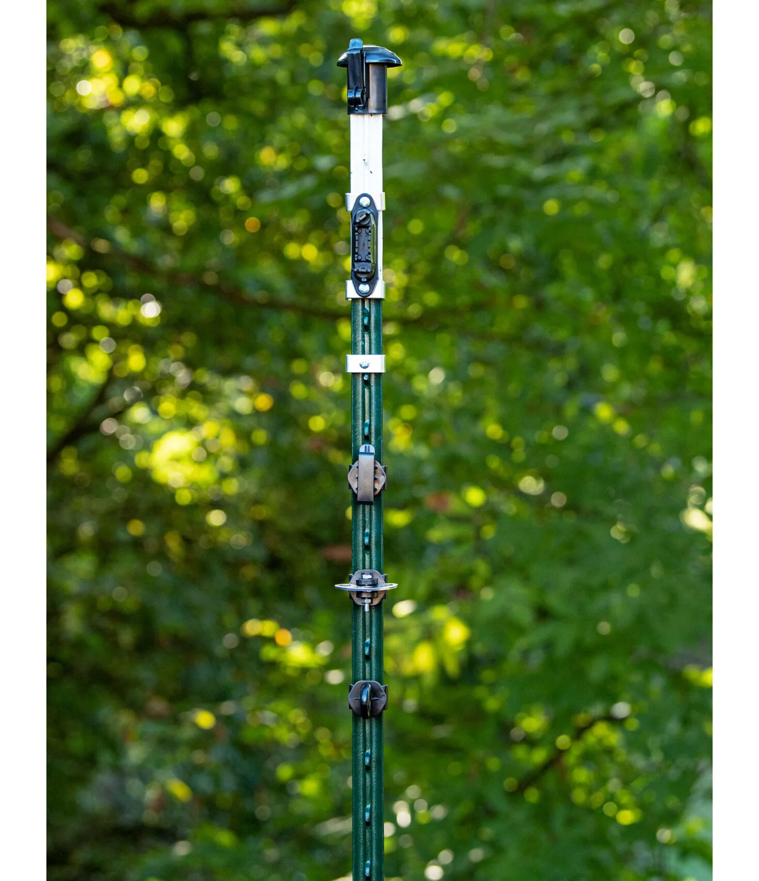 Piquet métal en acier robuste, verni vert-blanc, avec base solide. Pointe env. 40 cm. Hauteur totale 182 cm. Vendu à l’unité.