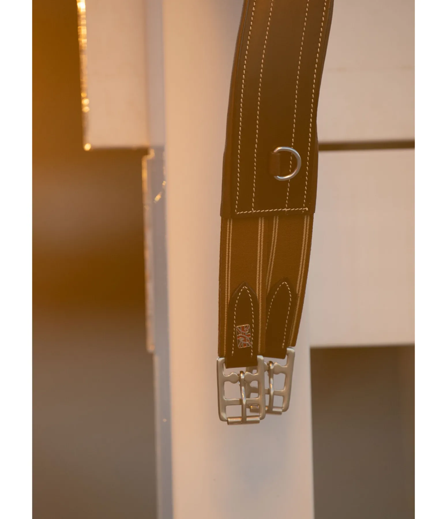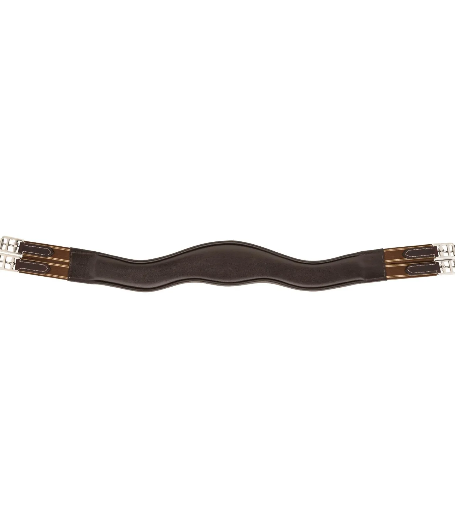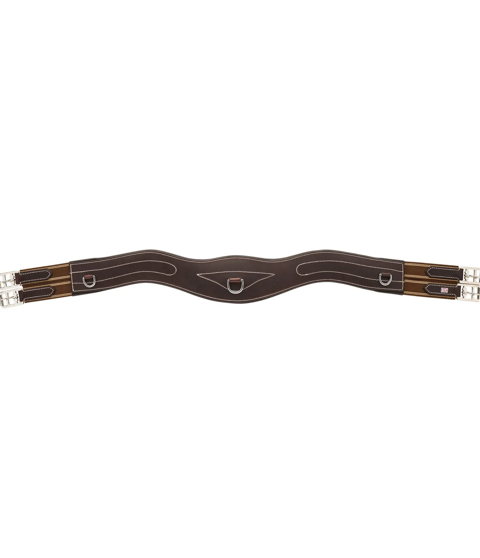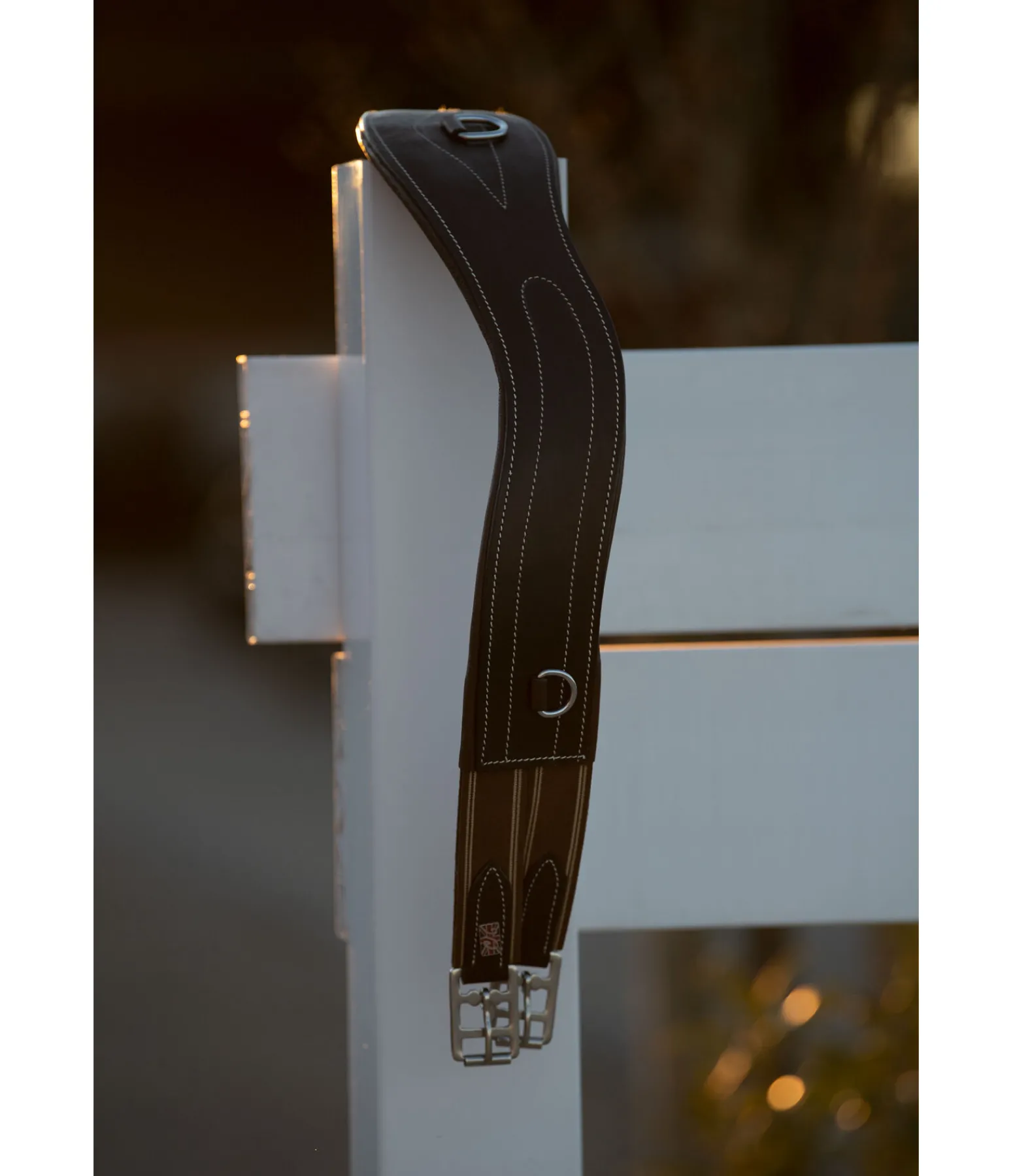 Sangle en cuir anatomique avec rembourrage doux, trois anneaux en D, empiècements élastiques des deux côtés et boucles à rouleau. Largeur 11 cm.