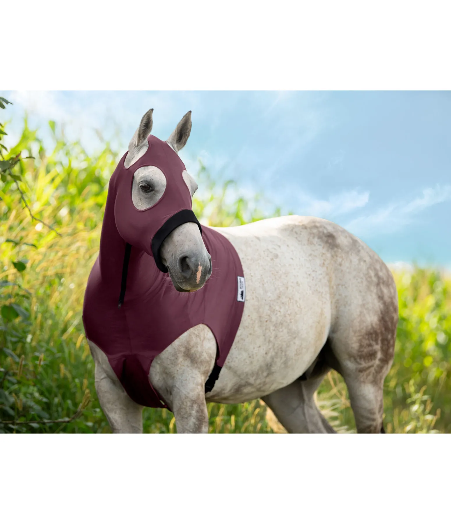 Sleazy pratique en matière extensible. Protège les crins et la robe de la saleté, par exemple avant un concours. Fixation derrière les antérieurs grâce à une fermeture à clip. La fermeture à glissière le long de l’encolure facilite la mise en place et le retrait. 85 % polyester, 15 % lycra.