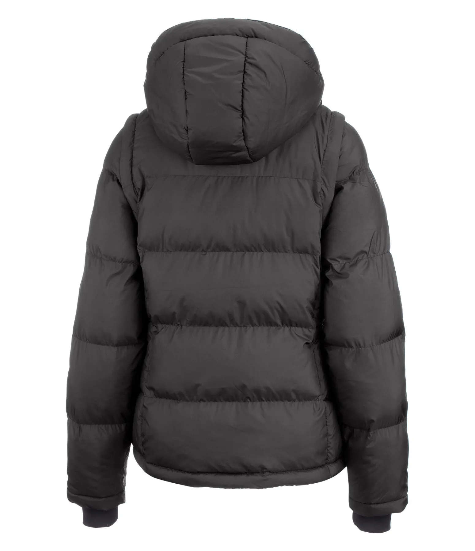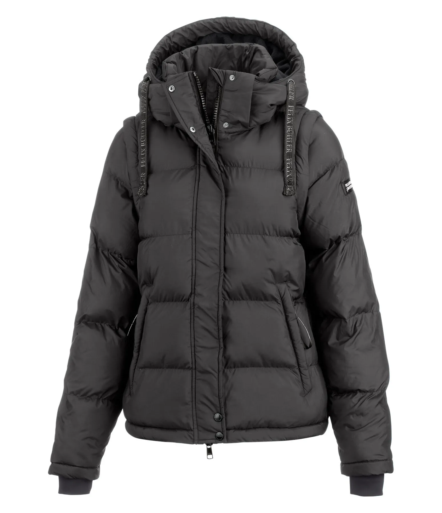 Une veste et un gilet en une seule pièce ! Veste d’équitation chaude avec manches amovibles zippées. Garnissage doux imitation duvet. Col montant. Capuche doublée en polaire, amovible et ajustable par cordon de serrage. Bouton-pression pour fixer la capuche dans le dos. Fermeture à glissière double sens dissimulée. 2 poches avant doublées en polaire, zippées et dissimulées. Badge Felix Bühler sur le bras. Finition en bord-côte sur le bas des manches. Taille ajustable par cordon de serrage. 100 % polyester.