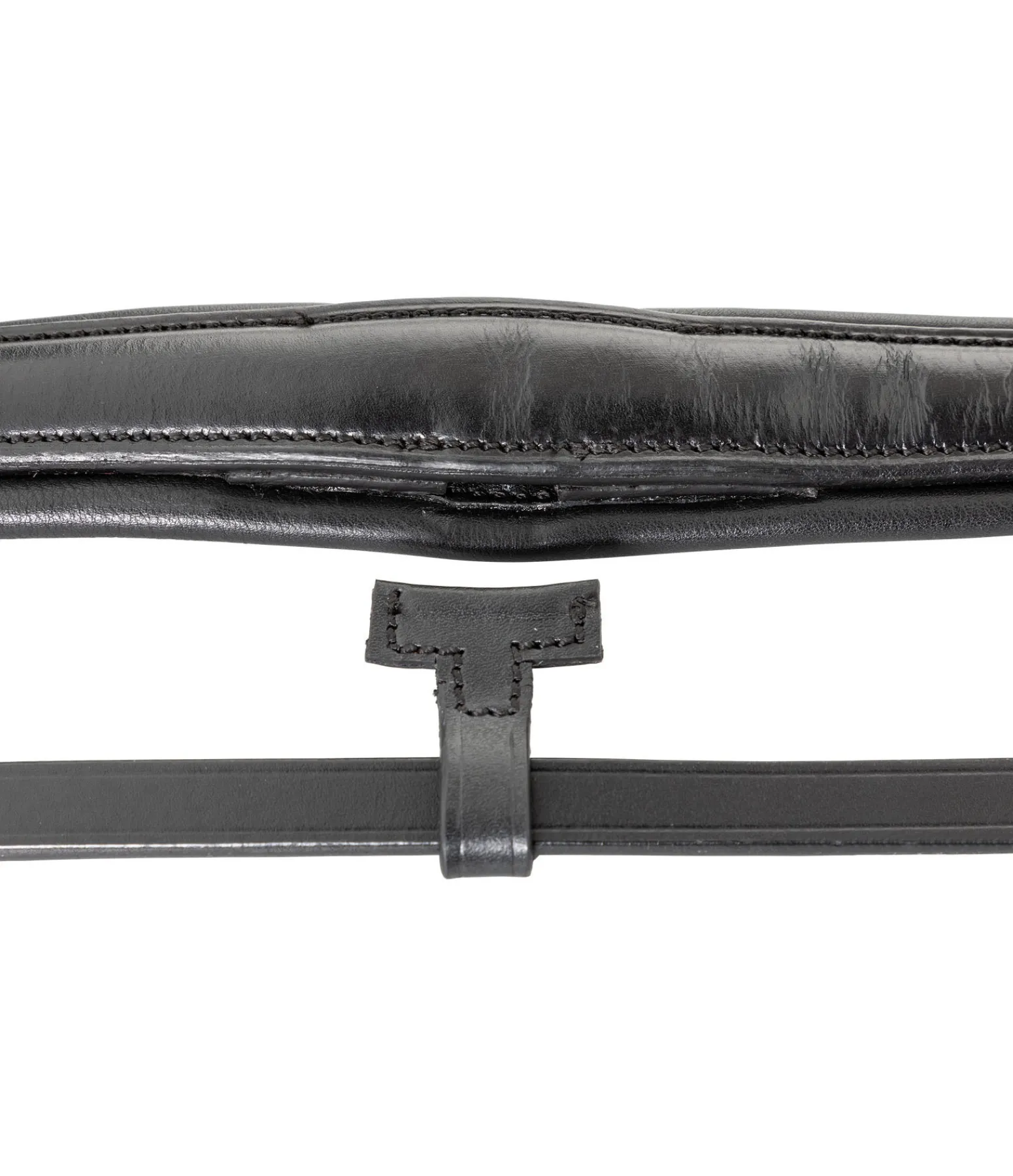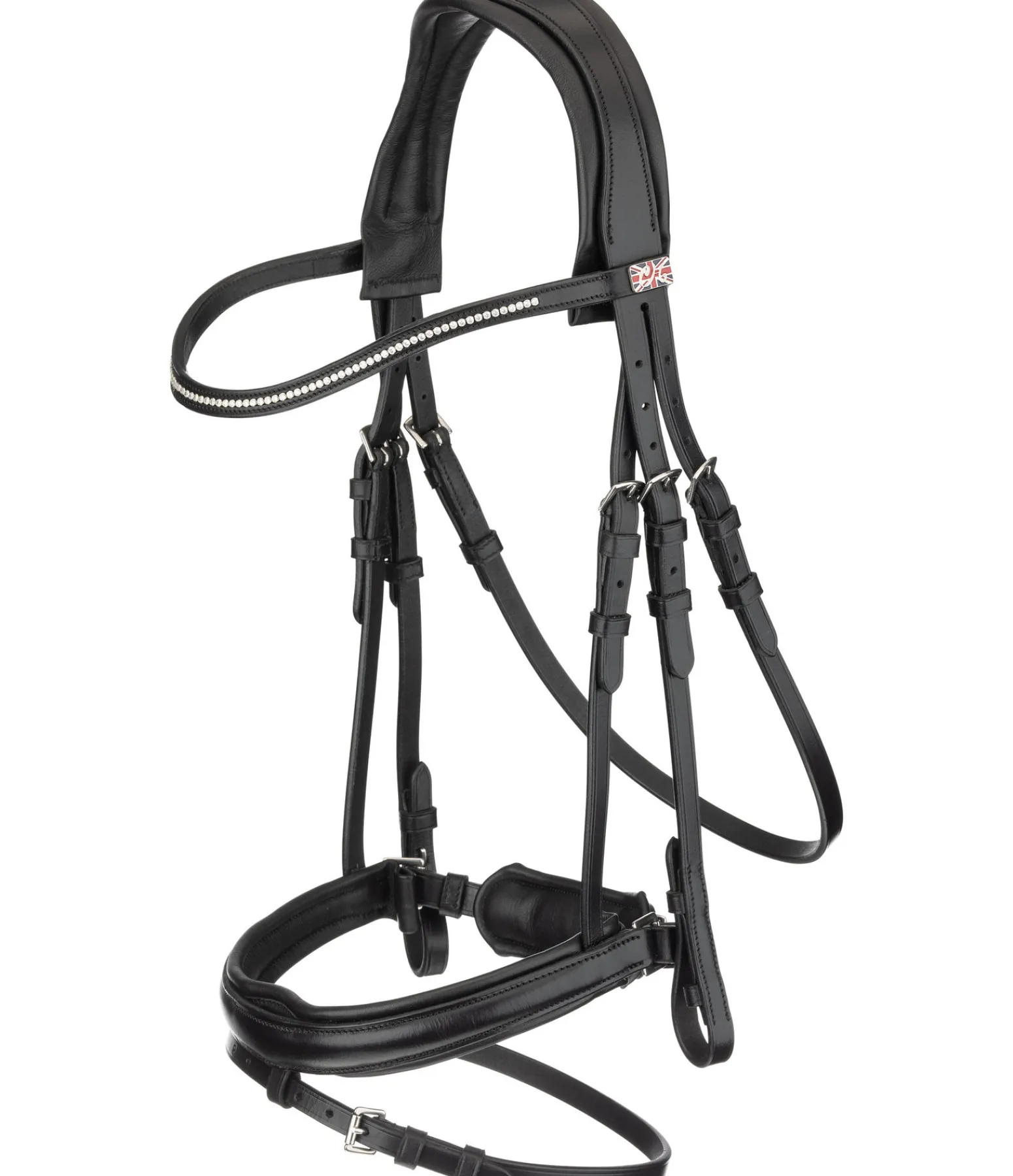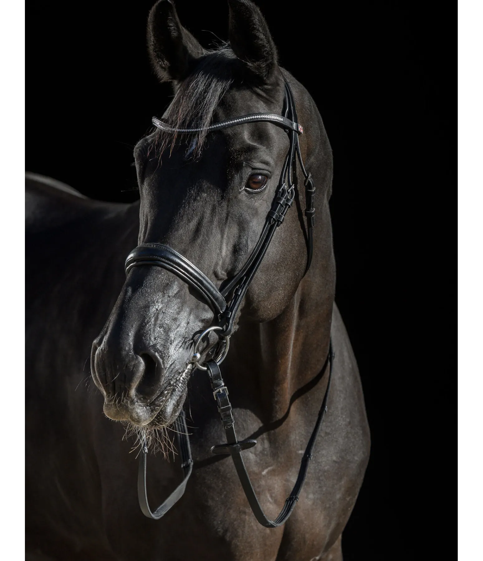 Bridon de grande qualité avec muserolle suédoise et noseband. La lanière en forme de T permettant de fixer le noseband peut être enlevée lorsqu’elle ne sert pas. Cela permet de ne pas laisser une boucle de cuir disgracieuse lorsque le noseband n’est pas fixé à la muserolle. Frontal vague orné de strass blancs discrets. Têtière anatomique avec découpe aux oreilles et frontal avec rembourrage supplémentaire, parfait pour les chevaux sensibles. Fermetures à crochets. Bouclerie argentée. Avec rênes sangle, sans mors.