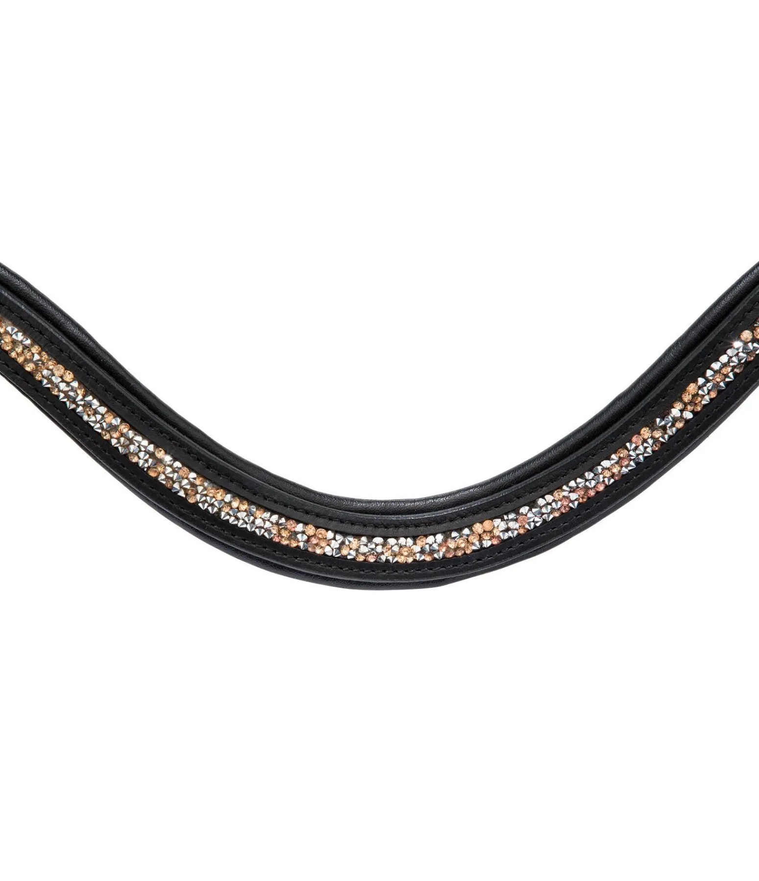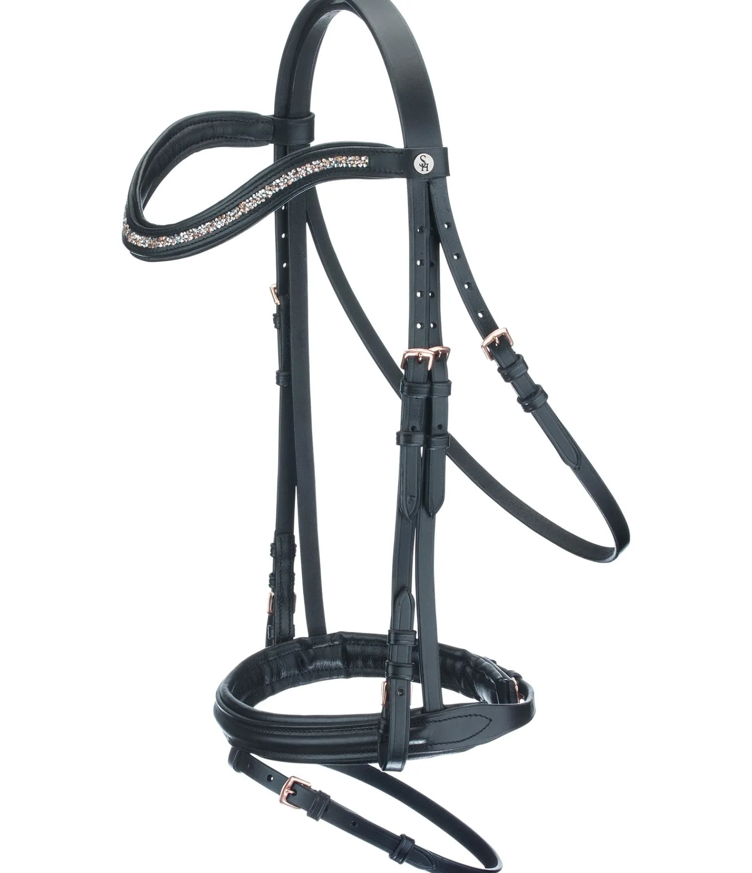 Bridon exceptionnel avec muserolle française combinée et frontal vague scintillant avec pierres scintillantes argentées et rose-doré. Frontal et muserolle avec doublure douce en cuir. Bouclerie rose doré. Avec rênes sangle, sans mors.