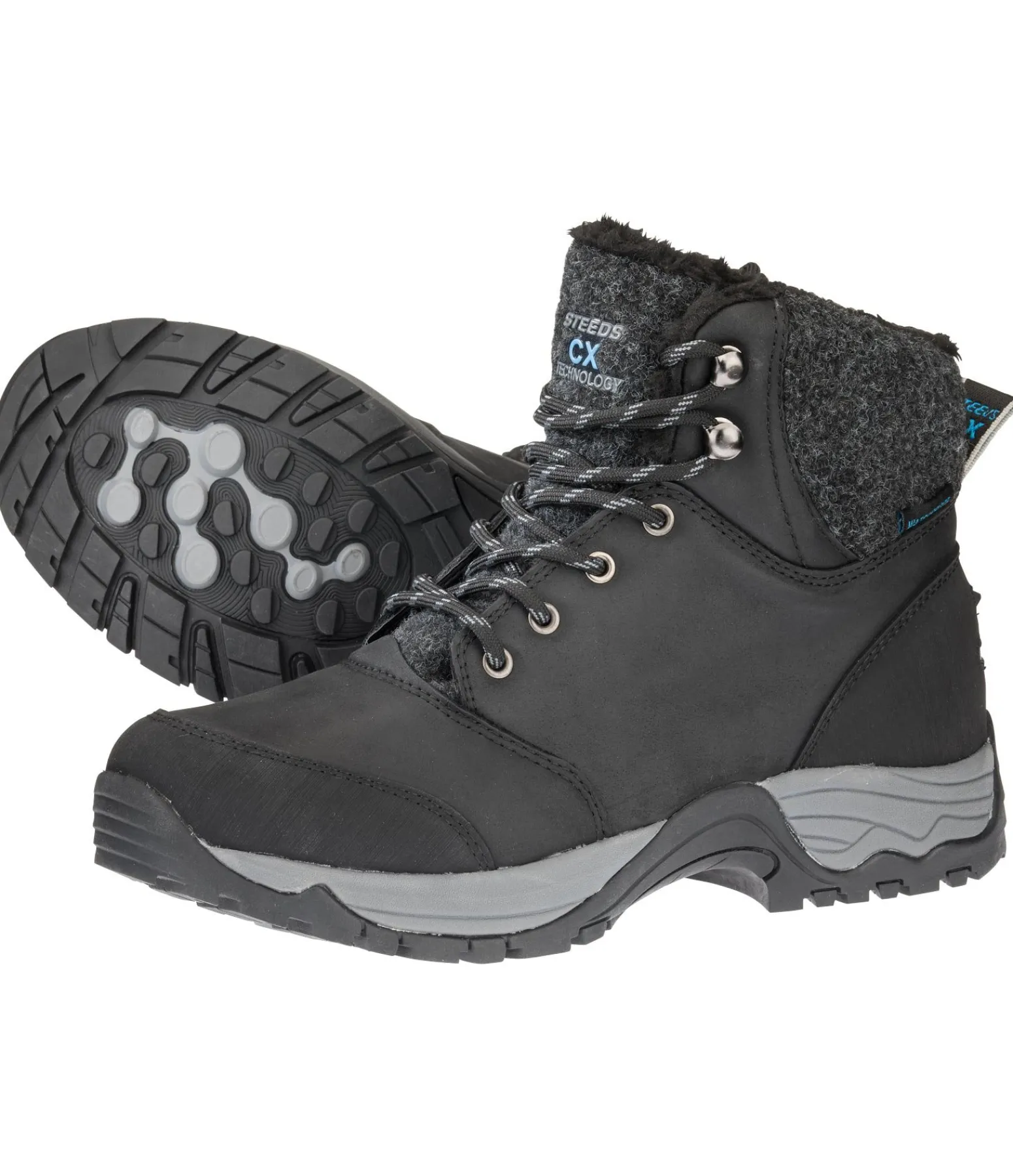 Chaussures d’hiver imperméables en cuir vachette gras pleine fleur de qualité exceptionnelle avec doublure intérieure en polaire Teddy (100 % polyester) conservant la chaleur. La membrane imperméable et la languette cousue empêchent la neige et l’eau de pénétrer dans la chaussure. La semelle intérieure CX Technology possède les meilleures propriétés d’amortissement et assure un confort maximal dans la durée pendant la pratique de l’équitation et la marche. Détails supplémentaires tels que le renfort au talon et aux orteils, le rembourrage doux en polaire aux chevilles, le laçage rapide avec crochets, le taquet d’éperon et la bande réfléchissante à l’arrière.