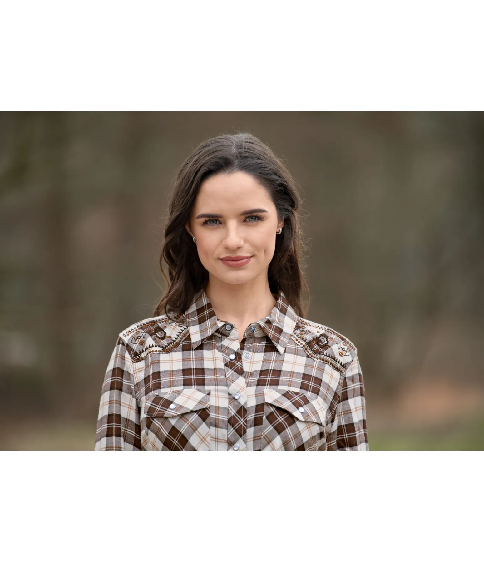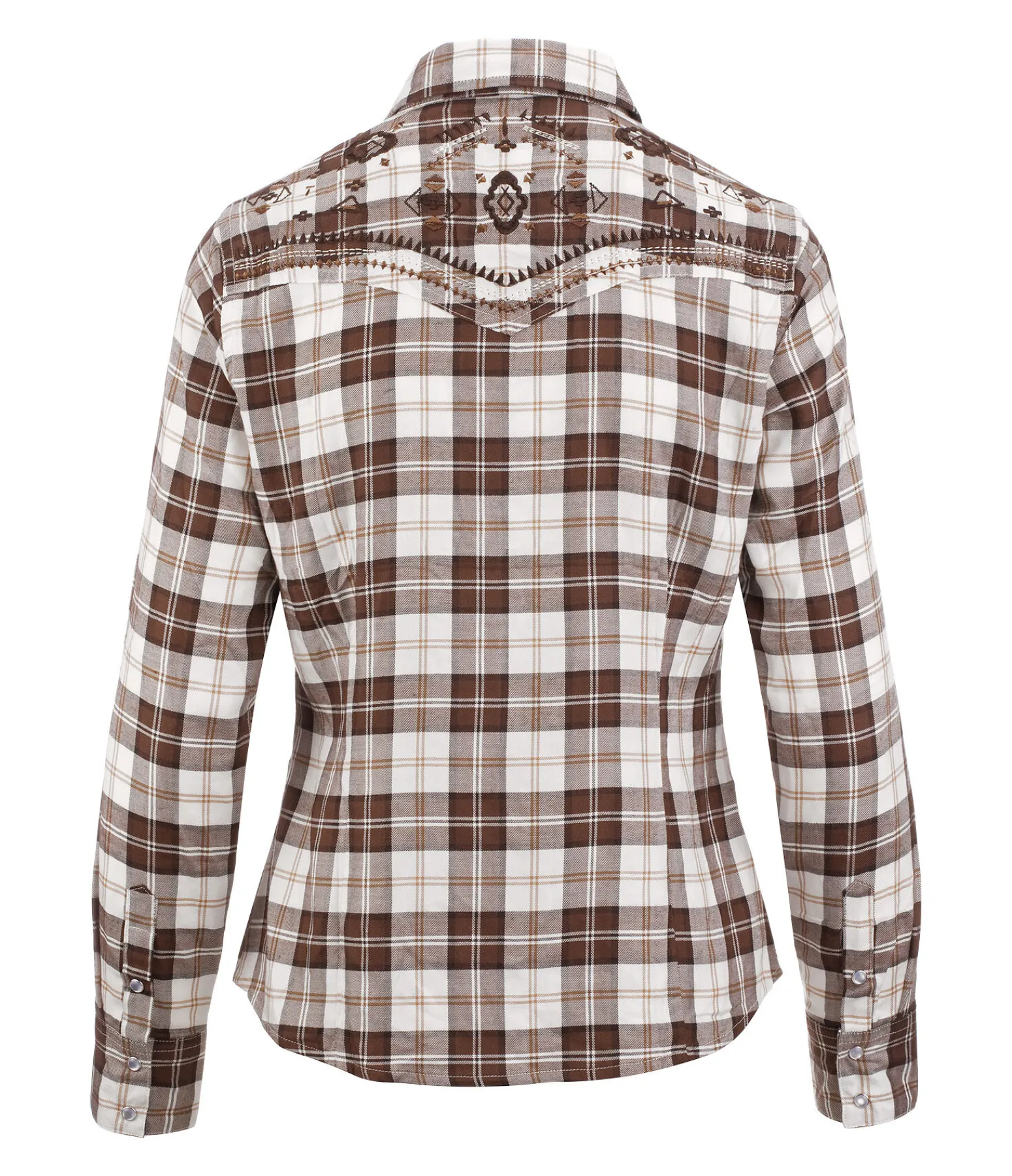 Chemise à carreaux. Coupe droite. Deux poches plaquées sur la poitrine. Patte de boutonnage et bas des manches avec boutons-pression nacrés. Yoke western brodé avec motif aztèque. Matière respirante. 100 % viscose.