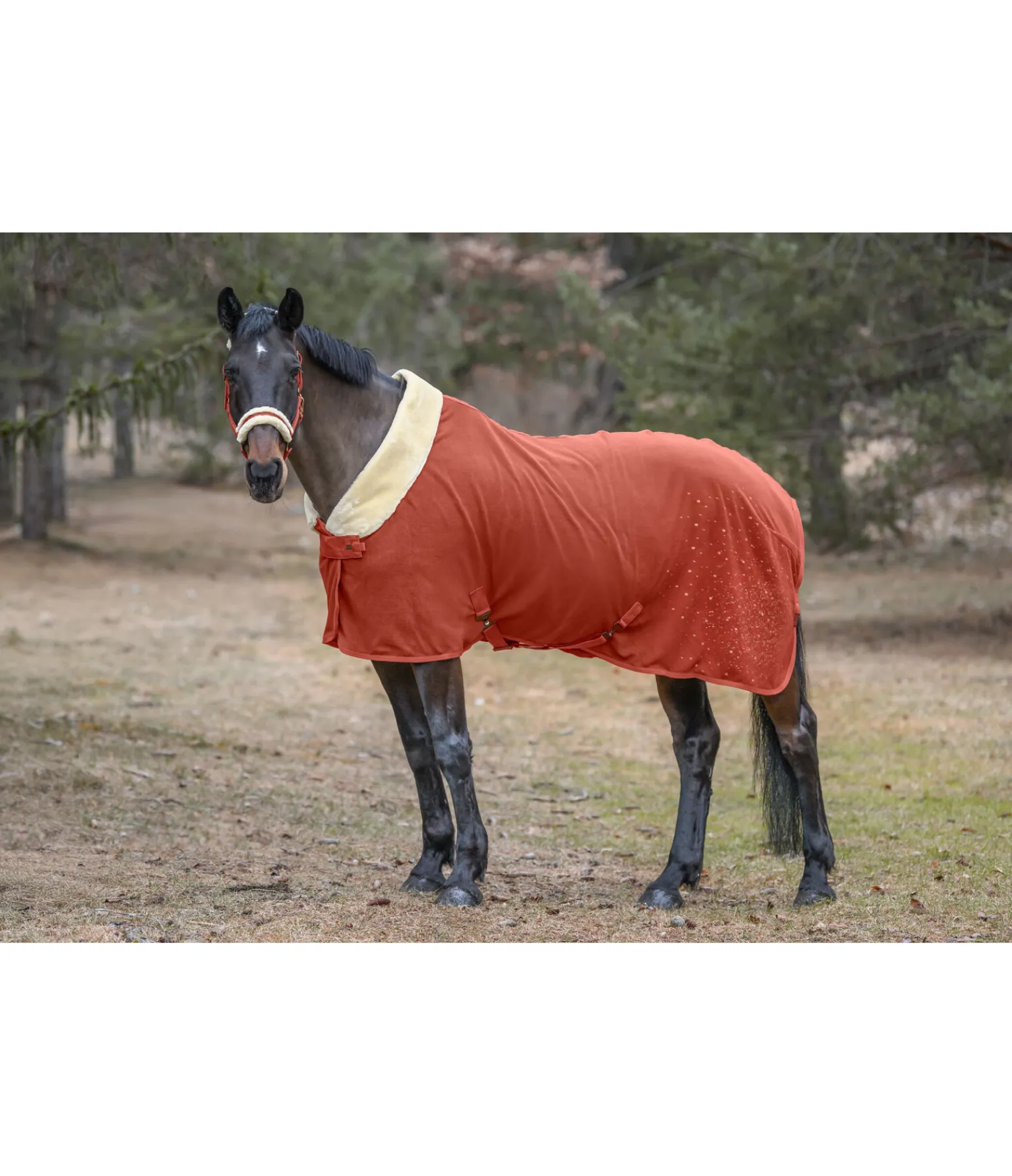 Chemise séchante chaude et douce avec col rembourré en polaire Teddy. Joli imprimé scintillant sur la partie arrière gauche de la couverture. Doublure lisse protégeant la robe au niveau des épaules et du poitrail, pour éviter les irritations dues aux frottements. Sursangles croisées amovibles de chaque côté. Fermeture de poitrail dissimulée avec crochet en T. Courroie de queue réglable incluse. Bouclerie argentée pour la couleur S et GA et rose doré pour la couleur NV. 100 % polyester.