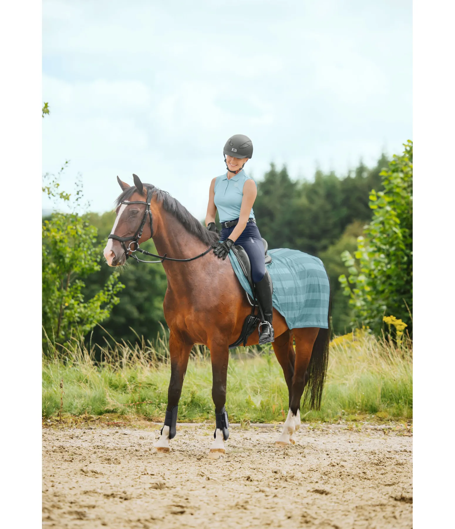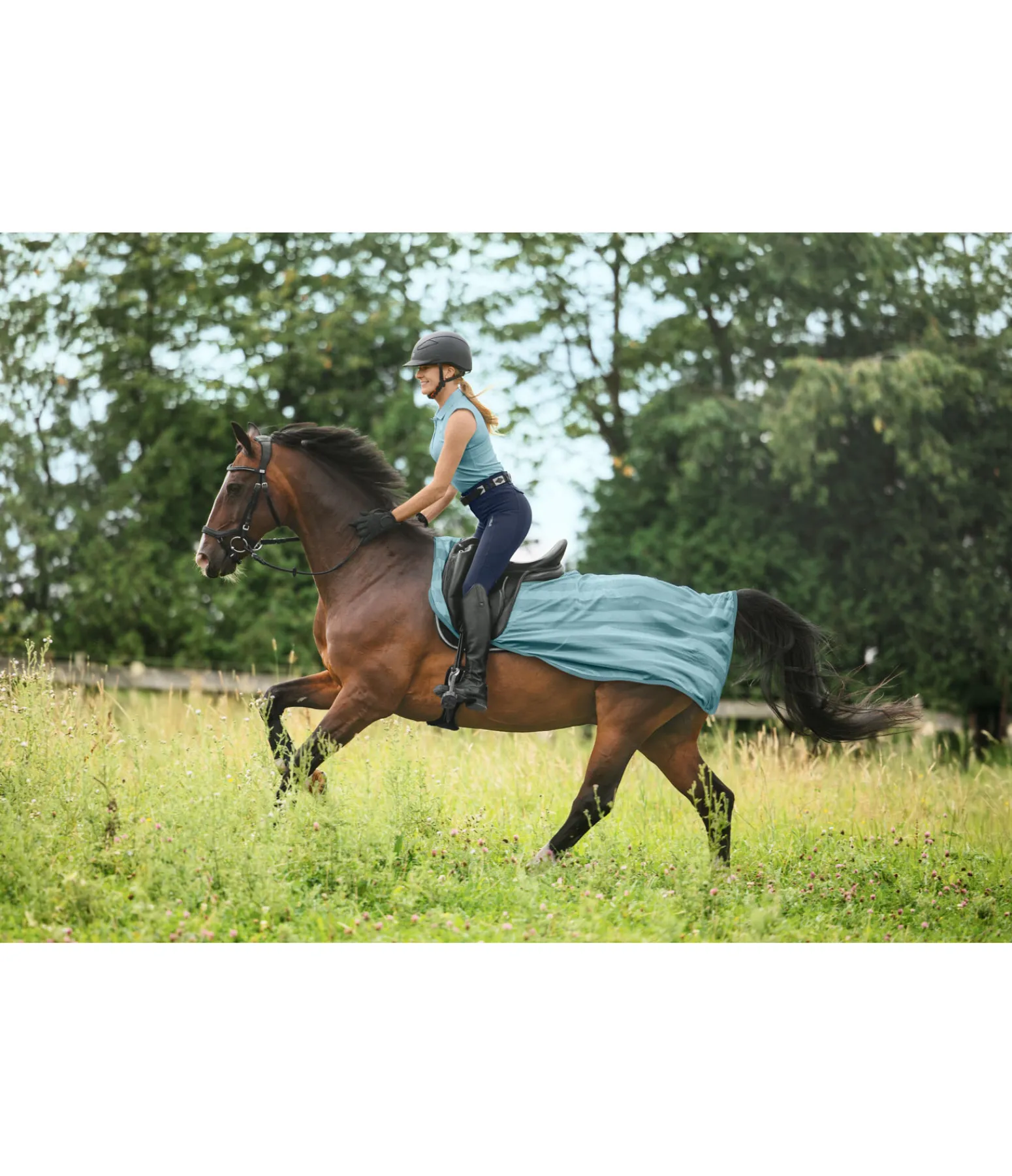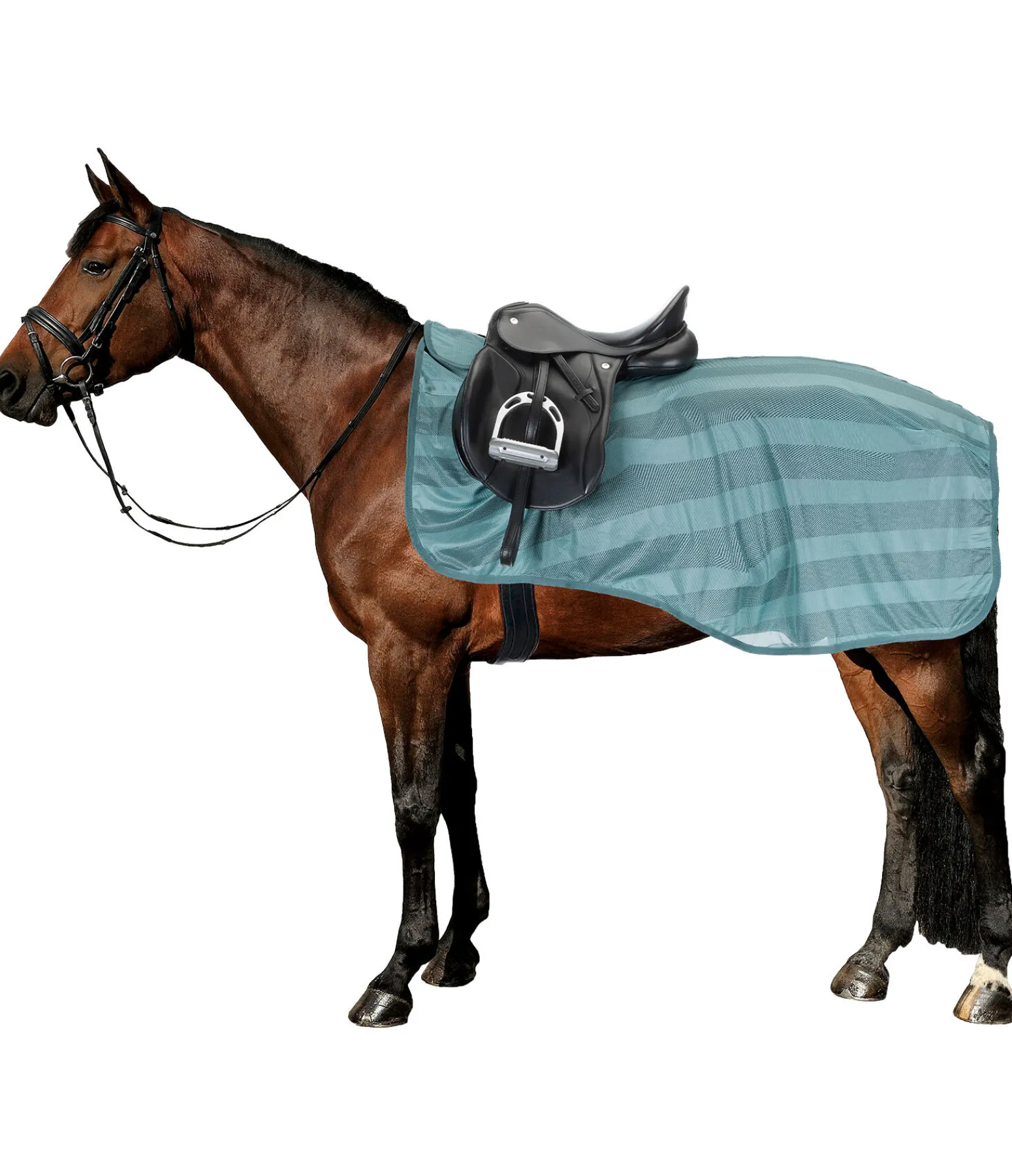 Couvre-reins anti-mouches particulièrement léger (75 deniers) et respirant avec découpe pour selles anglaises. Large patte auto-agrippante au garrot et courroie de queue pour un maintien sûr sans gêner la mobilité du cheval. 100 % polyester.