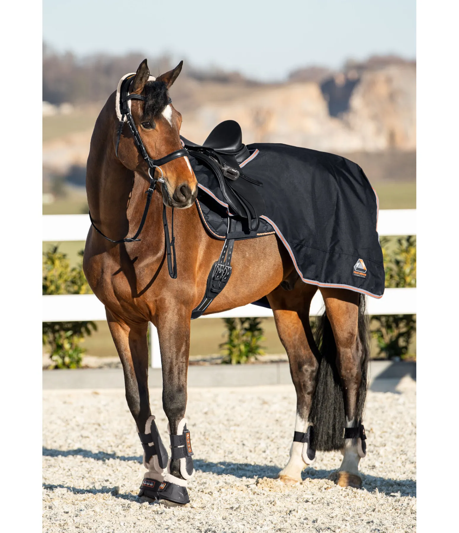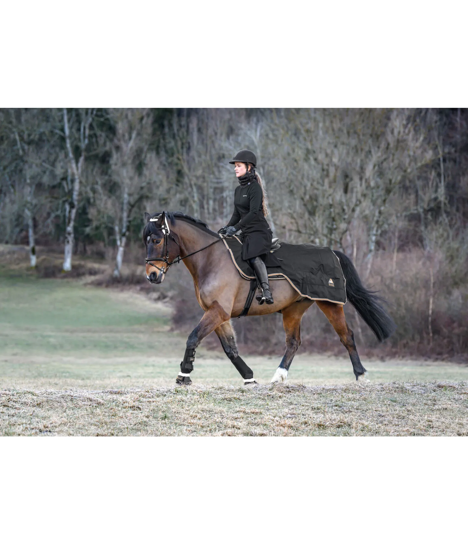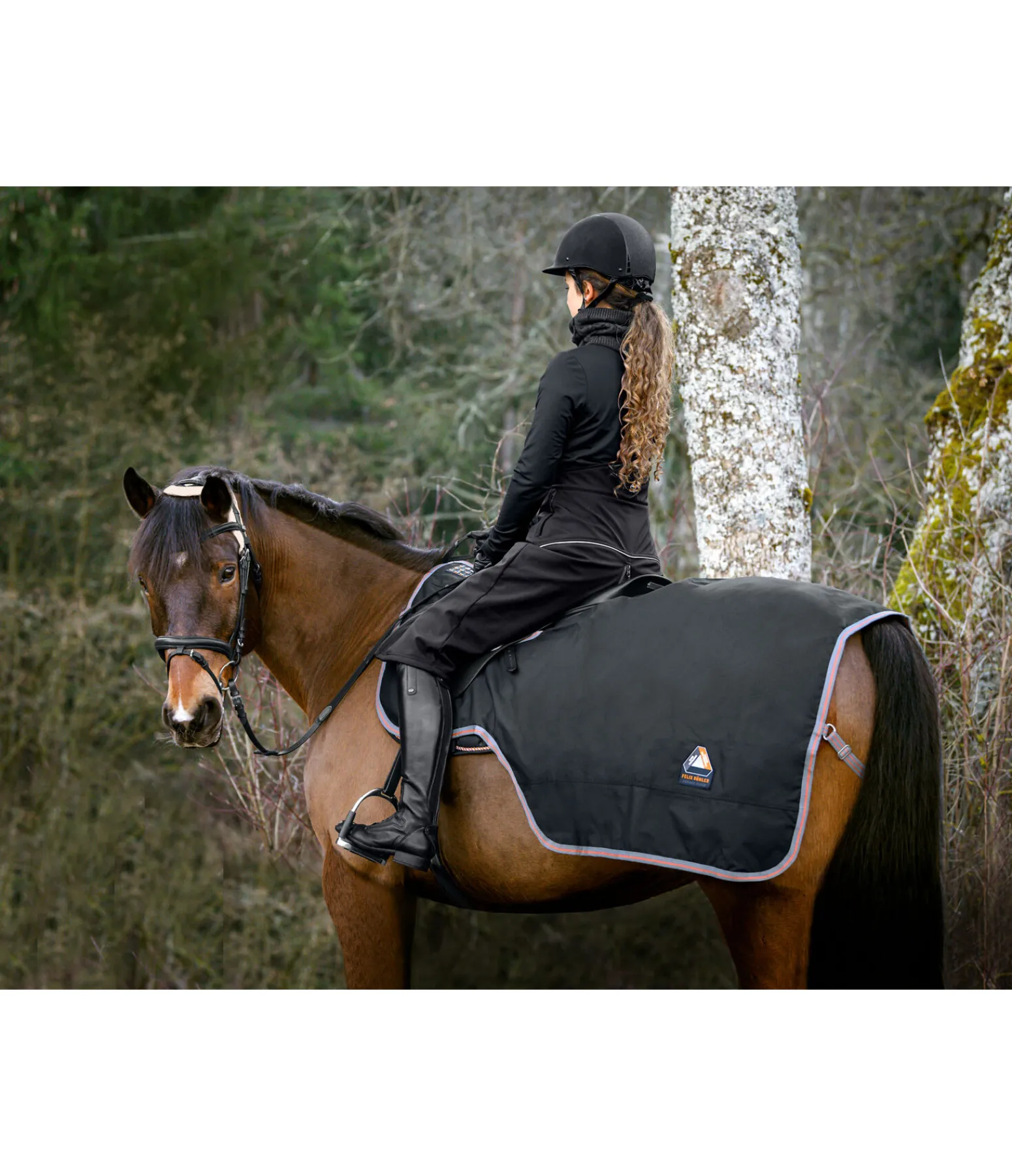 Couvre-reins imperméable (3 000 mm) et respirant (3.000 g/m2/24h) en tissu Ripstop 600 deniers résistant à la déchirure. Les fibres de céramique intégrées à la doublure intérieure en polaire chaude stimulent la circulation sanguine au niveau des reins. Peut favoriser la décontraction à cheval et soulager ou prévenir les tensions dans le dos. Découpe conçue pour une selle anglaise. Large patte auto-agrippante au niveau du garrot pour une fixation facile. Courroie de queue réglable incluse. Nous déconseillons aux femmes enceintes ainsi qu’aux animaux en gestation l’utilisation des articles contenant des fibres de céramique. 100 % polyester.