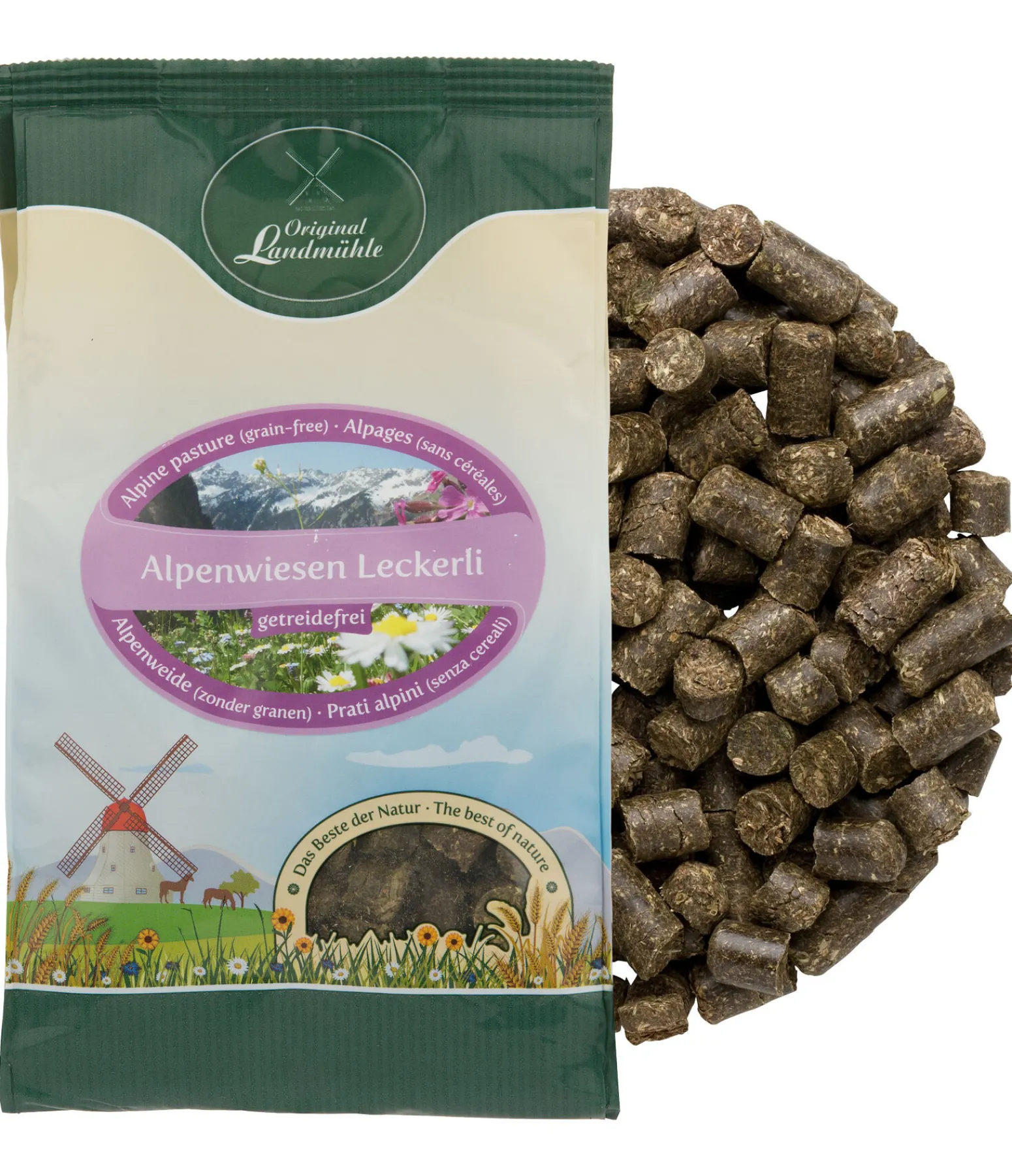 Friandises sans céréales ni mélasse à base de foin de montagne et d’herbes naturelles de la prairie alpine.