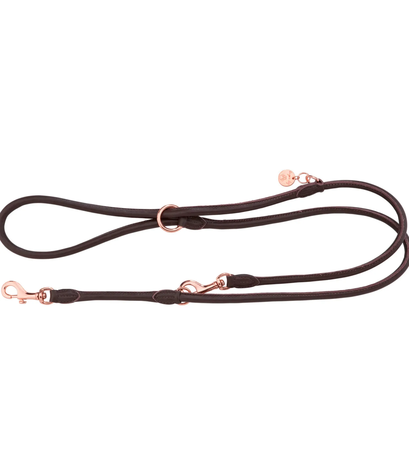 Laisse ronde en cuir véritable. Toucher doux. Longueur réglable sur 3 positions grâce à 3 anneaux et 1 mousqueton. Bouclerie rose doré dans la couleur BS et argentée dans la couleur BR et TB. Petit médaillon avec logo.