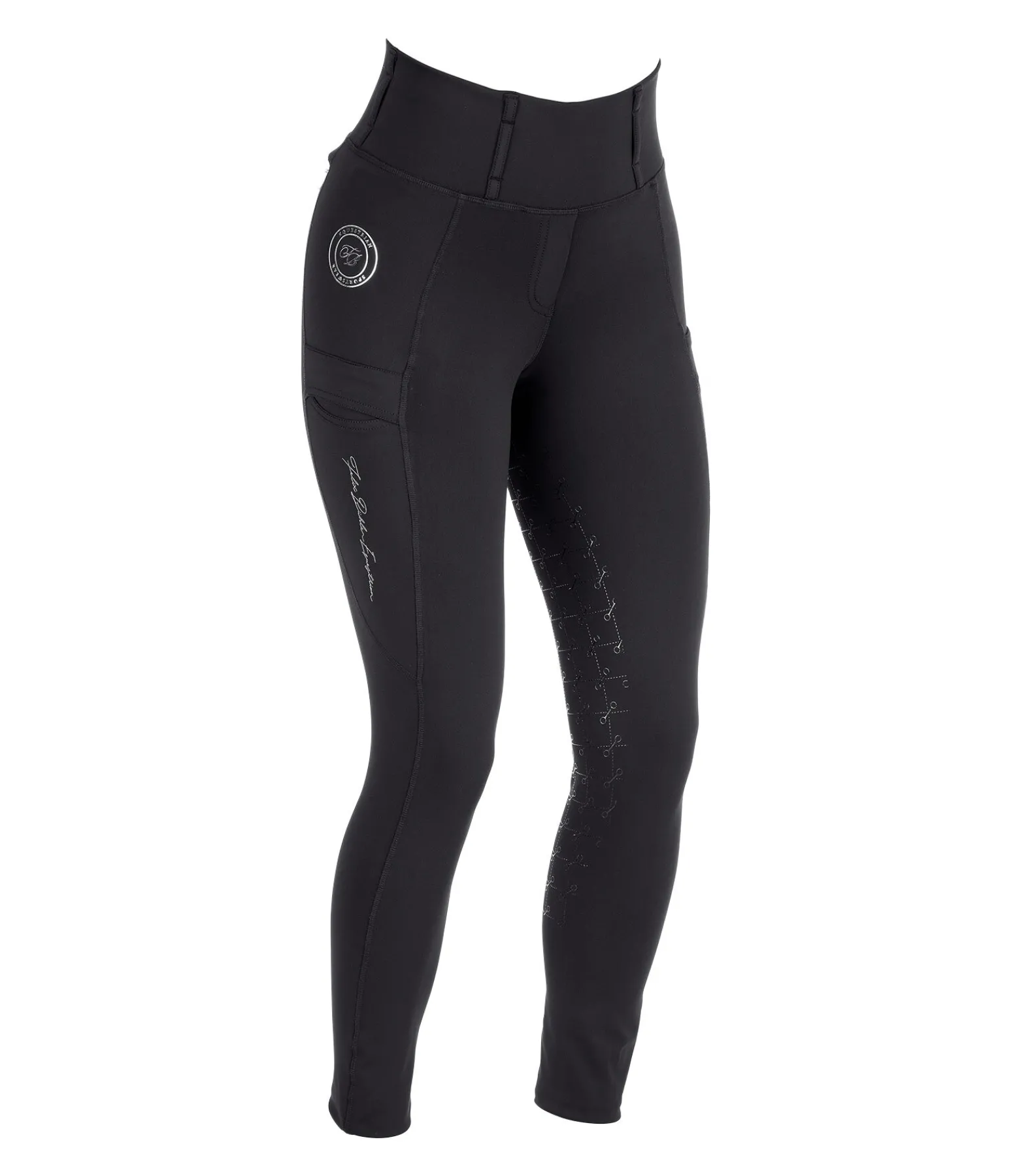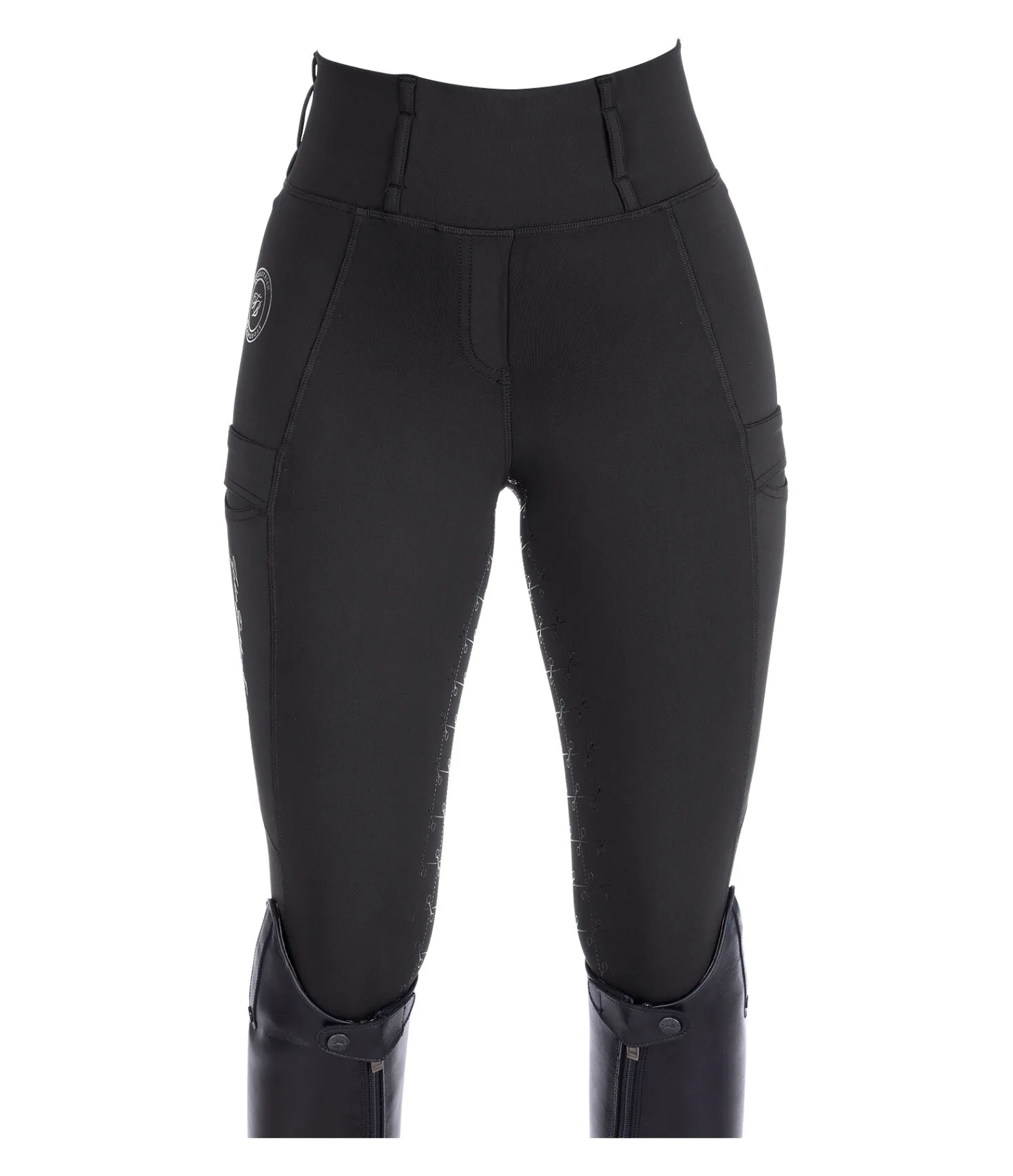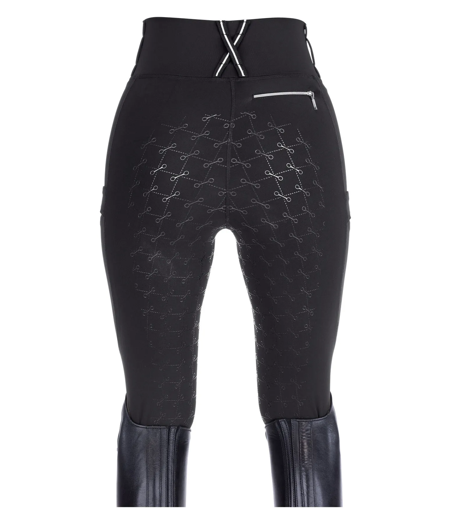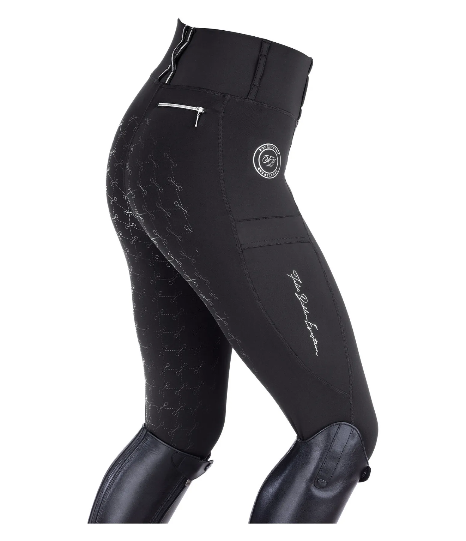 Legging d’équitation confortable à fond intégral grip en silicone avec motifs de mors. Matière respirante de grande qualité, extensible dans 4 directions. Séchage rapide. Soutien parfait et coupe ajustée. Ceinture extra large avec passants. 1 poche arrière zippée et 2 poches latérales pour téléphone portable. Aucune couture au niveau des genoux. Bas de jambe extensible. Imprimés Felix Bühler pailletés. 78 % polyester, 22 % élasthanne.