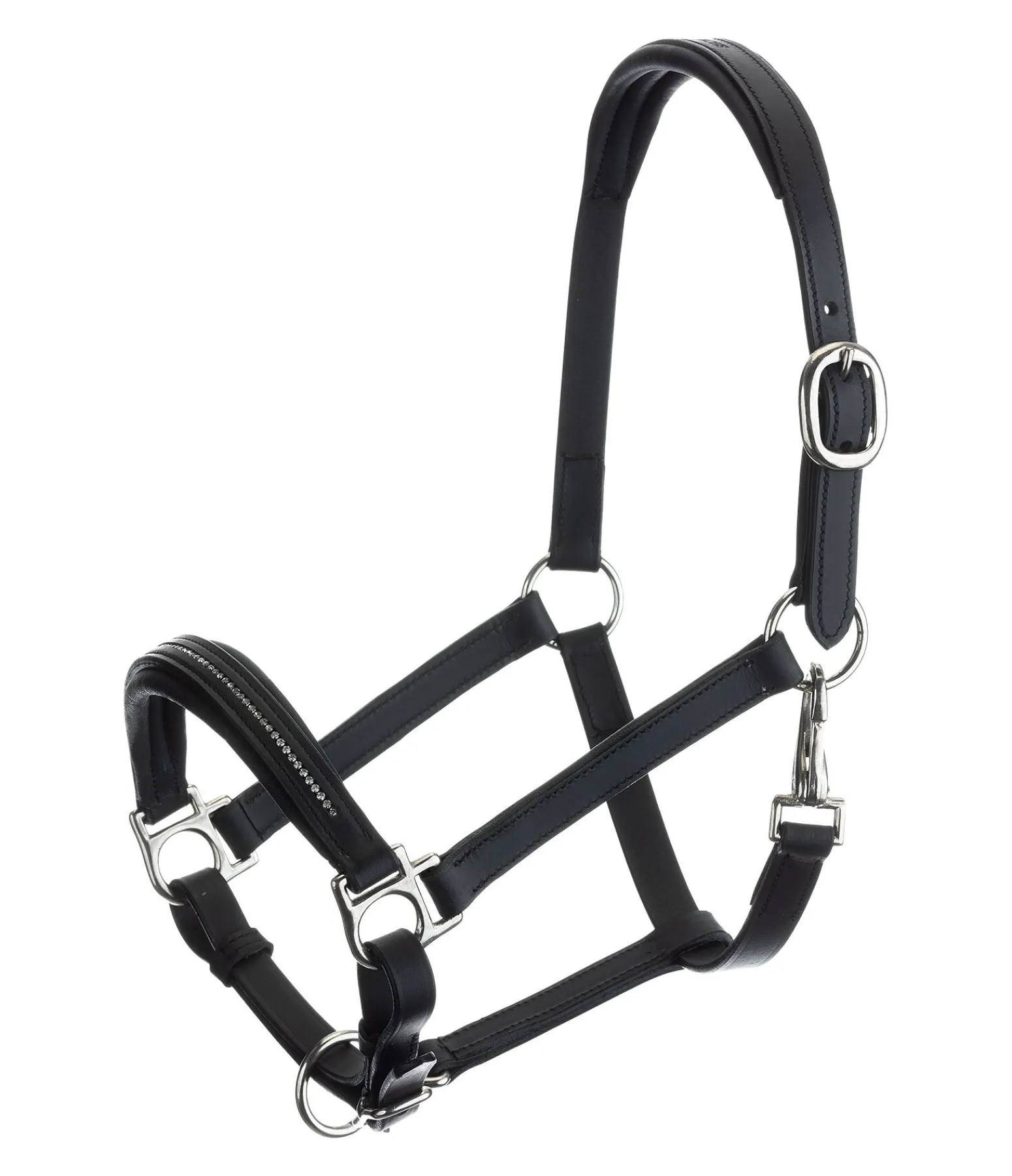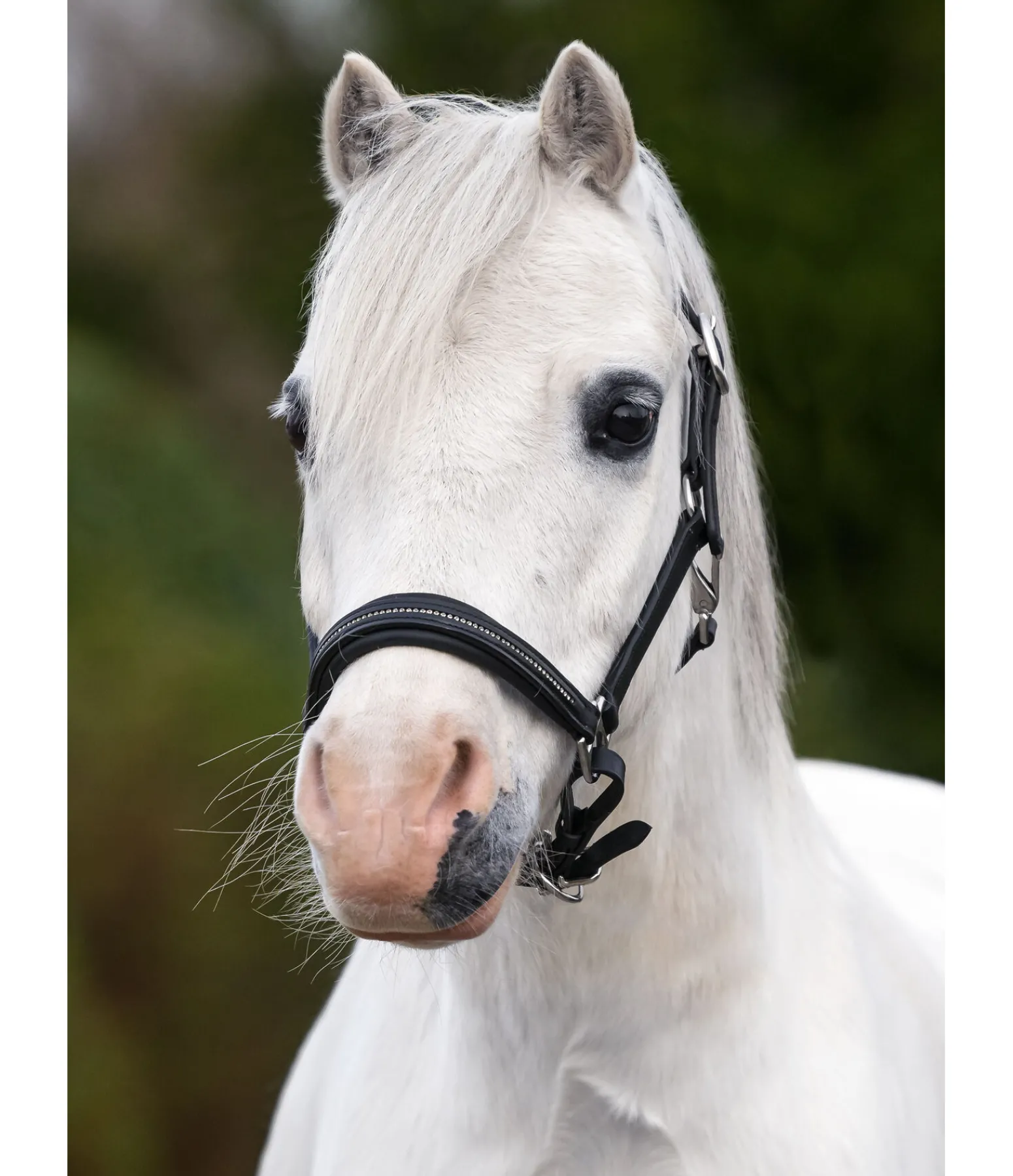 Licol poulain et shetland en cuir huilé, soigneusement décoré avec une rangée de petits strass sur la muserolle et un rembourrage en cuir véritable moelleux. Taille facile à régler.
