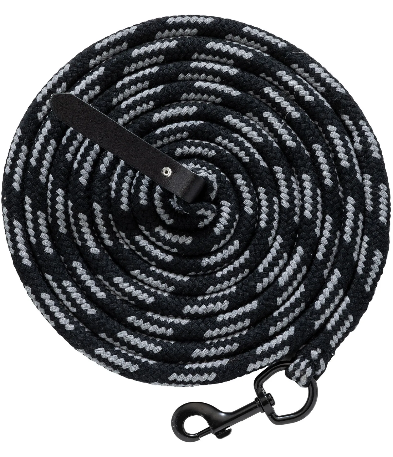 Coeur en polyester lourd, gaine en coton. Ne brûle pas la main si le cheval s’emballe. Diamètre 20 mm. Avec claquette en cuir et mousqueton Bolt Snap en laiton. Disponible en 4 ou 7 mètres.