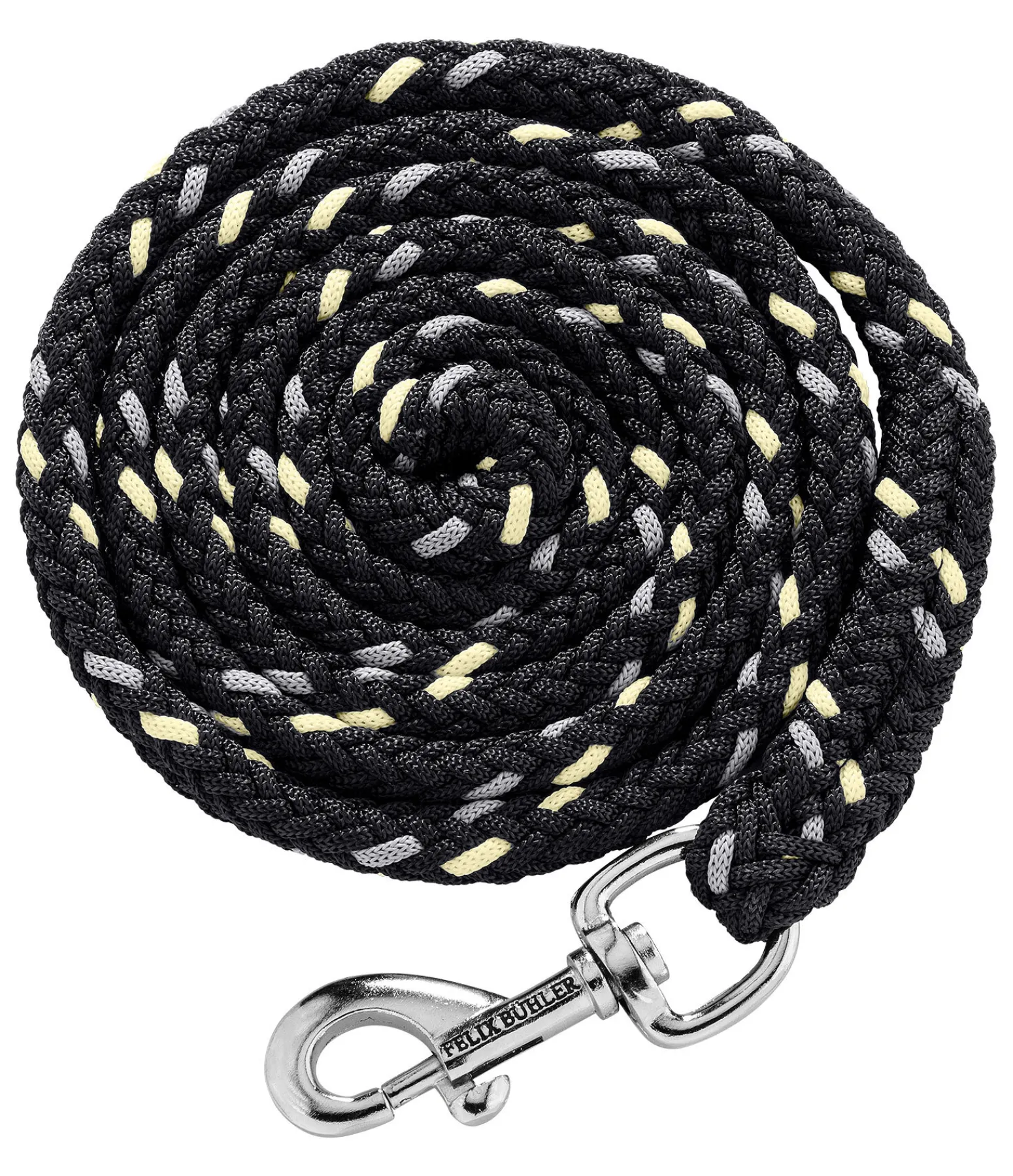 Longe tressée tricolore solide avec mousqueton. 2 m. 100 % polyester. Assortie au licol 310057.