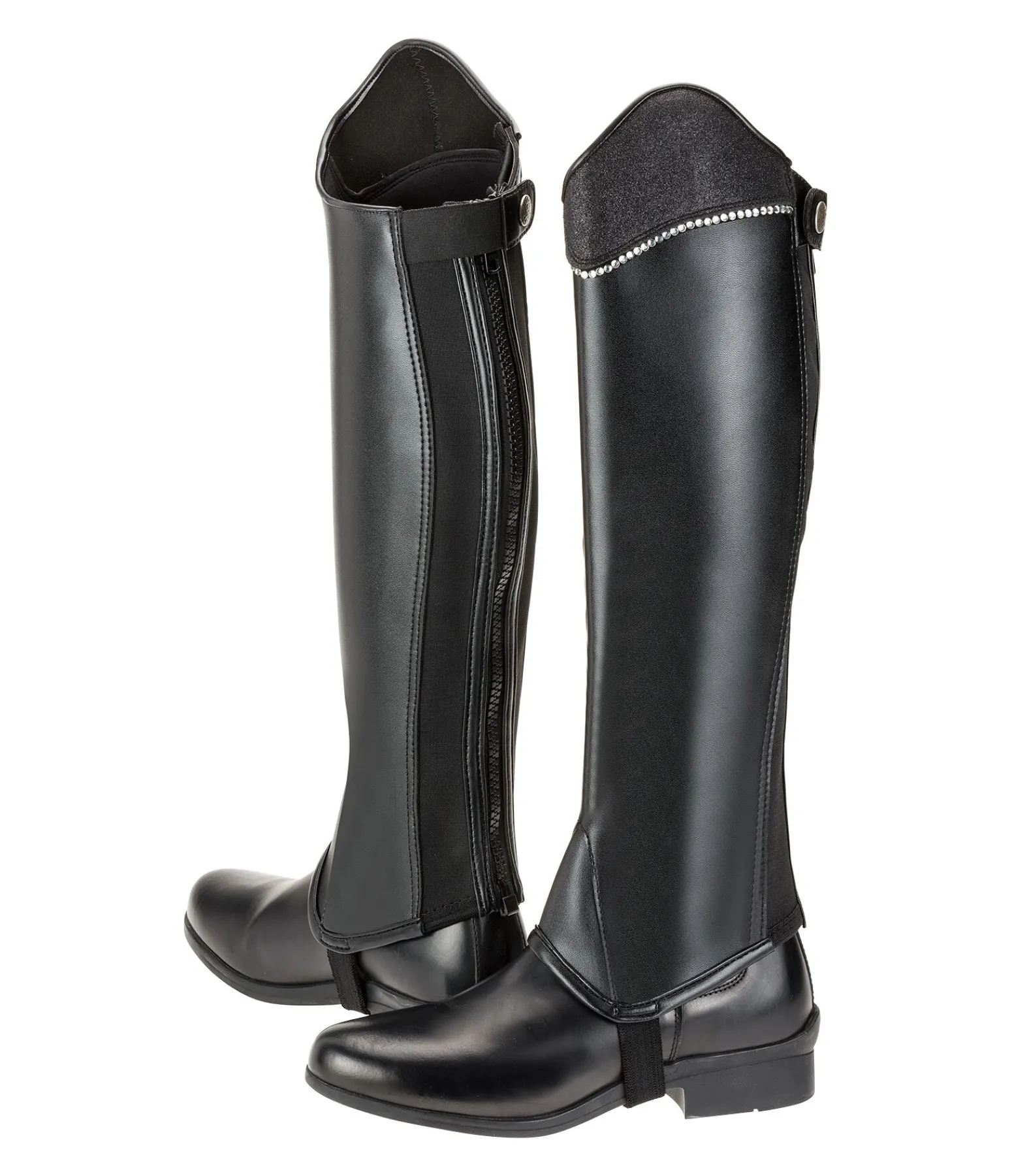Mini-chaps élégantes en synthétique souple. Empiècement scintillant décoré de strass sur le haut de la mini-chaps. Fermeture à glissière YKK arrière sécurisée par un bouton-pression pour maintenir le zip fermé. Empiècement élastiqué sur chaque côté de la fermeture à glissière pour une adaptation optimale au mollet. Lanière du pied robuste.