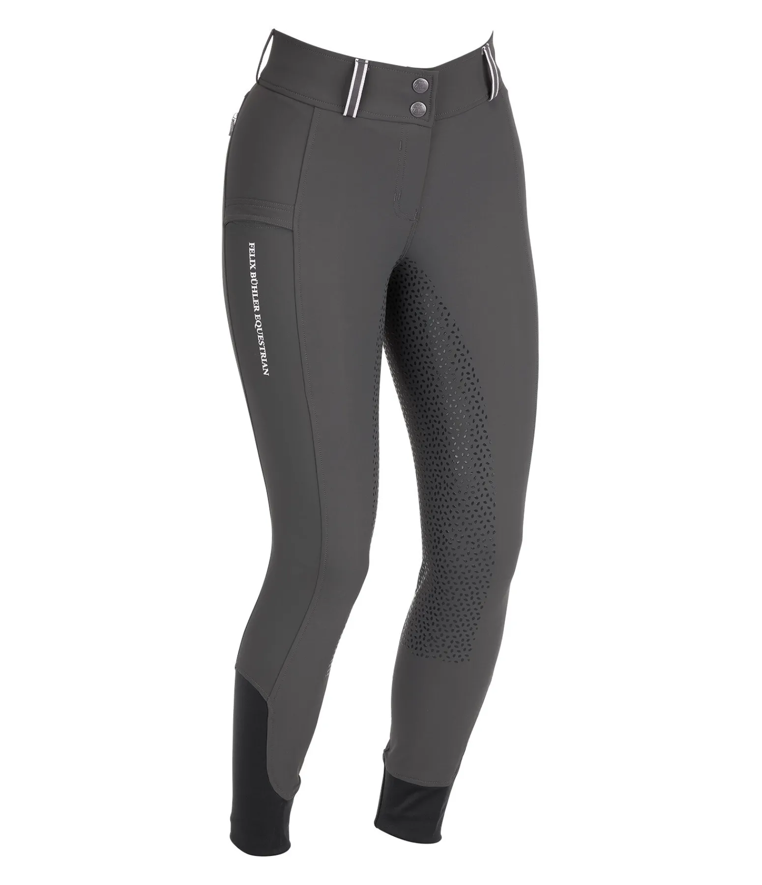Pantalon d’équitation technique avec fond intégral grip en silicone. Matière déperlante, respirante à séchage rapide. Le tissu stretch offre un super confort et une assise parfaite. 1 poche arrière zippée, 1 poche pour téléphone portable sur la jambe. Ceinture élastiquée avec passants rayés de couleur contrastante. Aucune couture au niveau des genoux. Bas de jambe extensible en stretch. 89 % nylon,11 % élasthanne.