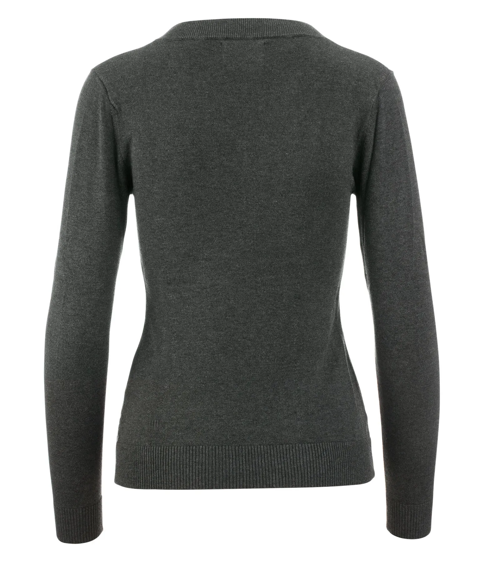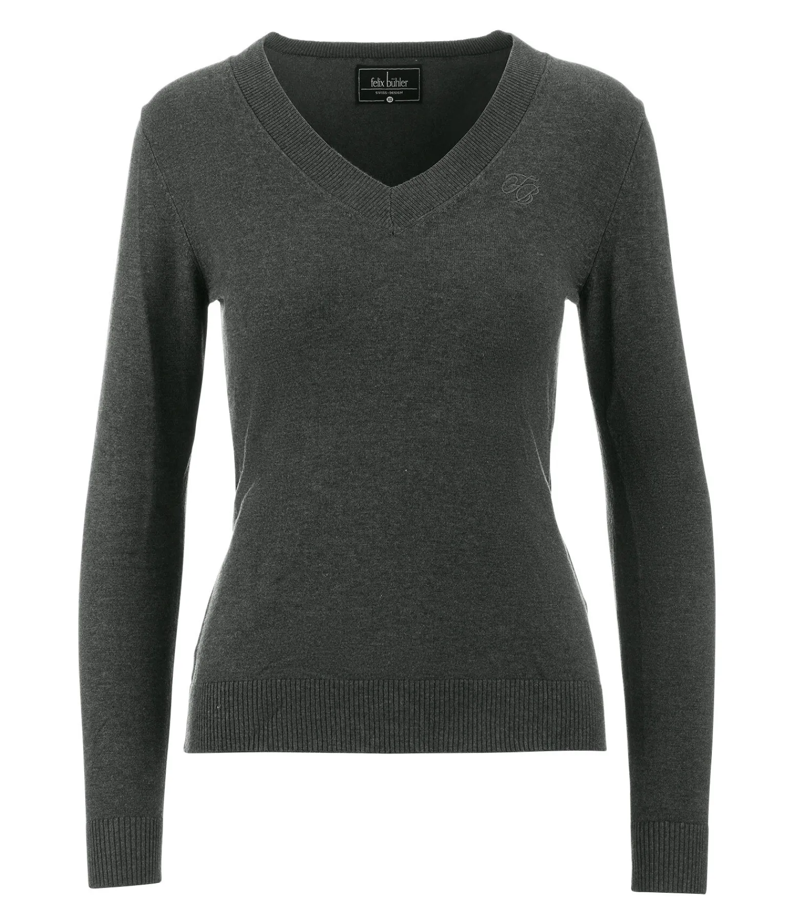 Pull classique avec col en V. Matière douce. Discrète broderie Felix Bühler sur la poitrine. Finition bord-côte à la taille, au col et aux poignets. 80 % viscose, 20 % nylon.