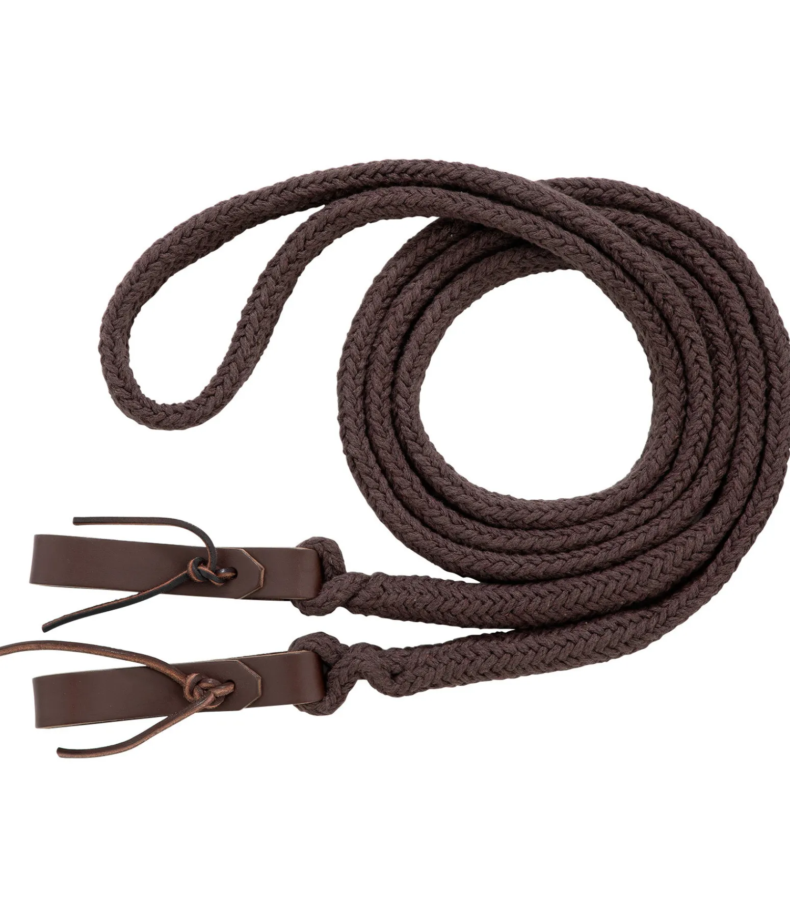 Rênes fermées en coton avec slobber bars. Tressé plat pour une meilleure prise en main. Longueur : 3,10 m.