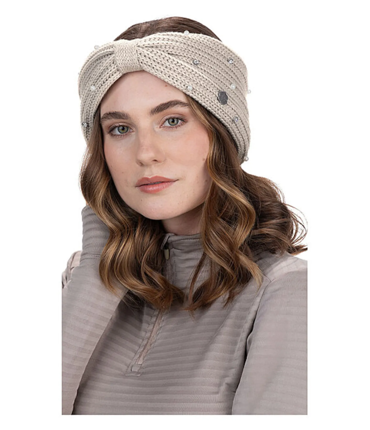 Élégant bandeau doux avec strass et perles sur le devant. Doublure en polaire extra-douce. Extérieur 100 % polyacrylique, intérieur 100 % polyester. Lavage à la main.