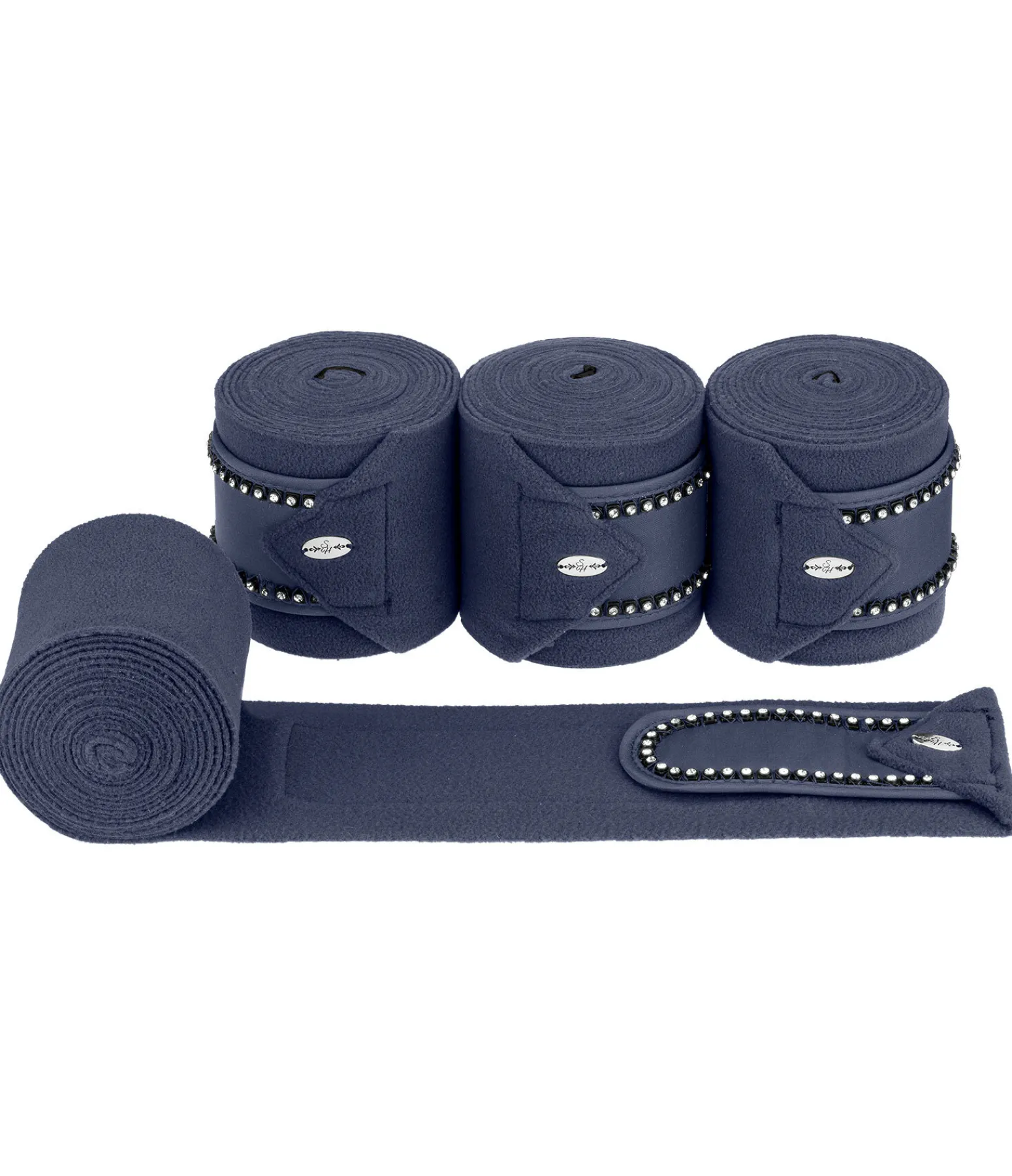 Bandes de polo en polaire. Passepoil avec strass sur la fermeture des bandes. Patte auto-agrippante pour un maintien sûr. 100 % polyester. F (cheval) : 300 x 10 cm, P (poney) : 200 x 8 cm. Vendues par lot de 4.