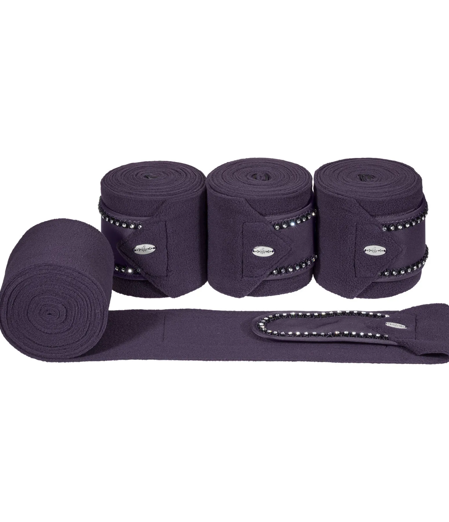 Bandes de polo en polaire. Passepoil avec strass sur la fermeture des bandes. Patte auto-agrippante pour un maintien sûr. 100 % polyester. F (cheval) : 300 x 10 cm, P (poney) : 200 x 8 cm. Vendues par lot de 4.