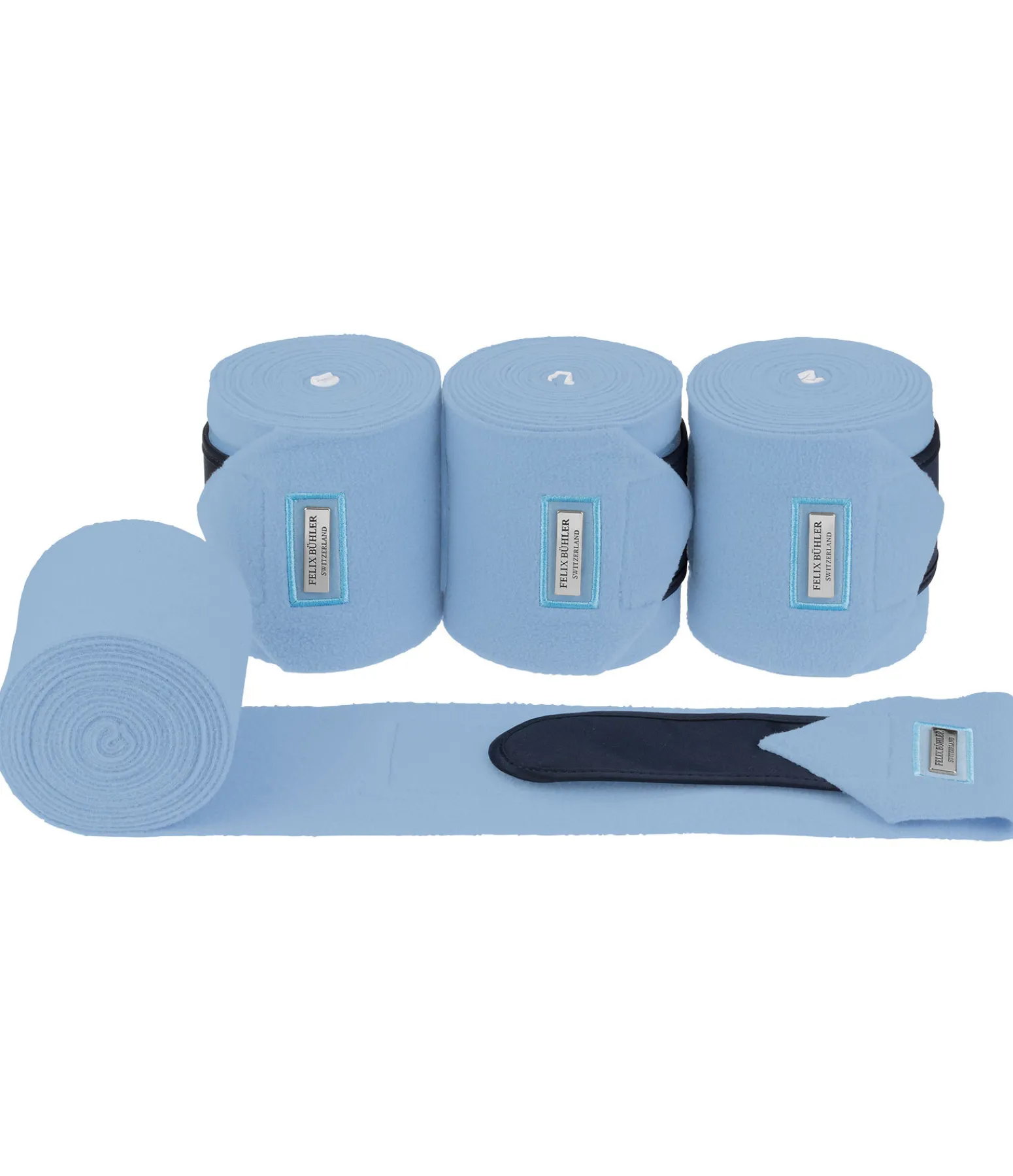 Bandes en polaire élégantes et douces avec large patte auto-agrippante pour un maintien sûr et empiècement en tissu satiné orné d’une petite plaque métallique avec logo. 100 % polyester. P : 8 cm x 207 cm F : 11 cm x 350 cm. Vendu par lot de 4.