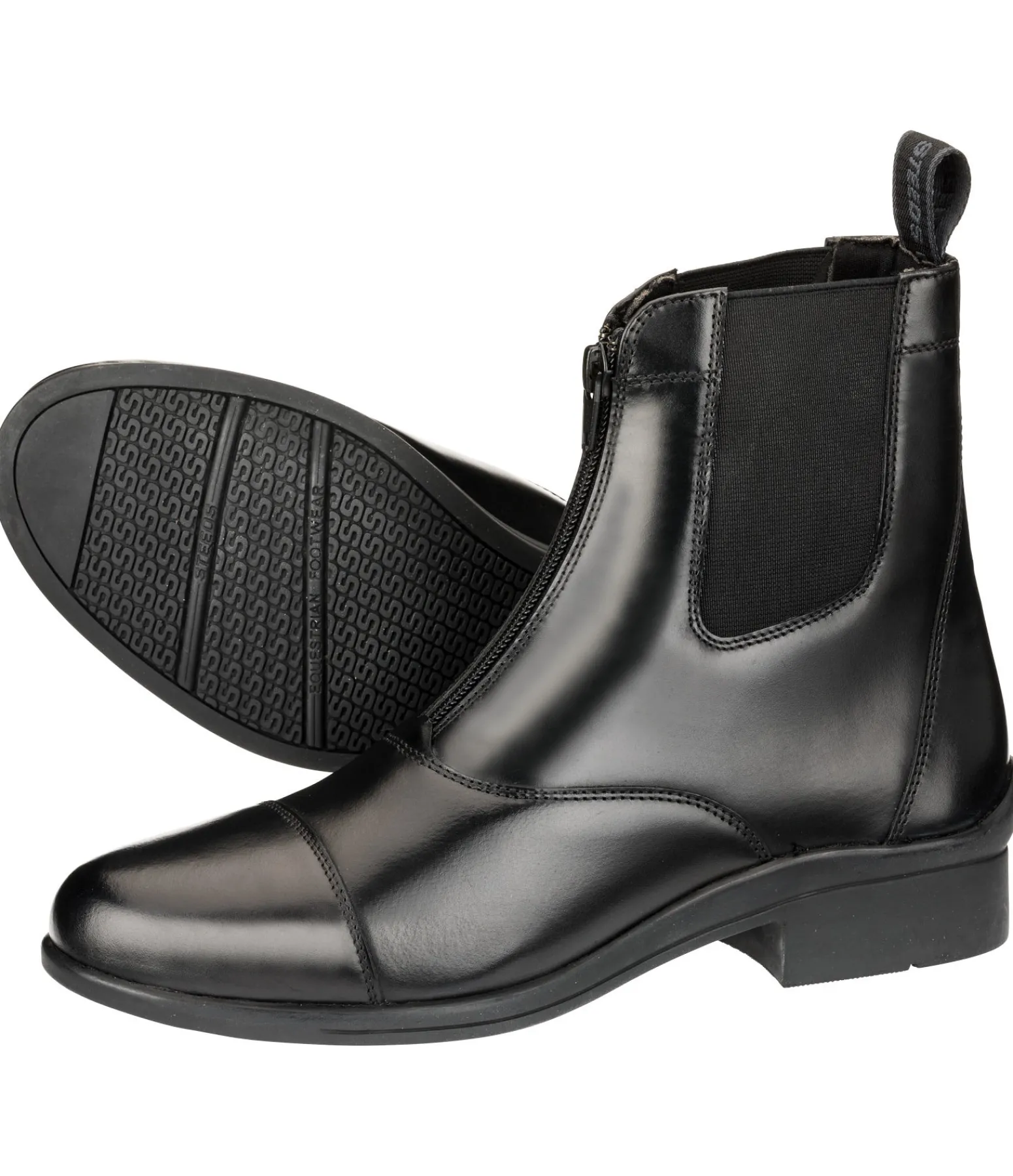 Bottines zippées en cuir de vachette. Modèle amélioré sportswear. Soufflets élastiqués pour un confort optimal. Fermeture à glissière à l’avant et tirant solide pour faciliter l’enfilage et le retrait. Nouvelle semelle extérieure en caoutchouc avec talon cavalier pour une adhérence optimale dans l’étrier. Doublure intérieure en tissu (100 % polyester).