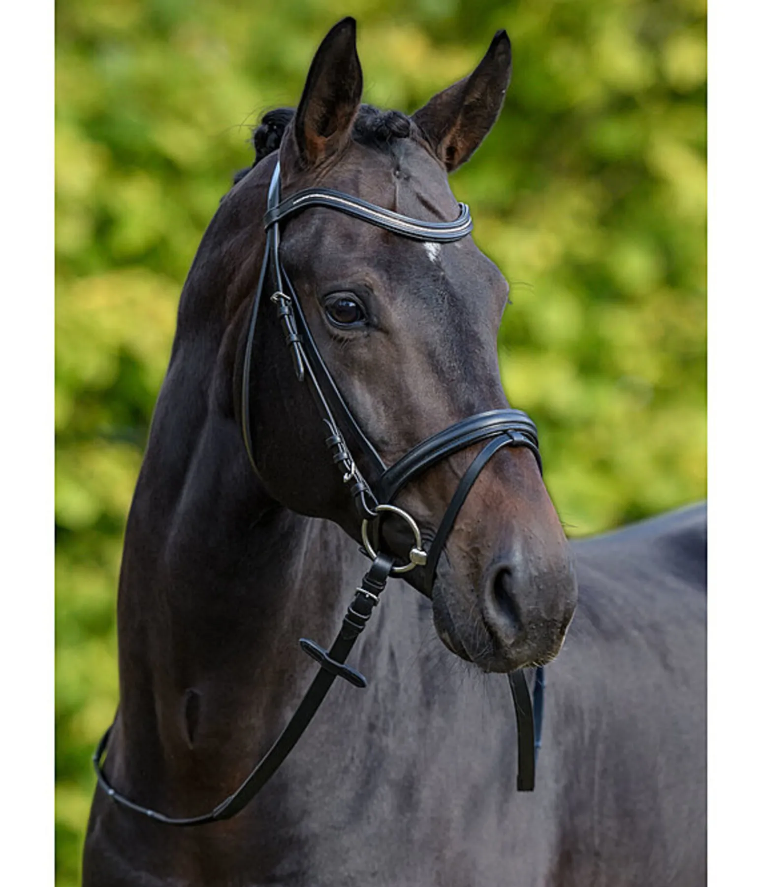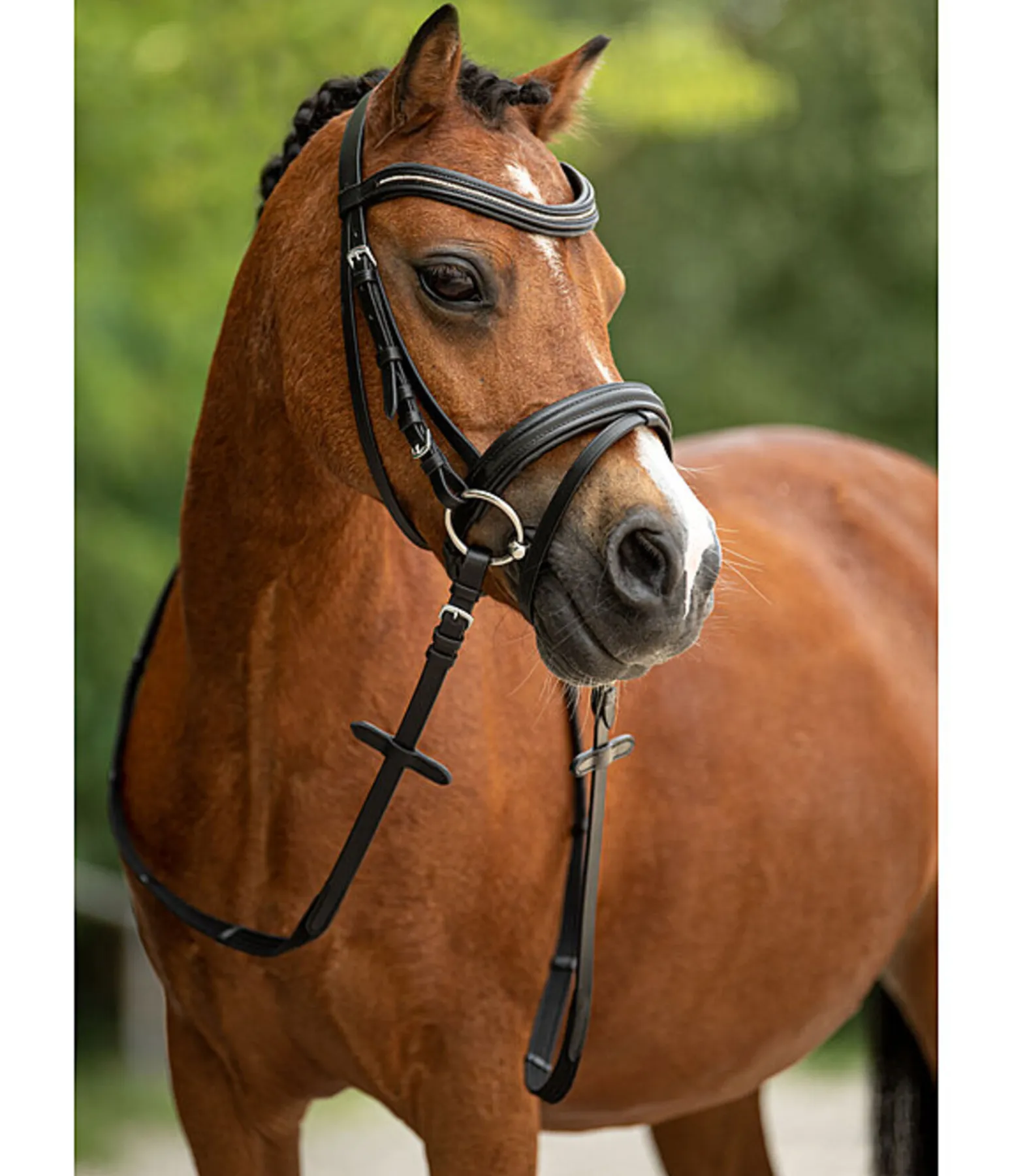 Adorable bridon avec muserolle combinée, conçu spécialement pour les mini-shetlands. Têtière et muserolle avec coupe droite, muserolle avec doublure douce. Frontal vague avec de nombreux strass scintillants. Bouclerie argentée. Avec rênes sangle, sans mors.