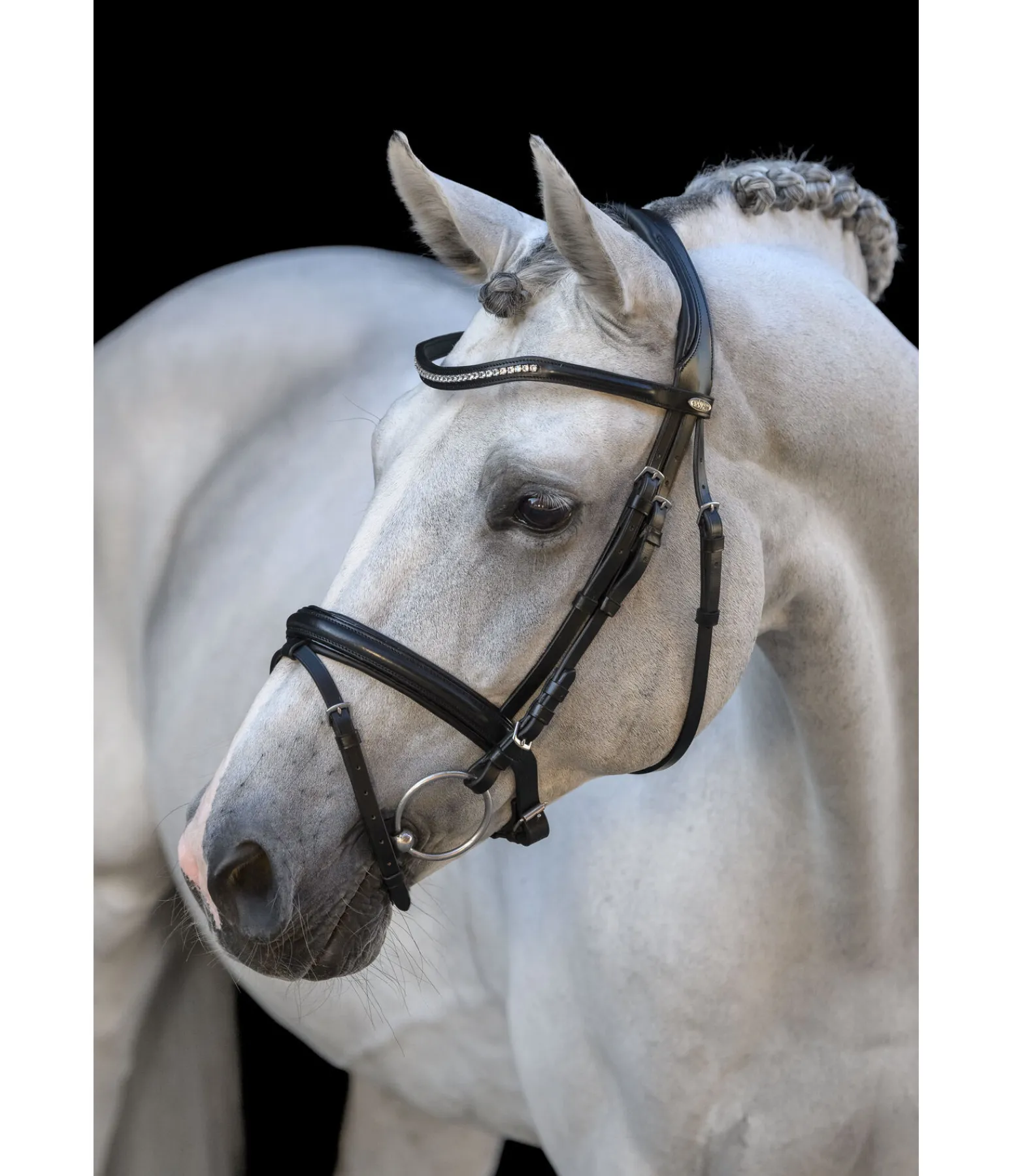 Muserolle classique française combinée avec têtière extra souple de forme anatomique. Frontal vague orné de strass au centre. Jonc en cuir verni sur la muserolle. Sans rênes, sans mors. Cuir véritable. Bouclerie argentée.