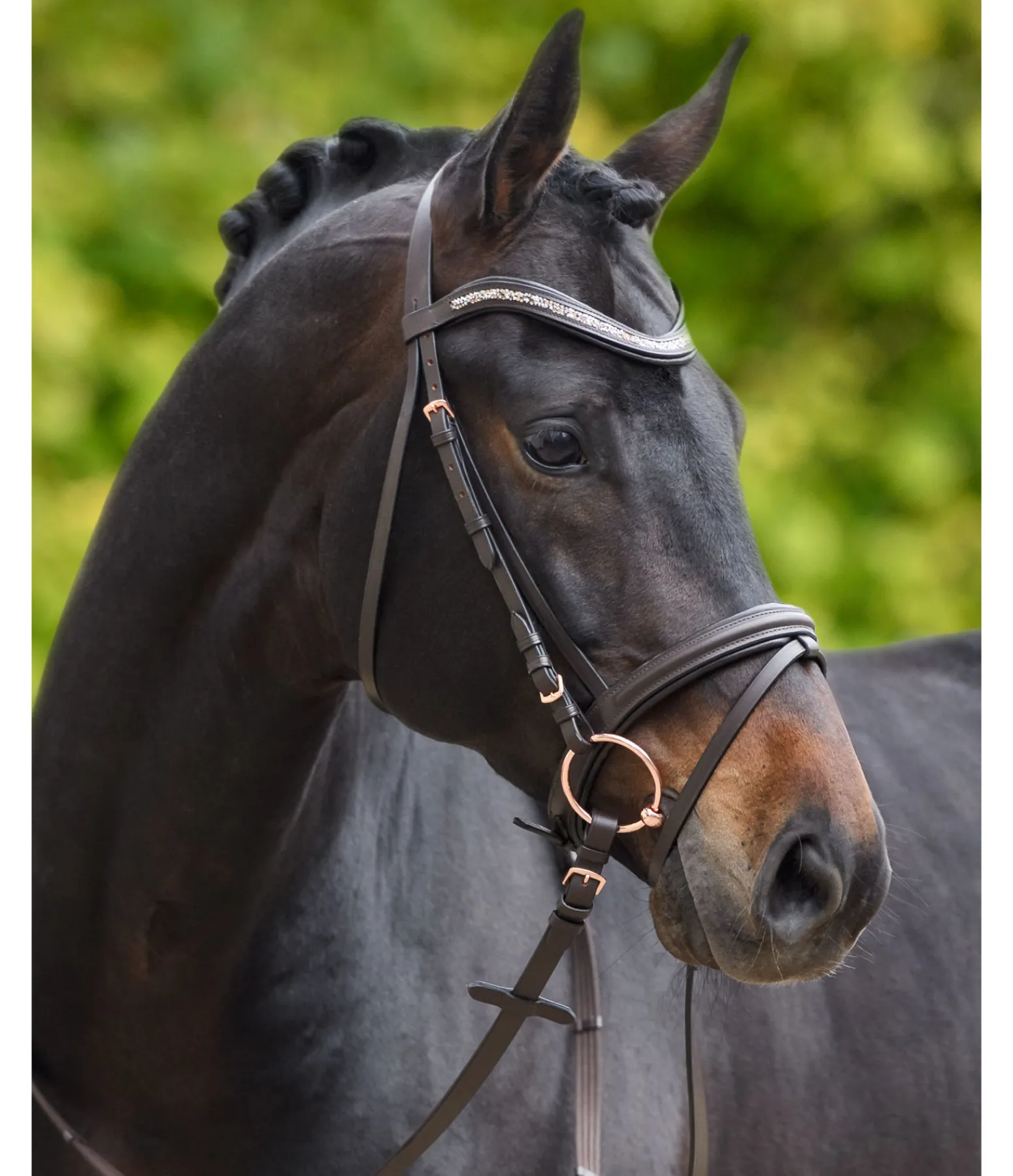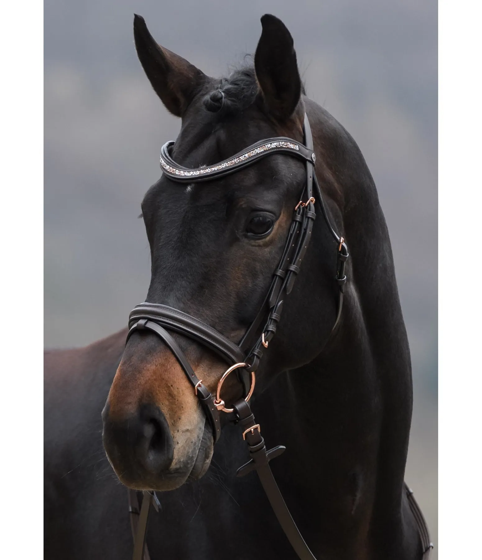 Bridon exceptionnel avec muserolle française combinée et frontal vague scintillant avec pierres scintillantes argentées et rose-doré. Frontal et muserolle avec doublure douce en cuir. Bouclerie rose doré. Avec rênes sangle, sans mors.