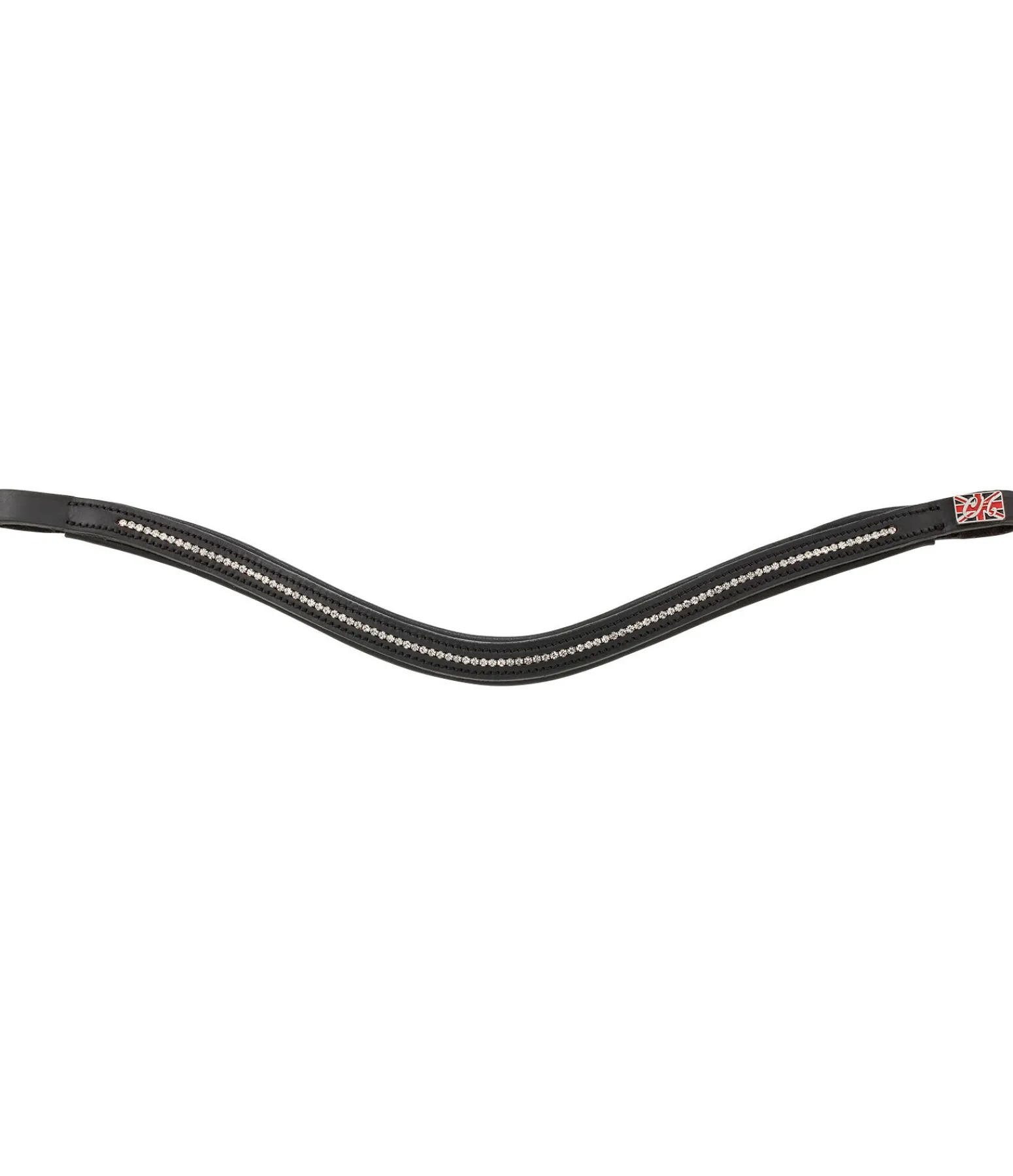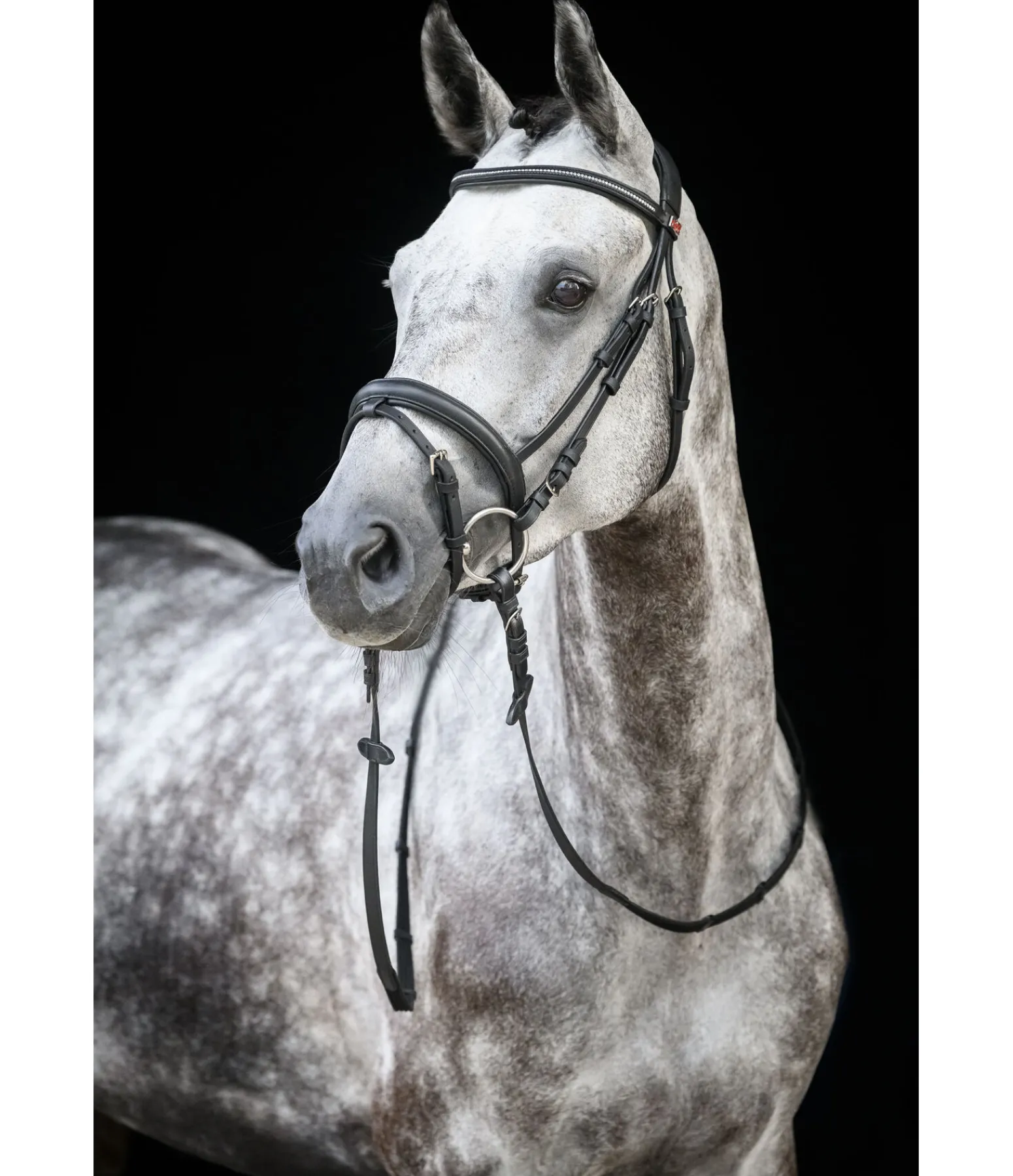 Bridon de qualité supérieure en cuir travaillé particulièrement souple et flexible. Têtière anatomique avec découpe confortable aux oreilles et large appui sur la nuque pour une répartition optimale des pressions. Frontal vague scintillant, muserolle et têtière avec doublure douce. Bridon noir avec bouclerie argentée. Avec rênes sangle, sans mors.