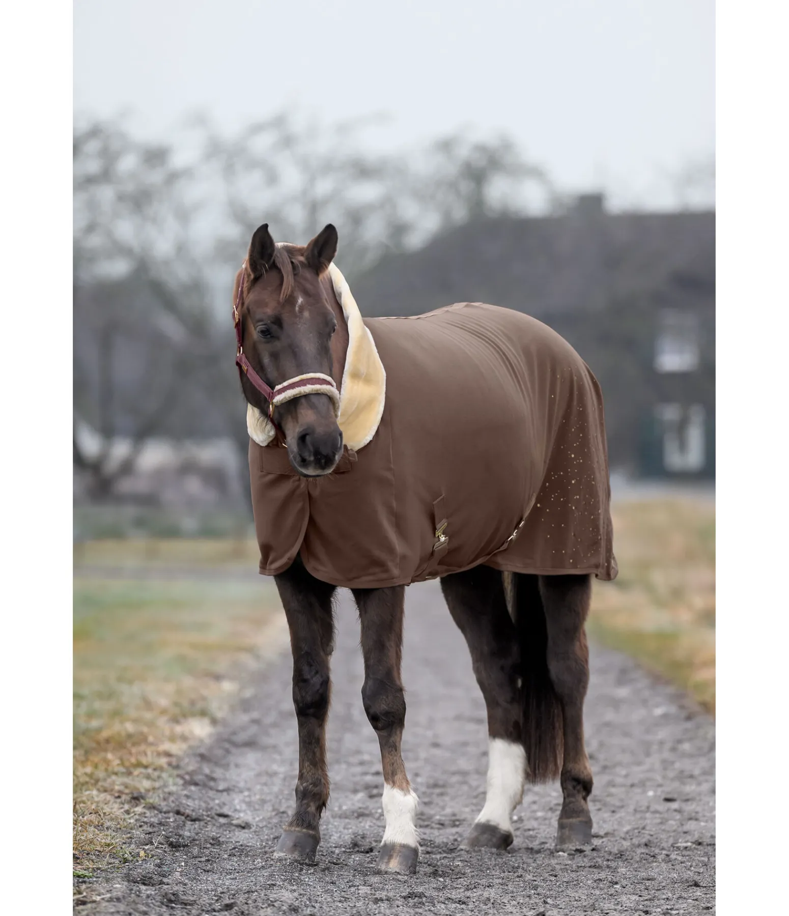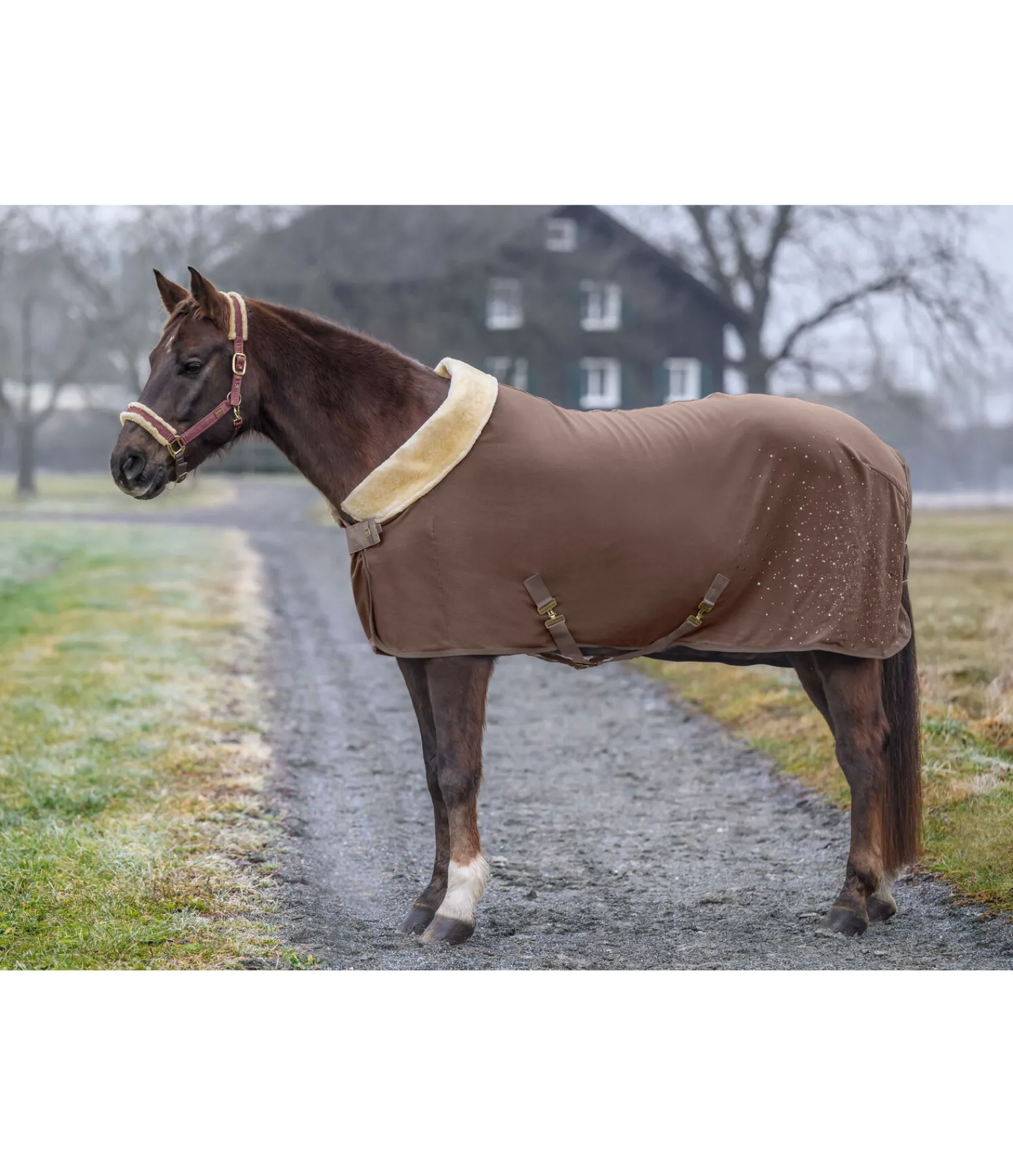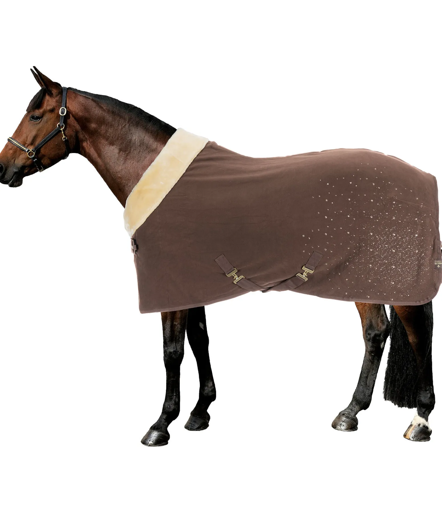 Chemise séchante chaude et douce avec col rembourré en polaire Teddy. Joli imprimé scintillant sur la partie arrière gauche de la couverture. Doublure lisse protégeant la robe au niveau des épaules et du poitrail, pour éviter les irritations dues aux frottements. Sursangles croisées amovibles de chaque côté. Fermeture de poitrail dissimulée avec crochet en T. Courroie de queue réglable incluse. Bouclerie argentée pour la couleur S et GA et rose doré pour la couleur NV. 100 % polyester.