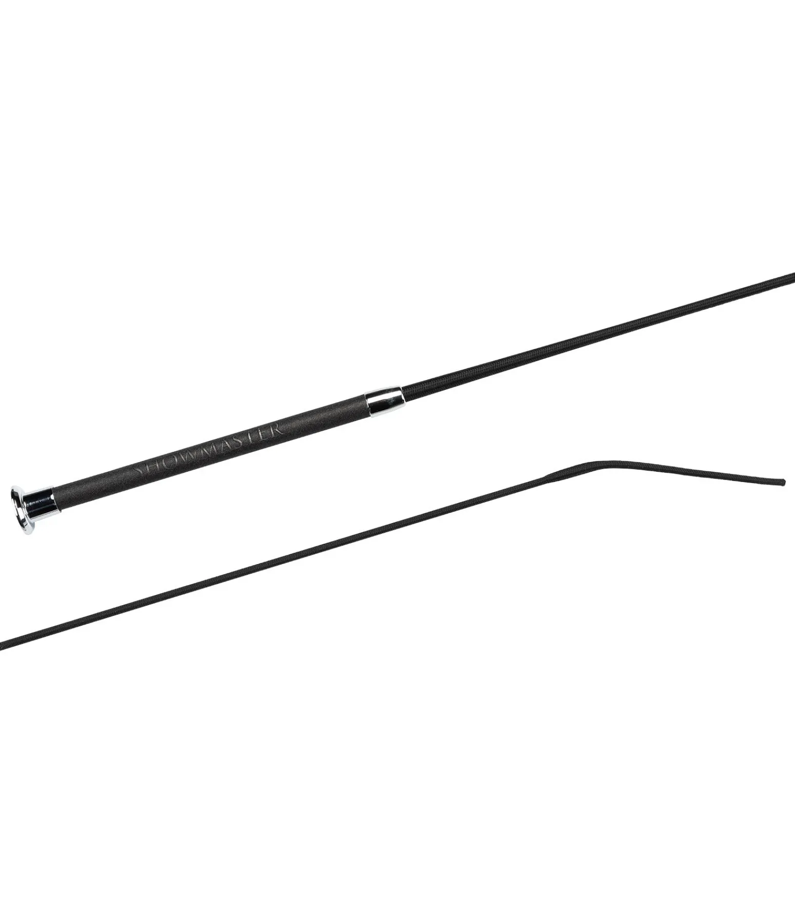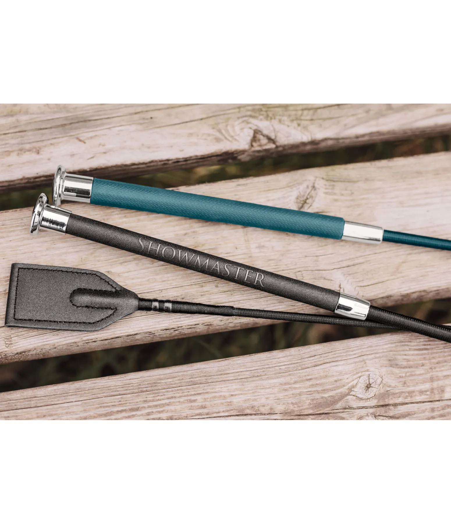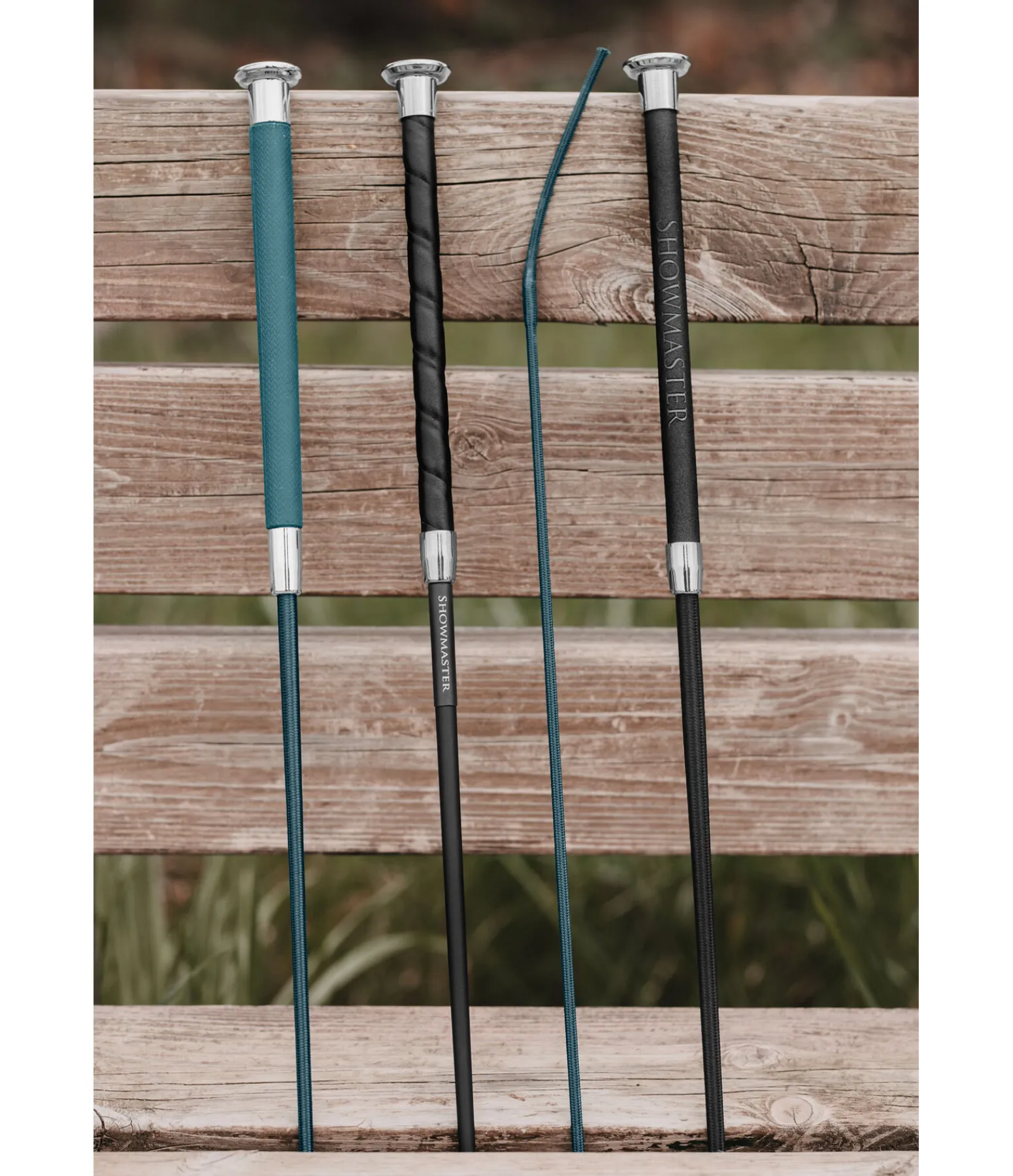 Élégante cravache de dressage avec poignée scintillante. Manche en fibre de verre et tresse en nylon.