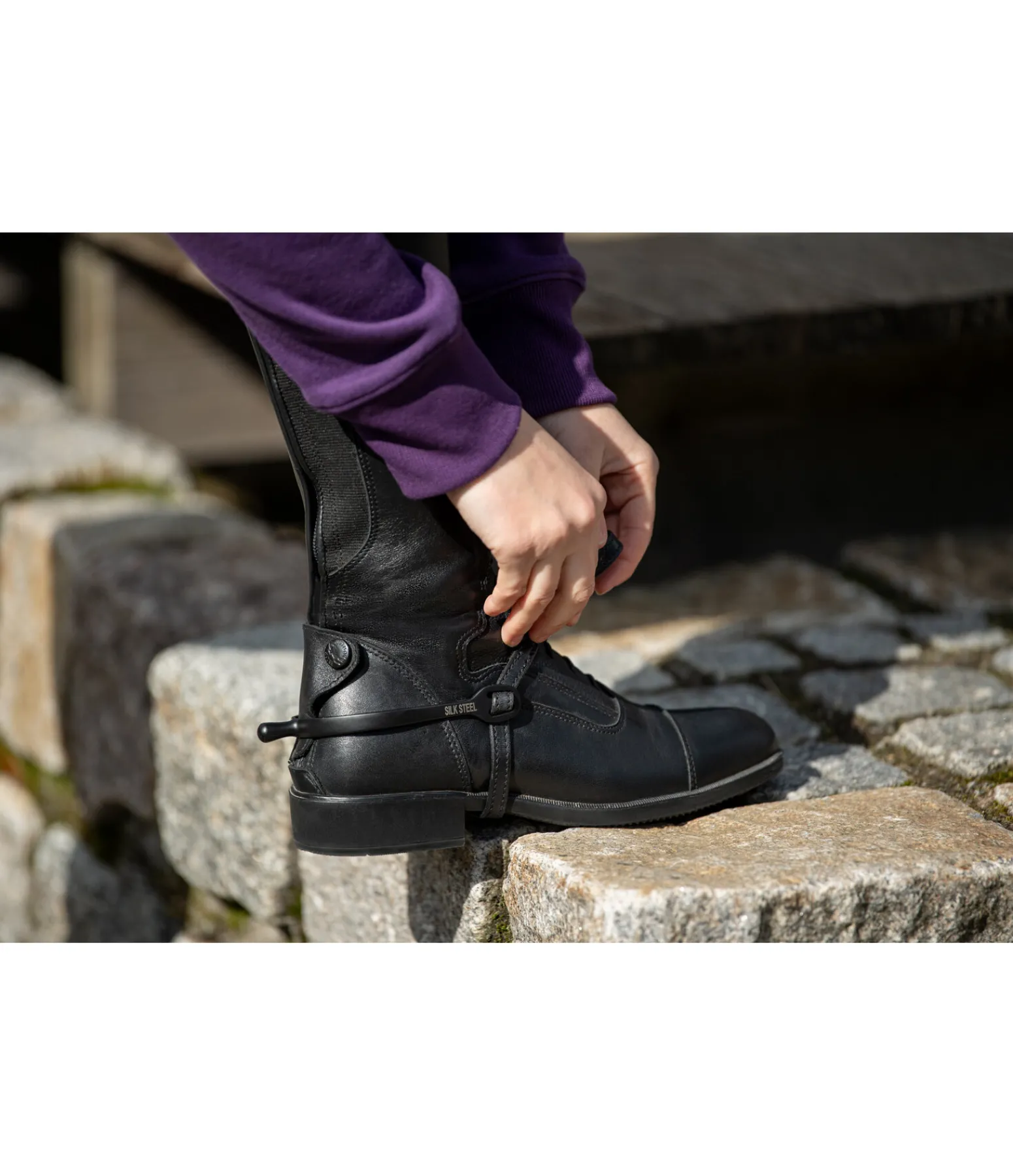 Éperons à bout rond en acier inoxydable noir mat avec logo SILK STEEL gravé. Forme améliorée des oeillets pour faciliter le passage des lanières. Longueur de tige 20 mm.