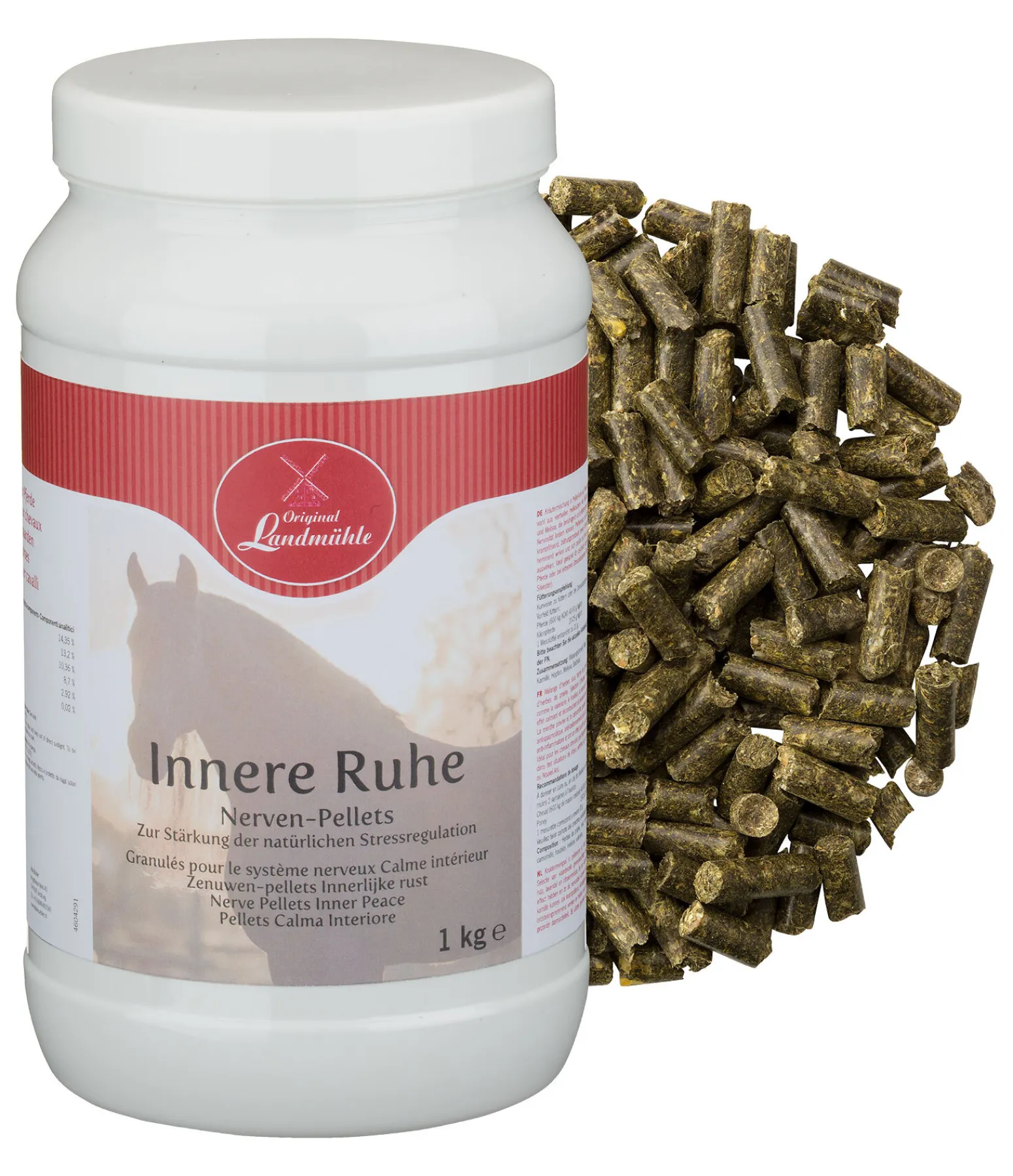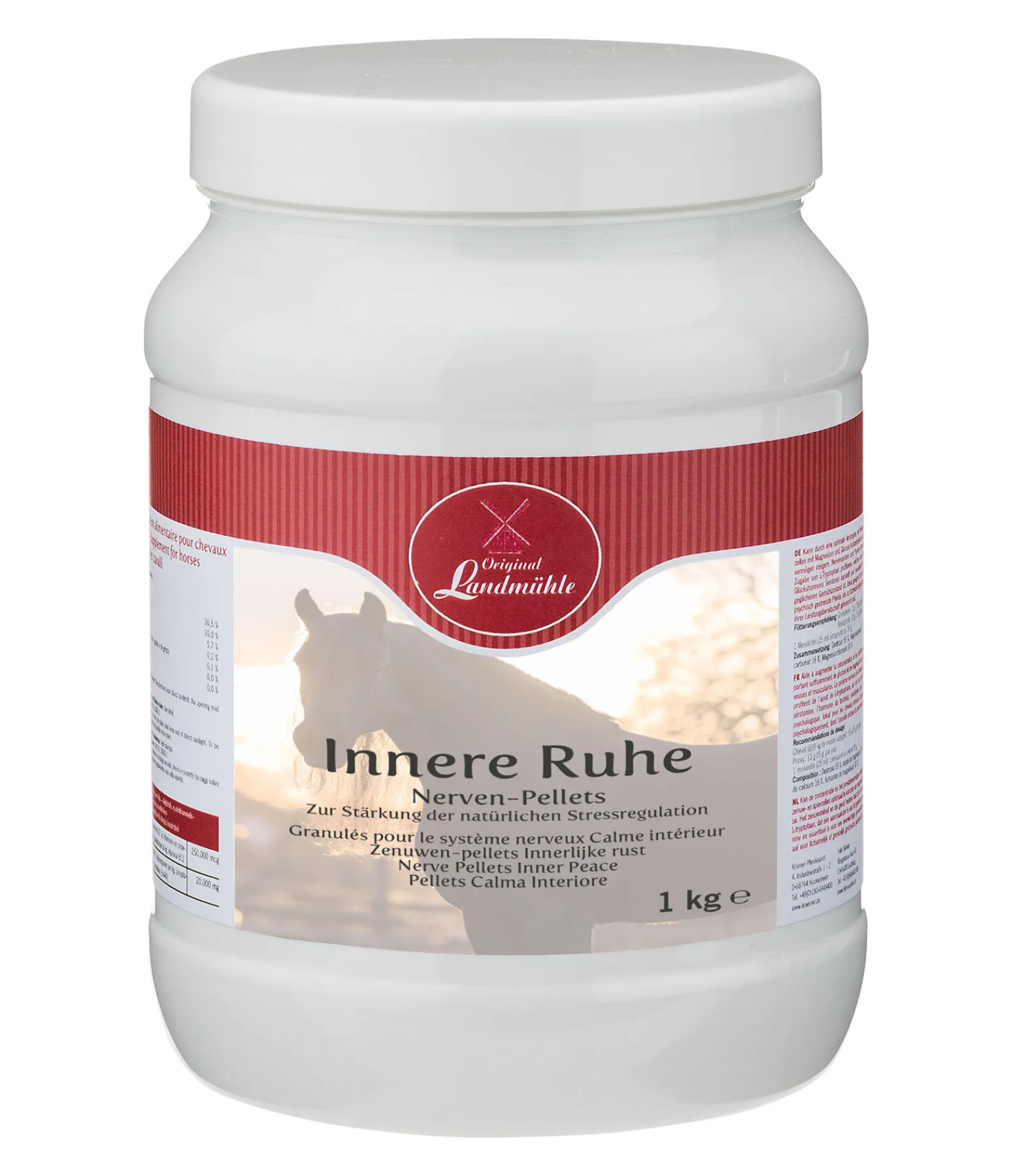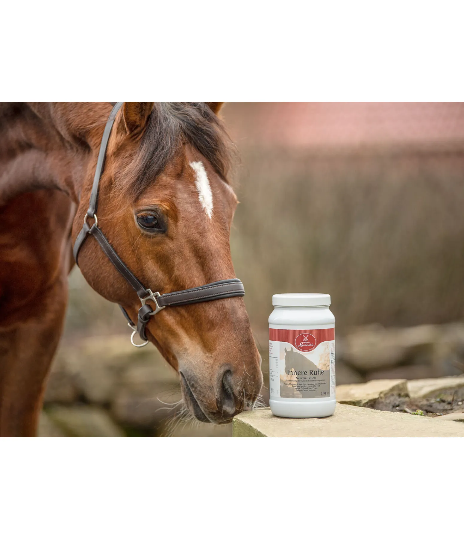 Mélange d’herbes sans mélasse. Compressé sous forme de granulés pour une acceptation optimale dans la ration et un dosage facile. À base de farine d’herbes de prairies. Contient une sélection d’herbes médicinales précieuses comme la valériane, le houblon, la lavande et la mélisse, qui ont un effet calmant et décontractant et peuvent ainsi compenser l’agitation intérieure et soulager la nervosité. Le houblon est connu pour son effet tranquillisant grâce aux acides amers de lupulon qu’il contient. Le maïs compense les teneurs élevées en protéines et constitue une source d’énergie sur le long terme, optimale pour les chevaux nerveux. La menthe poivrée et la camomille peuvent avoir quant à elle, un effet antispasmodique, anti-inflammatoire et antidouleur, permettant une activité intestinale saine. Cette combinaison permet de renforcer la régulation naturelle du stress chez le cheval ainsi que le système nerveux en général et de prévenir les coliques liées au stress. Le cheval étant un animal de fuite, l’équilibre entre tension et détente est souvent fragile. L’état d’esprit de l’animal dépend d’une multitude de facteurs. La peur et la nervosité peuvent être des comportements acquis, dépendre du caractère ou du tempérament (éventuellement aussi de la race) du cheval ou indiquer une carence ou résulter d’un surentraînement (stimulus de charge trop élevé, hyperacidité des muscles). En outre, le comportement de l’animal de fuite doit évidemment être considéré en fonction de la situation. C’est la raison pour laquelle nous recommandons de donner les granulés Calme intérieur non seulement aux chevaux stressés psychiquement et/ou physiquement, mais aussi comme supplément avant des situations de stress prévisibles, comme par exemple de longs trajets en van ou un changement d’écurie.