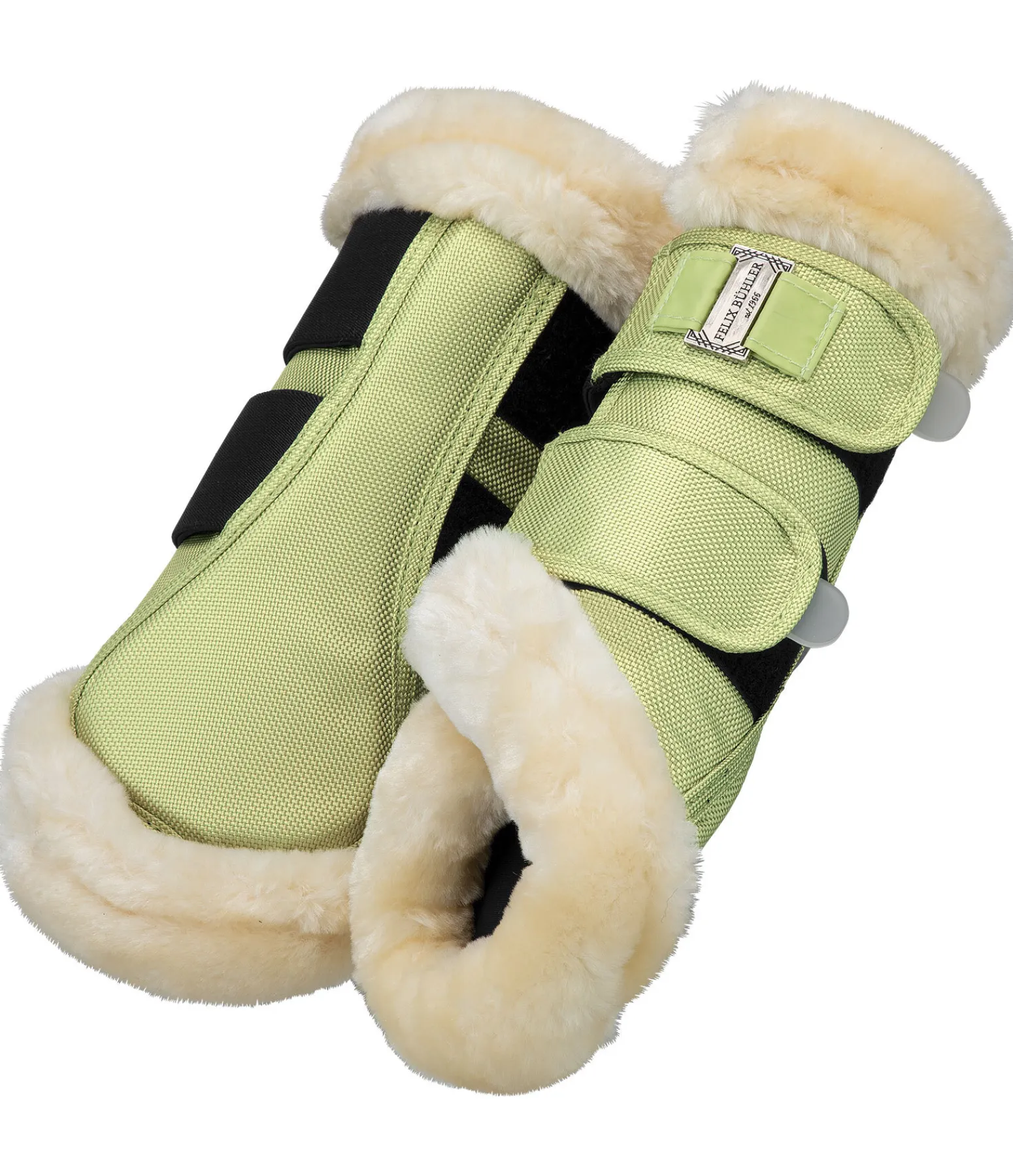 Élégantes guêtres de dressage avec bordure en polaire Teddy douce. Doublure moelleuse en caoutchouc chloroprène pour une protection optimale contre les impacts. Revêtement anti-salissures en matière résistante 600 deniers. Forme anatomique, pattes auto-agrippantes avec empiècements élastiques pour un ajustement parfait. Plaque métallique avec logo Felix Bühler. Doublure 100 % caoutchouc chloroprène, revêtement 100 % polyester. Vendues par paire.