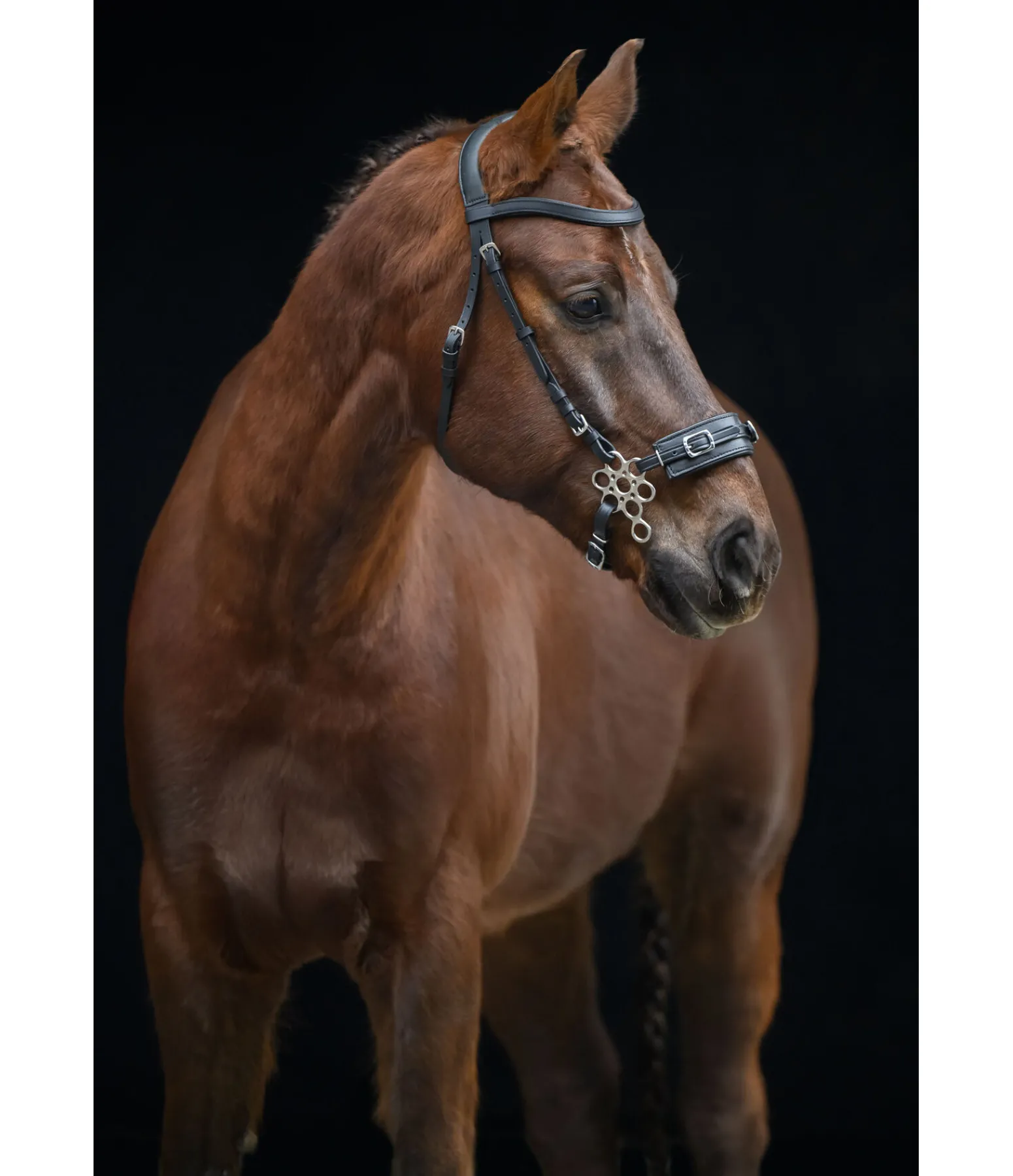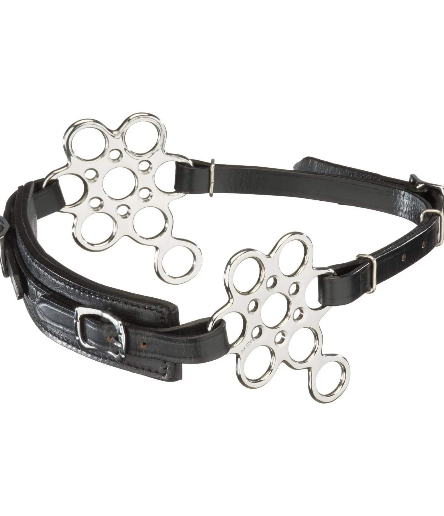 Hackamore flower pouvant être utilisé dans plusieurs positions grâce aux différents anneaux, ce qui permet d’ajuster avec précision l’effet souhaité et la force de l’effet levier. Muserolle en cuir de grande qualité. Branches en acier inoxydable. Longueur totale maximale des branches 11,5 cm.