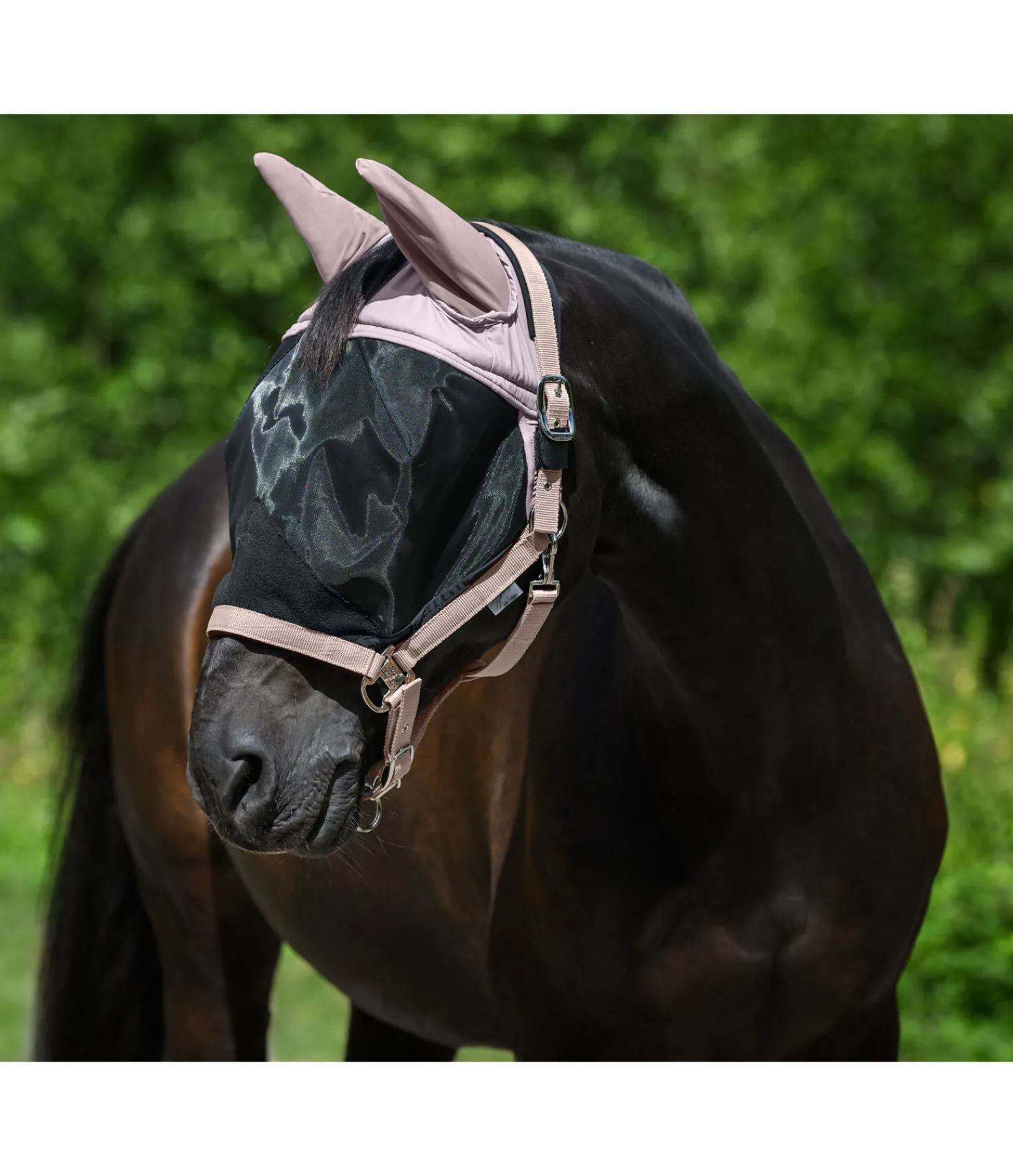 La solution idéale quand on est pressé ! Licol confortable en nylon avec doublure en caoutchouc chloroprène et masque anti-mouches intégré solidement cousu. Têtière doublement réglable et muserolle réglable pour un ajustement optimal. Filet à maille fine bloquant au moins 50 % des rayons UV tout en offrant une bonne visibilité. Doublure intérieure douce au niveau du frontal du masque. Tissu mesh respirant de couleur assortie. Licol 100 % polypropylène, doublure 100 % caoutchouc chloroprène, masque 100 % polyester.