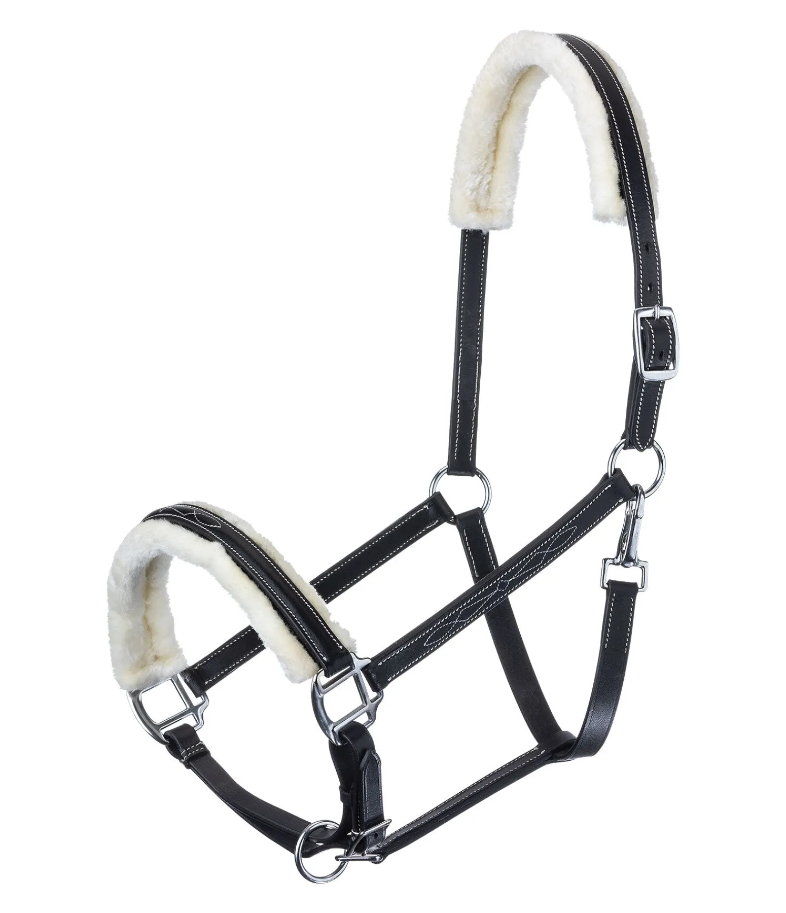 Licol en cuir véritable. Têtière et muserolle doublées en polaire Teddy douce et amovible grâce à une patte auto-agrippante. Motifs surpiqués de couleur contrastante sur la muserolle et les montants. Taille facilement réglable par boucles au niveau de la têtière et de la muserolle. Bouclerie argentée dans la couleur SS et dorée dans la couleur DB. Cuir véritable.