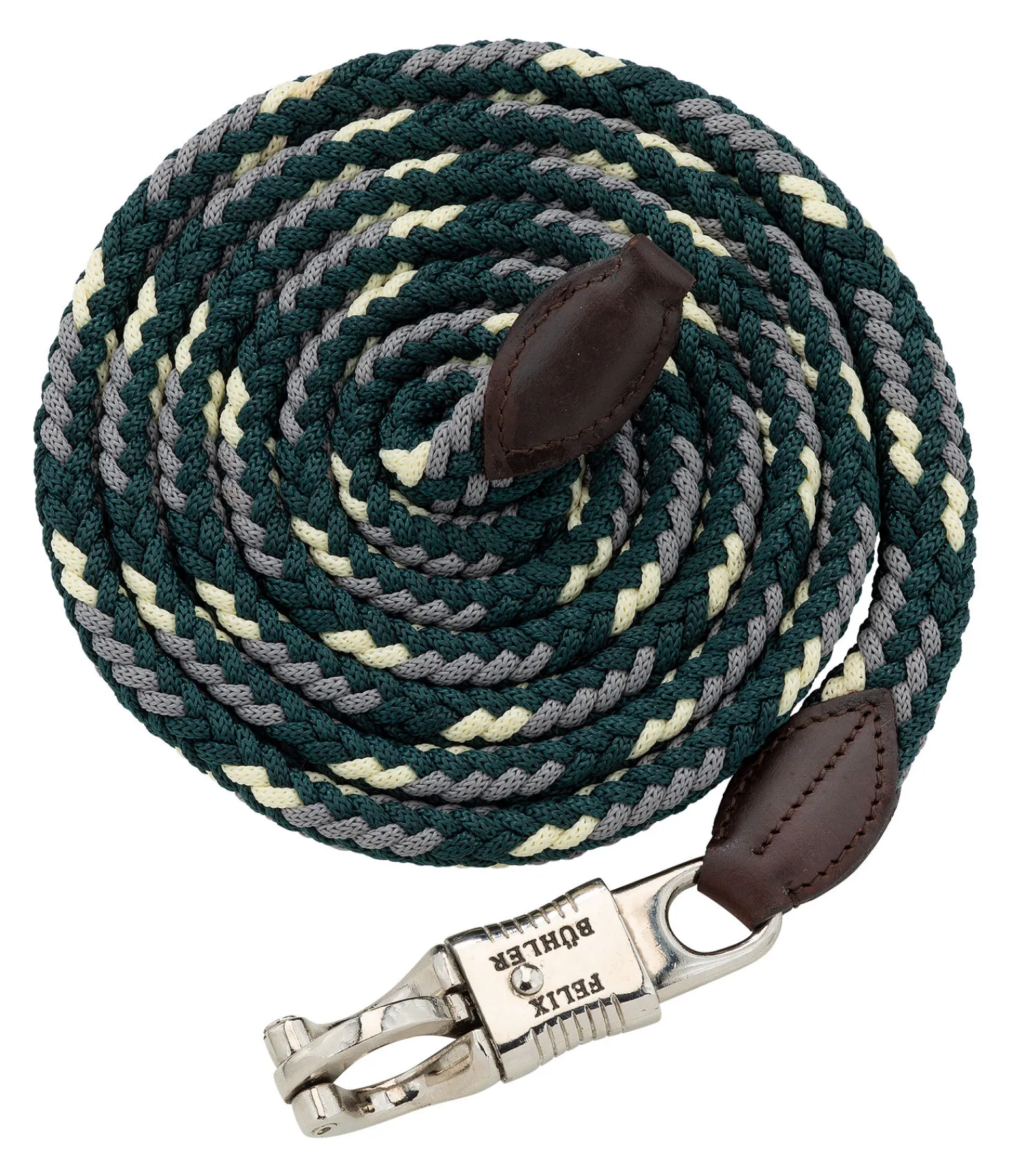 Longe tressée très résistante avec élégants embouts en cuir et mousqueton anti-panique. Assortie au licol 310040. Bouclerie argentée. 2 m. 100 % polypropylène.