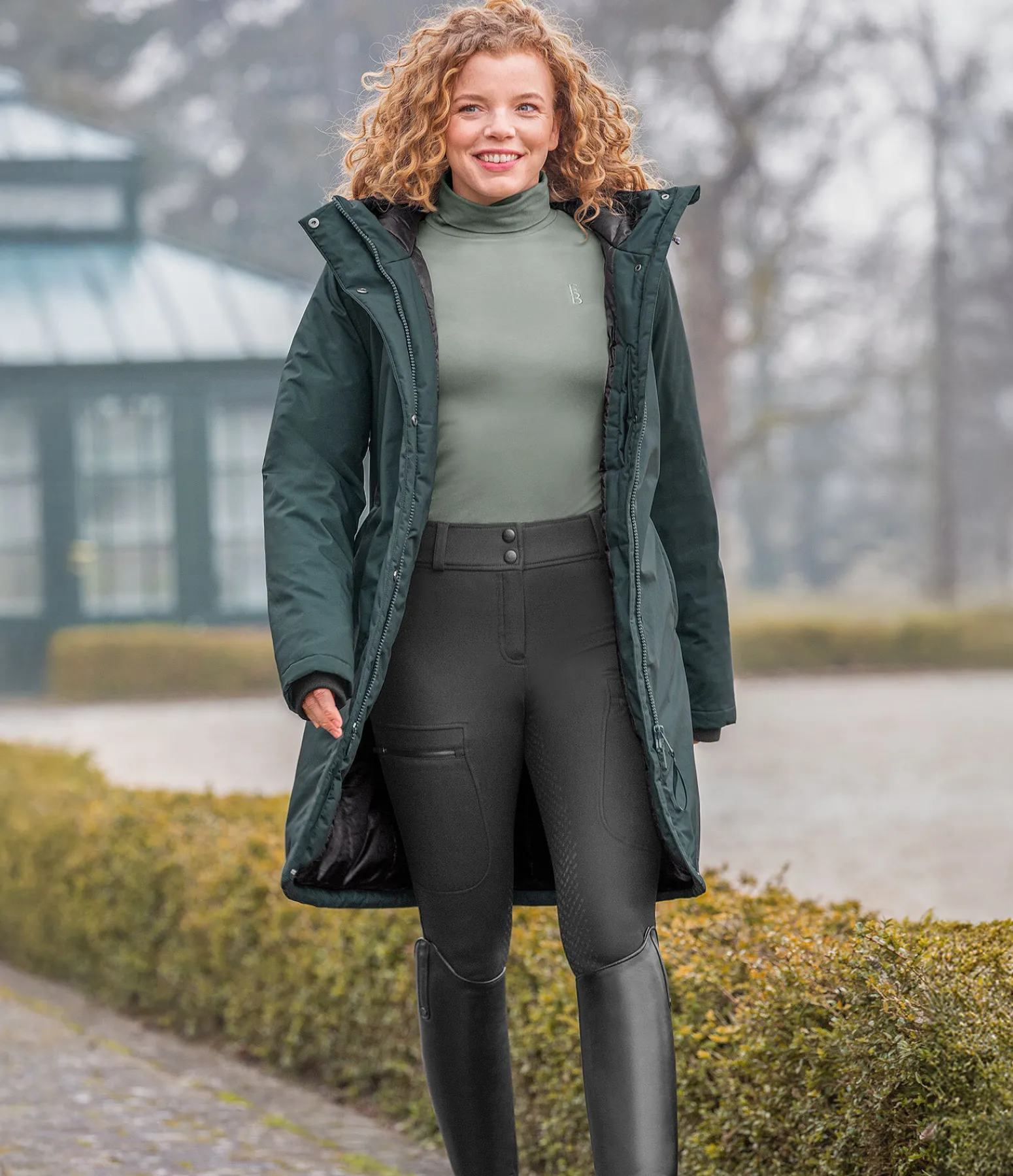 Manteau d’équitation d’hiver long. Particulièrement chaud. Col montant. Large capuche réglable, en partie repliable, avec système de fixation dans le dos. Matière imperméable (10.000 mm), coupe-vent et respirante (5.000 MVTR). Garnissage imitation duvet. Finition en bord-côte sur le bas des manches. Deux poches latérales zippées dissimulées et une poche intérieure. Fermeture à glissière double sens dissimulée avec protège-menton. Une fente cavalière zippée à l’arrière. Motifs gaufrés discrets à l’intérieur. Badge Felix Bühler sur la manche. 100 % polyester.