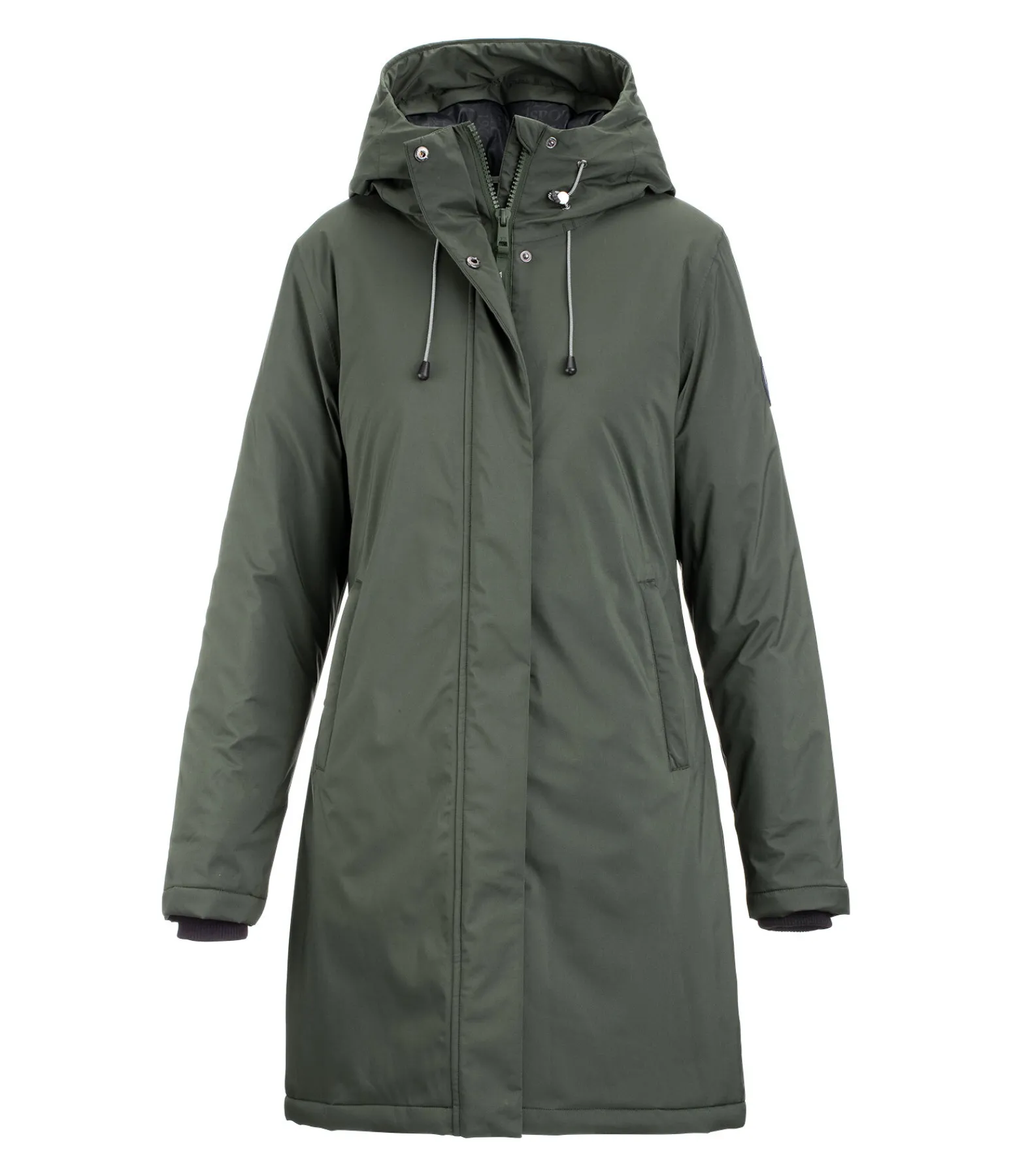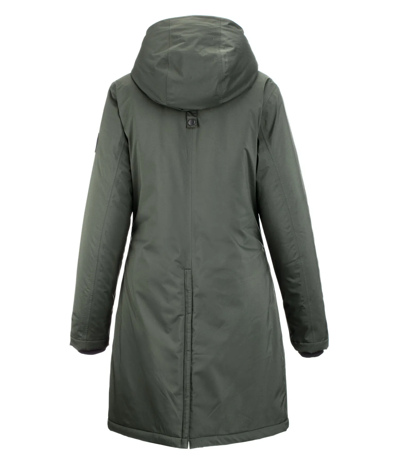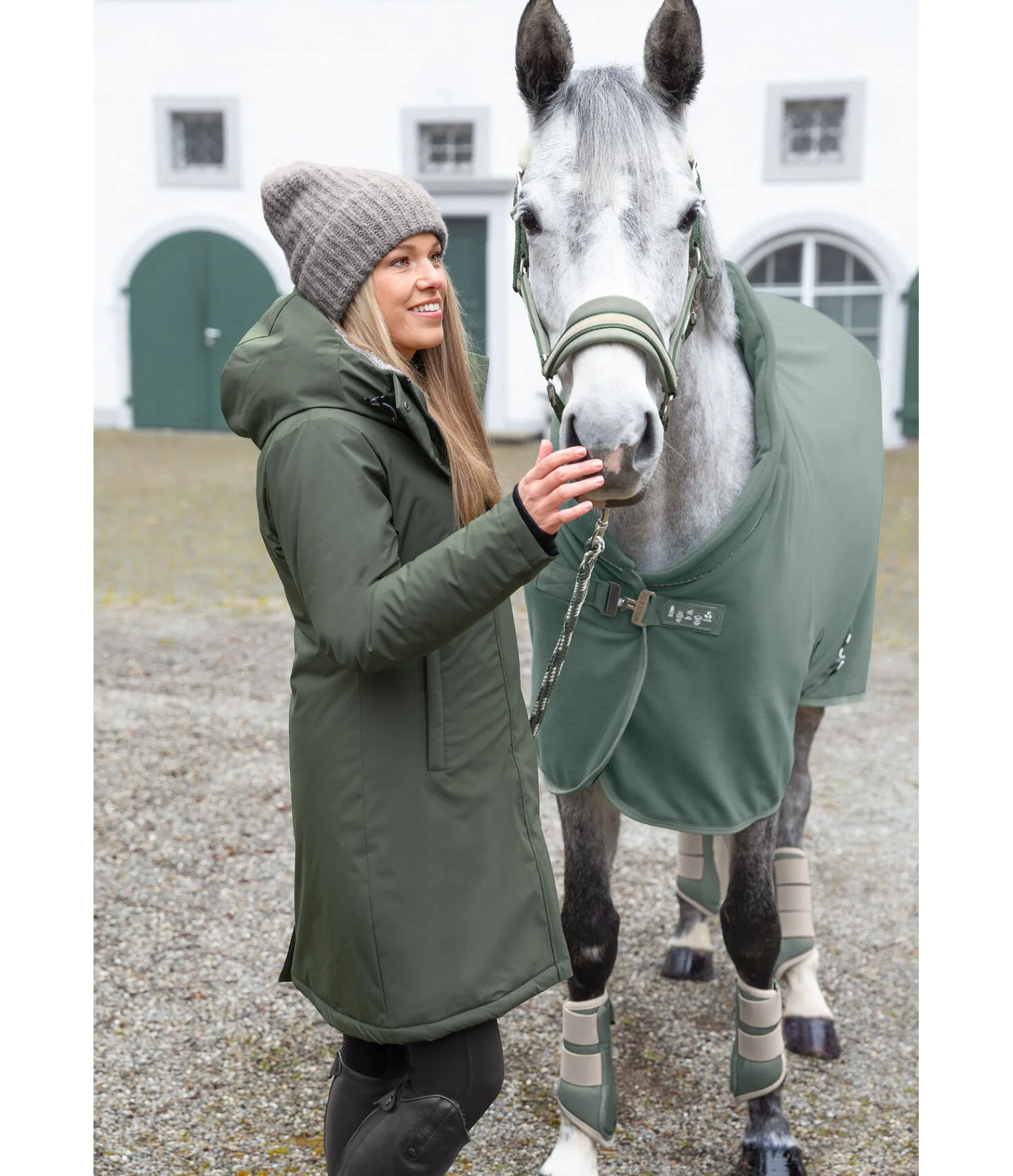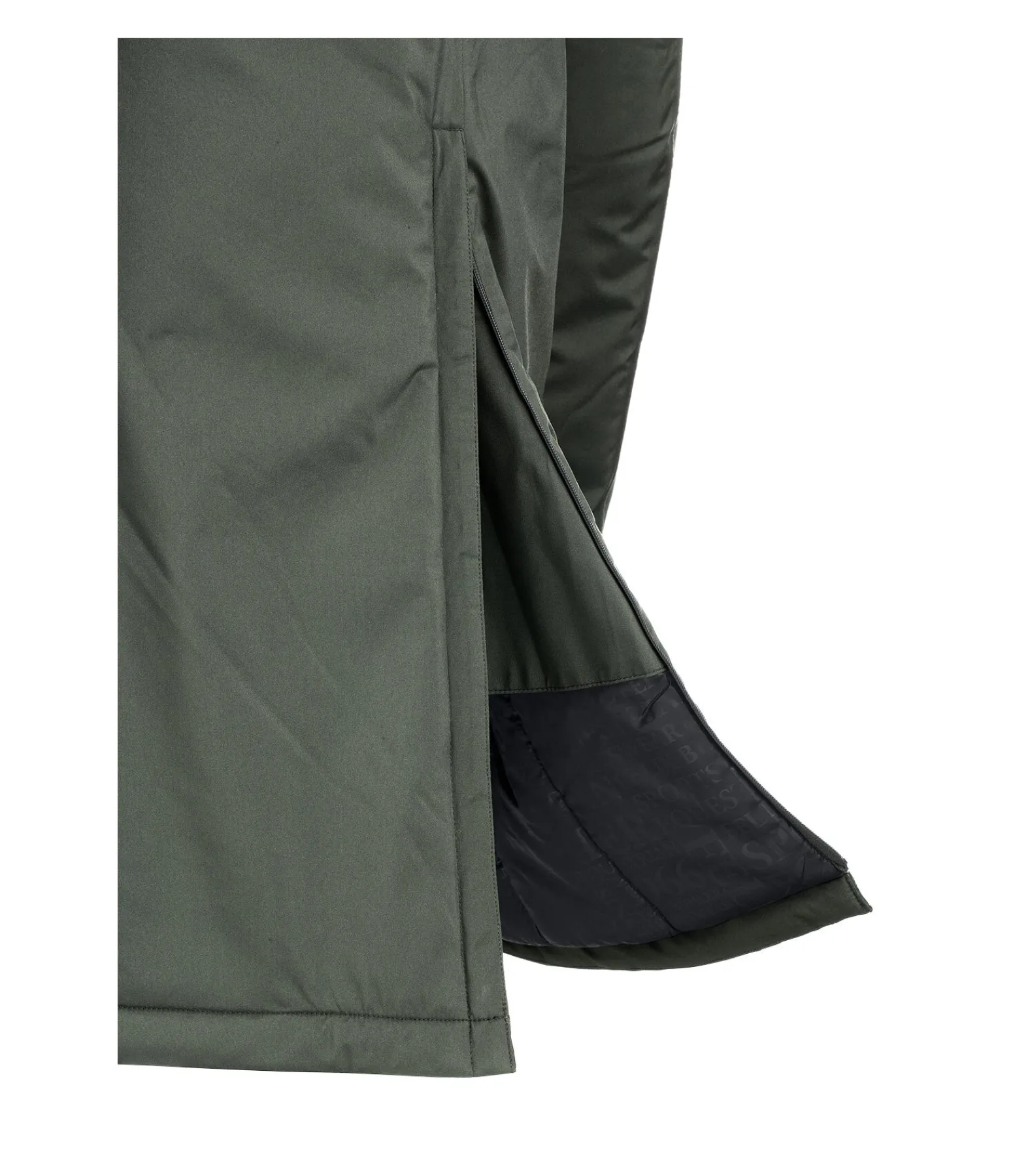Manteau d’équitation d’hiver long. Particulièrement chaud. Col montant. Large capuche réglable, en partie repliable, avec système de fixation dans le dos. Matière imperméable (10.000 mm), coupe-vent et respirante (5.000 MVTR). Garnissage imitation duvet. Finition en bord-côte sur le bas des manches. Deux poches latérales zippées dissimulées et une poche intérieure. Fermeture à glissière double sens dissimulée avec protège-menton. Une fente cavalière zippée à l’arrière. Motifs gaufrés discrets à l’intérieur. Badge Felix Bühler sur la manche. 100 % polyester.