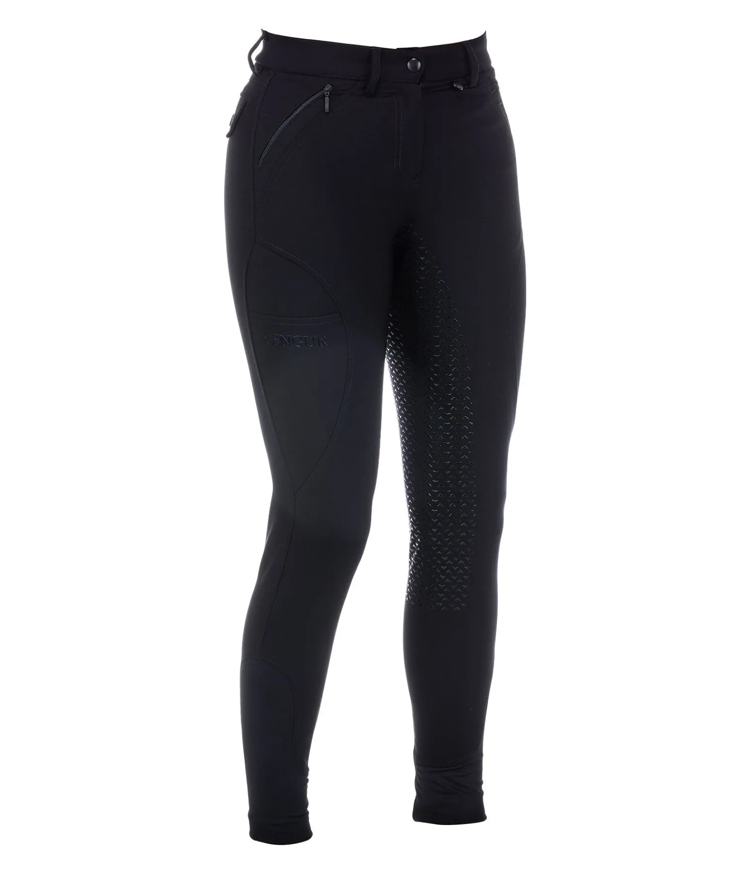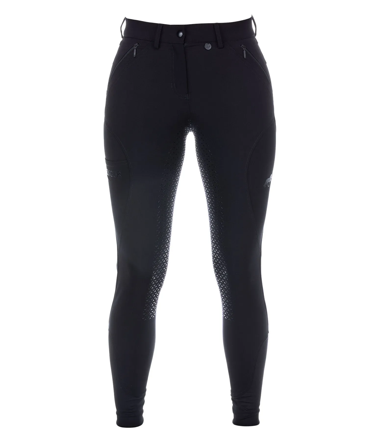 Pantalon d’équitation avec fond intégral grip en silicone pour un bon maintien en selle. Matière stretch extensible dans 4 directions, déperlante, respirante. Séchage rapide. 1 poche sur la cuisse pour téléphone portable.2 poches avant zippées. Ceinture élastiquée avec passants. Bas de jambe extensible en stretch. 96 % polyester et 4 % élasthanne.