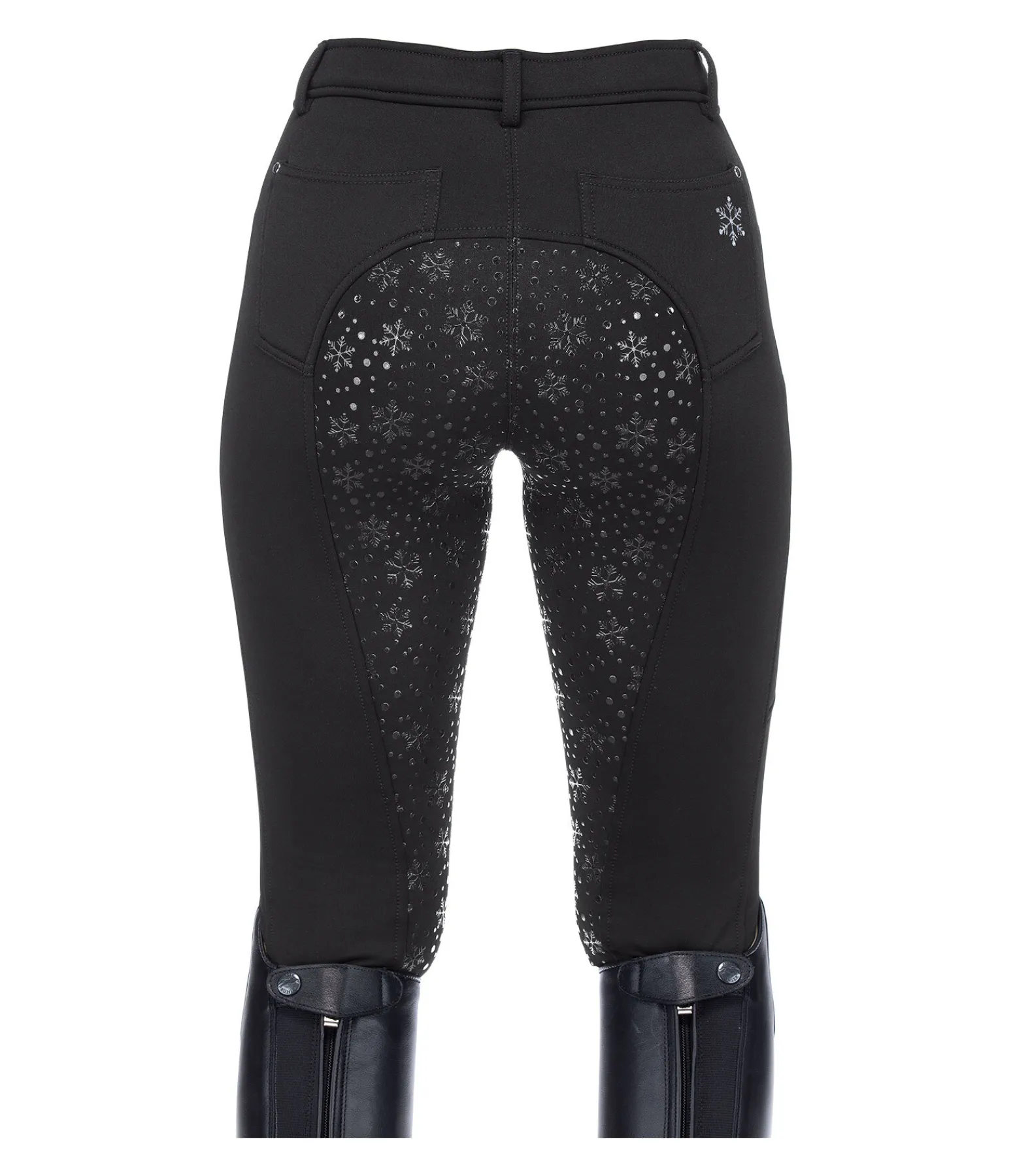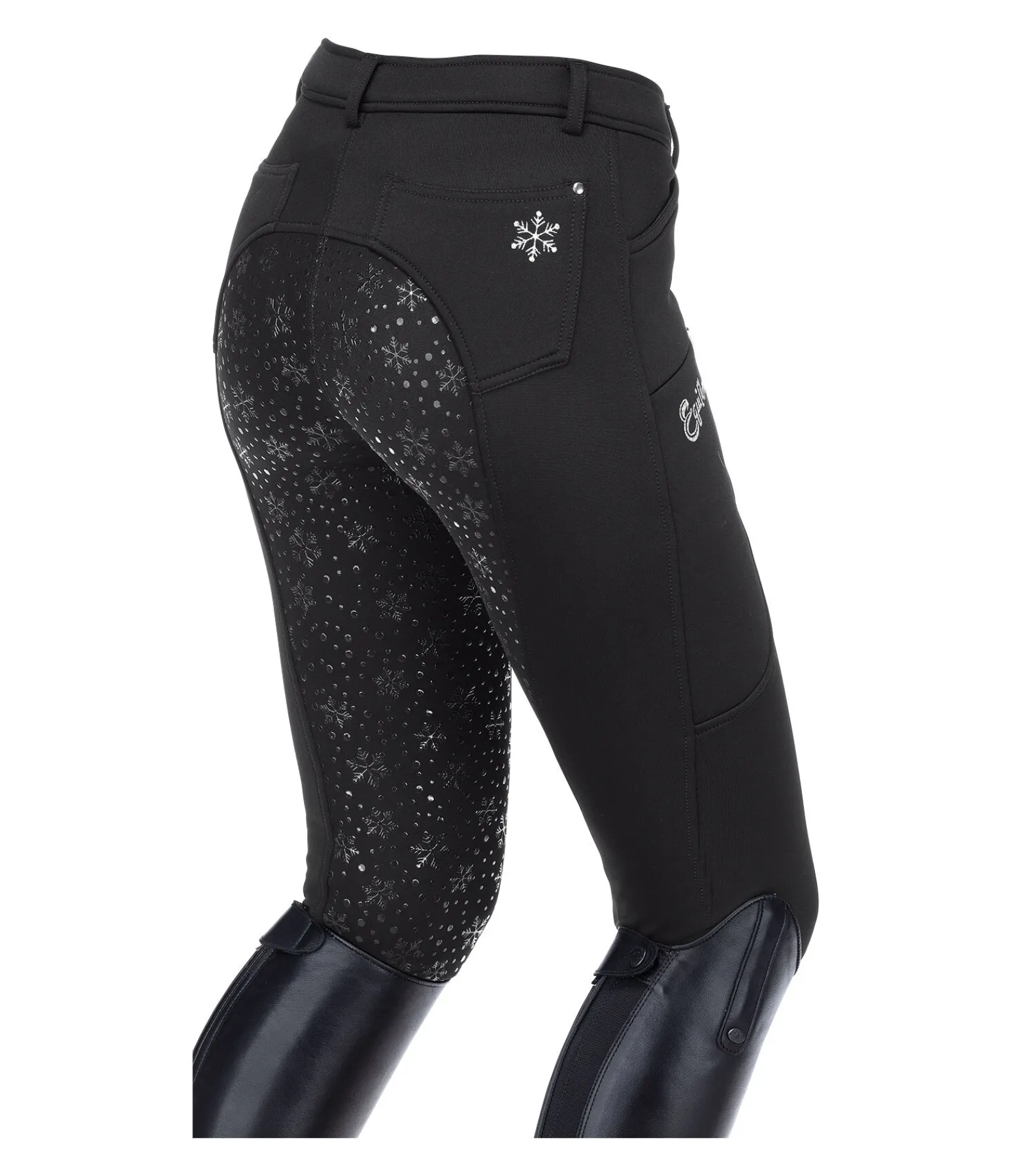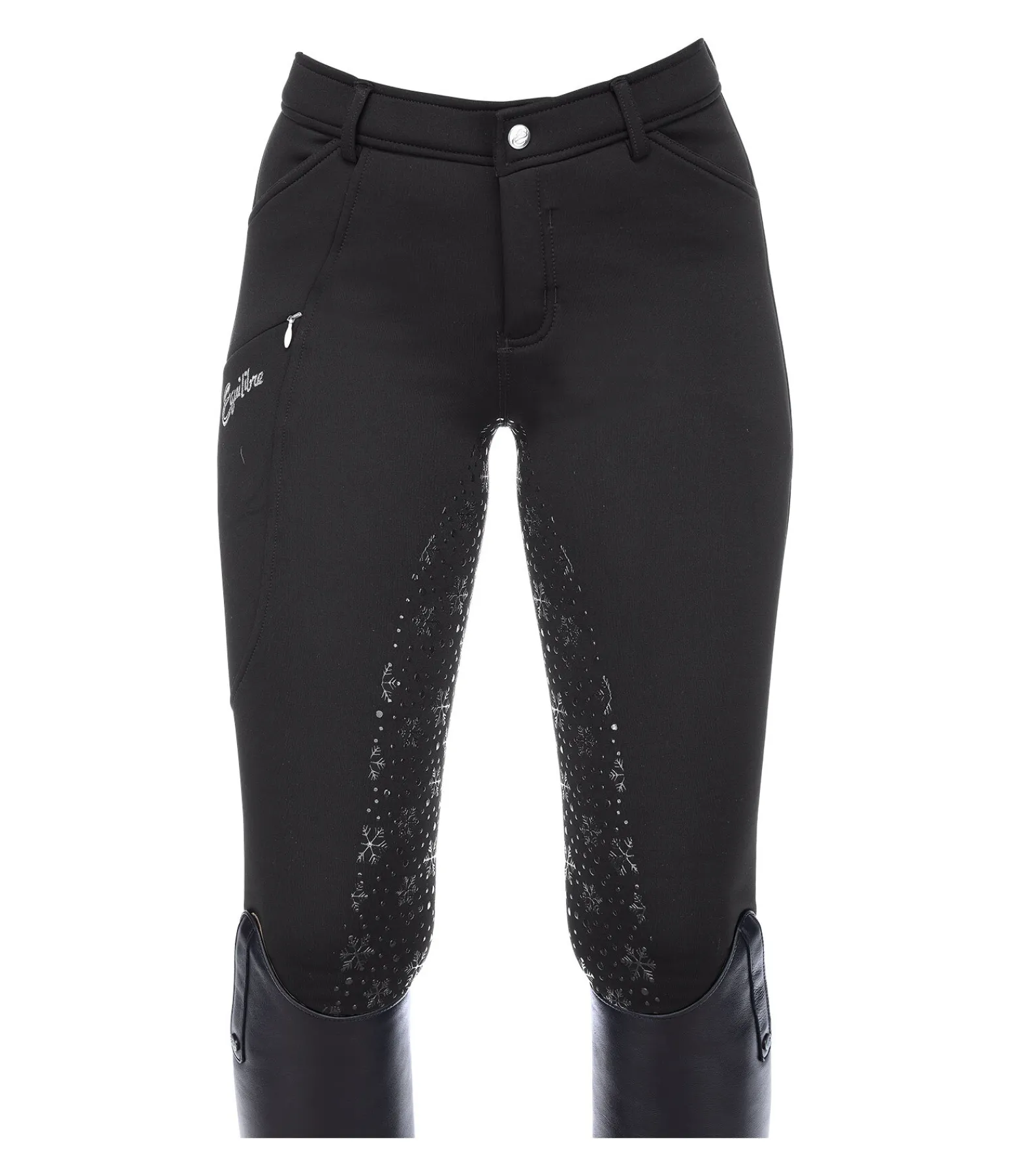 Pantalon d’équitation hiver chaud à fond intégral grip en silicone avec motif flocon de neige. Intérieur molletonné. Bas de jambe extensible. Matière stretch respirante et extensible dans 4 directions. 1 poche zippée sur la cuisse pour téléphone portable avec imprimé Equilibre, 2 poches avant et 2 poches arrière. Ceinture élastiquée avec passants. Joli flocon de neige imprimé sur la poche arrière. 60 % polyester, 33 % polyamide, 7 % élasthanne.
