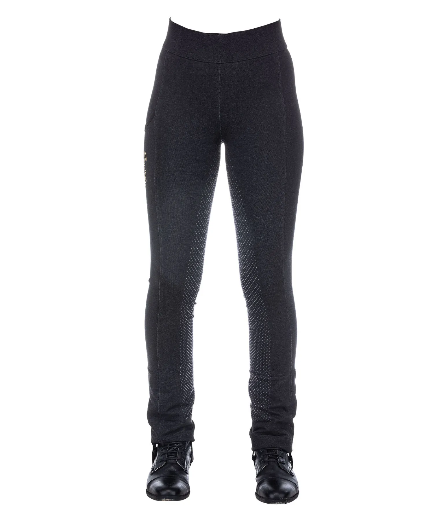 Pantalon d’équitation jodhpur à fond intégral grip en silicone. Une poche latérale pour téléphone portable avec logo imprimé et une poche arrière zippée avec jolie broderie discrète. Ceinture élastiquée. Bas de jambe évasé. 72 % coton, 22 % polyamide et 6 % élasthanne.