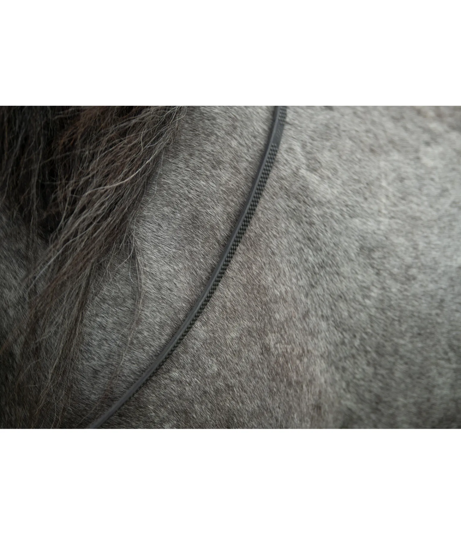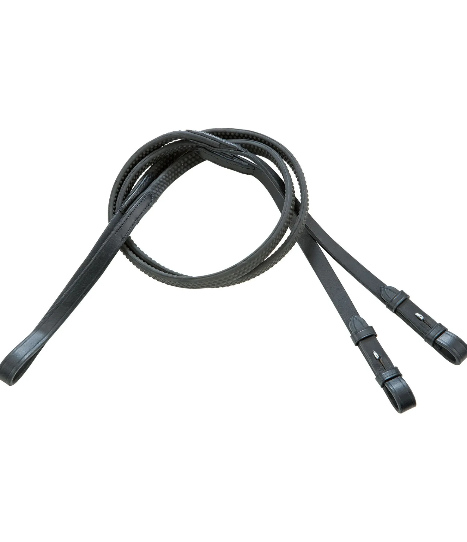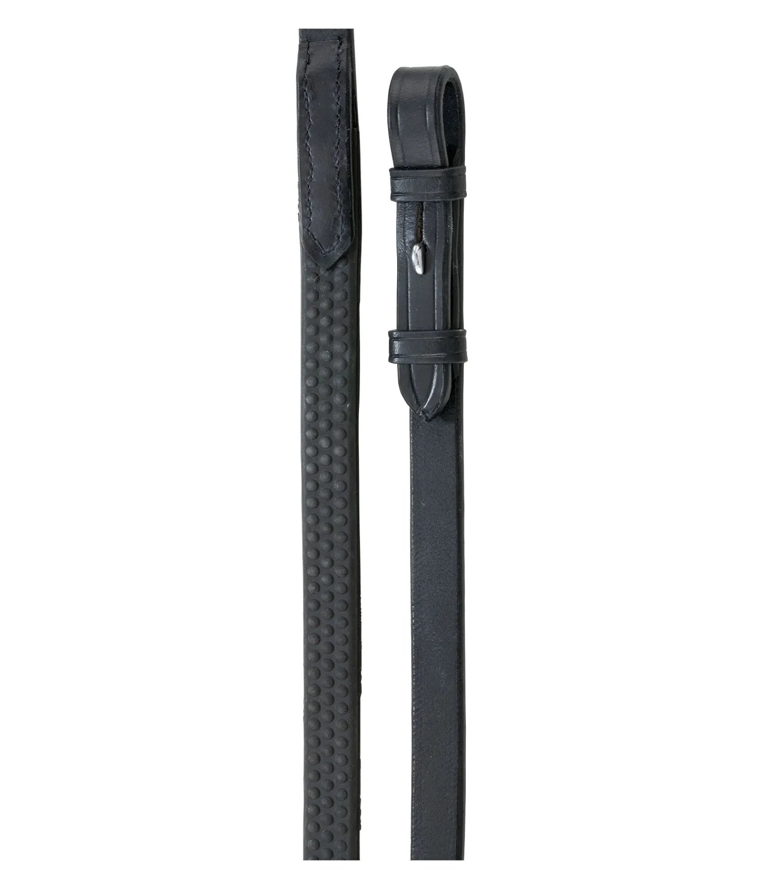 Rênes en caoutchouc avec picots pour une adhérence maximale. Les porte-mors permettent un contact doux avec le mors. Longueur 235 cm.